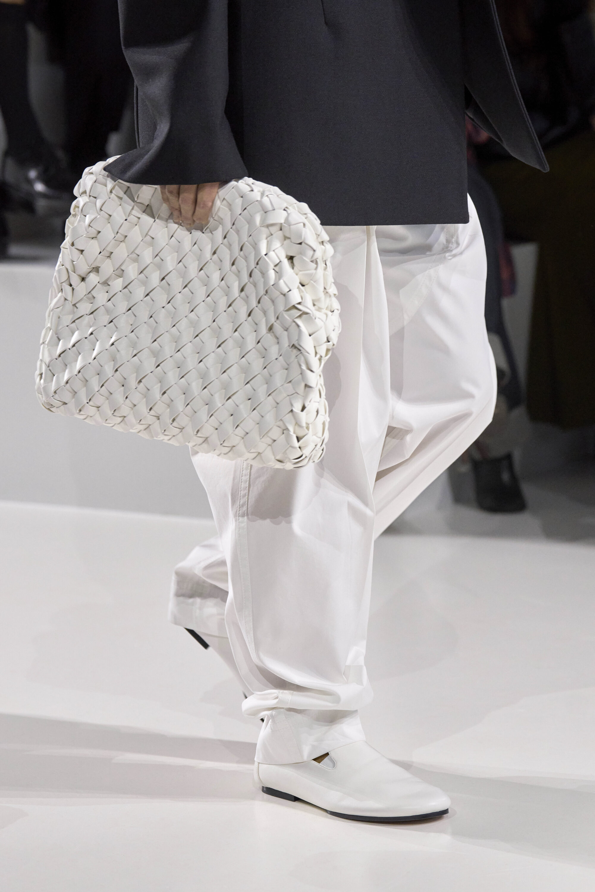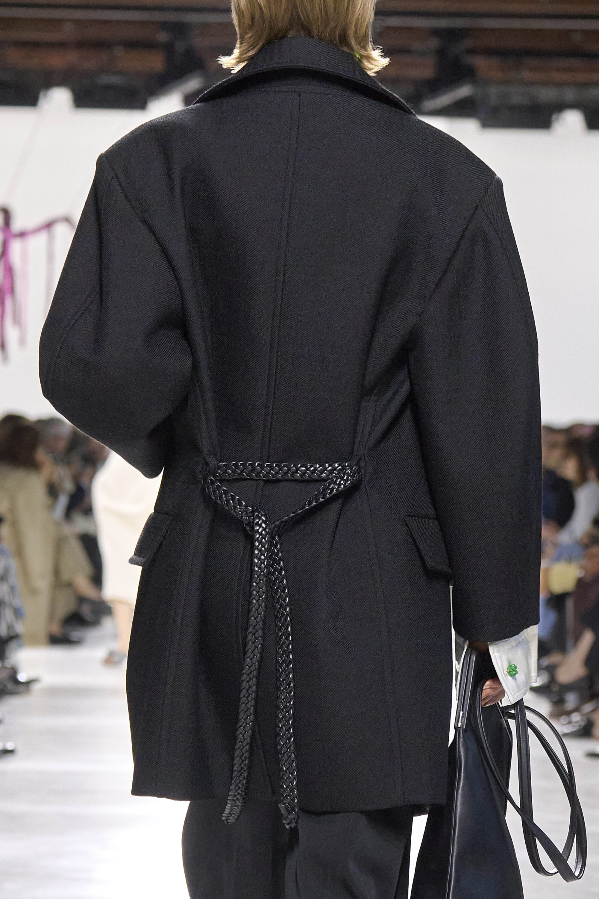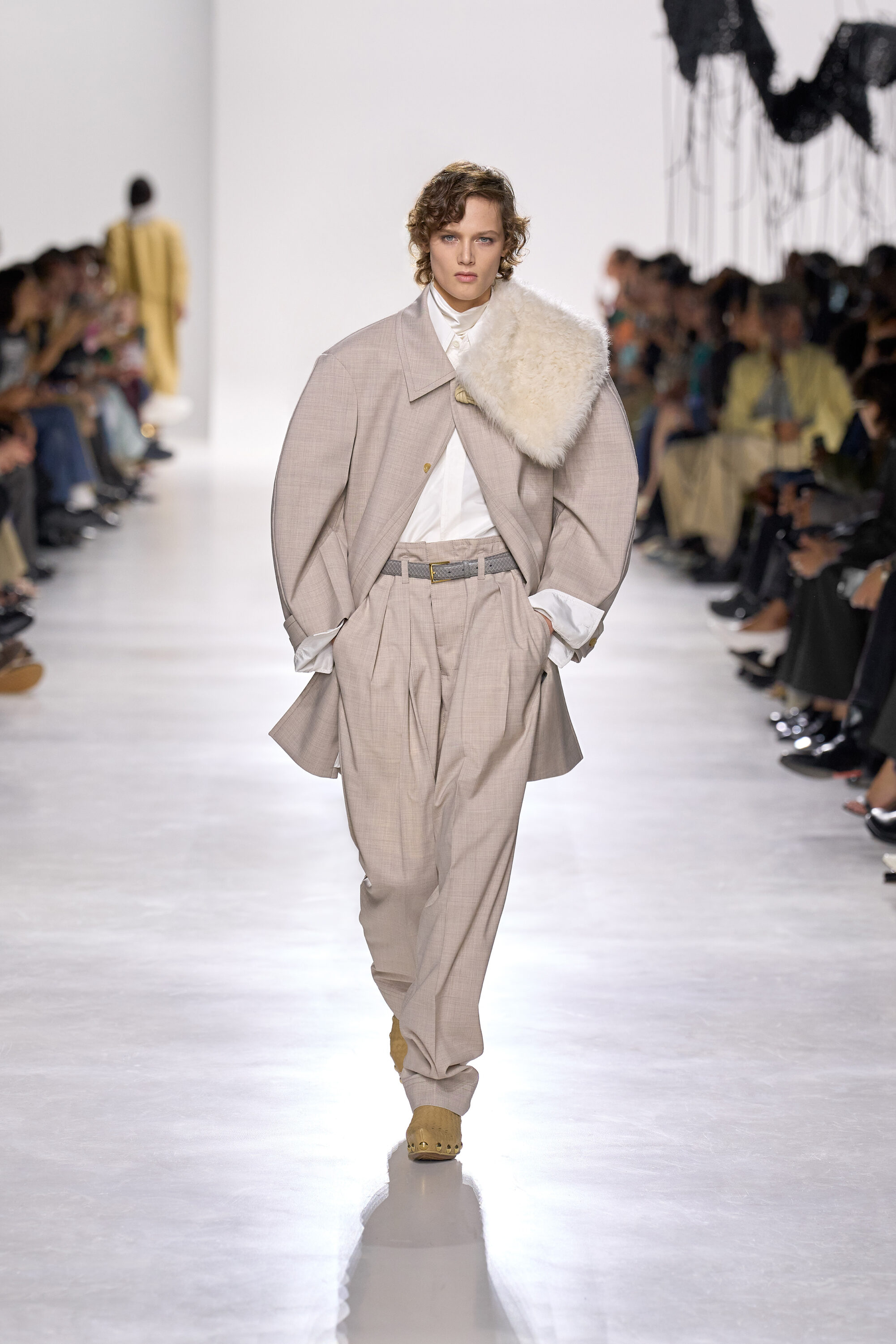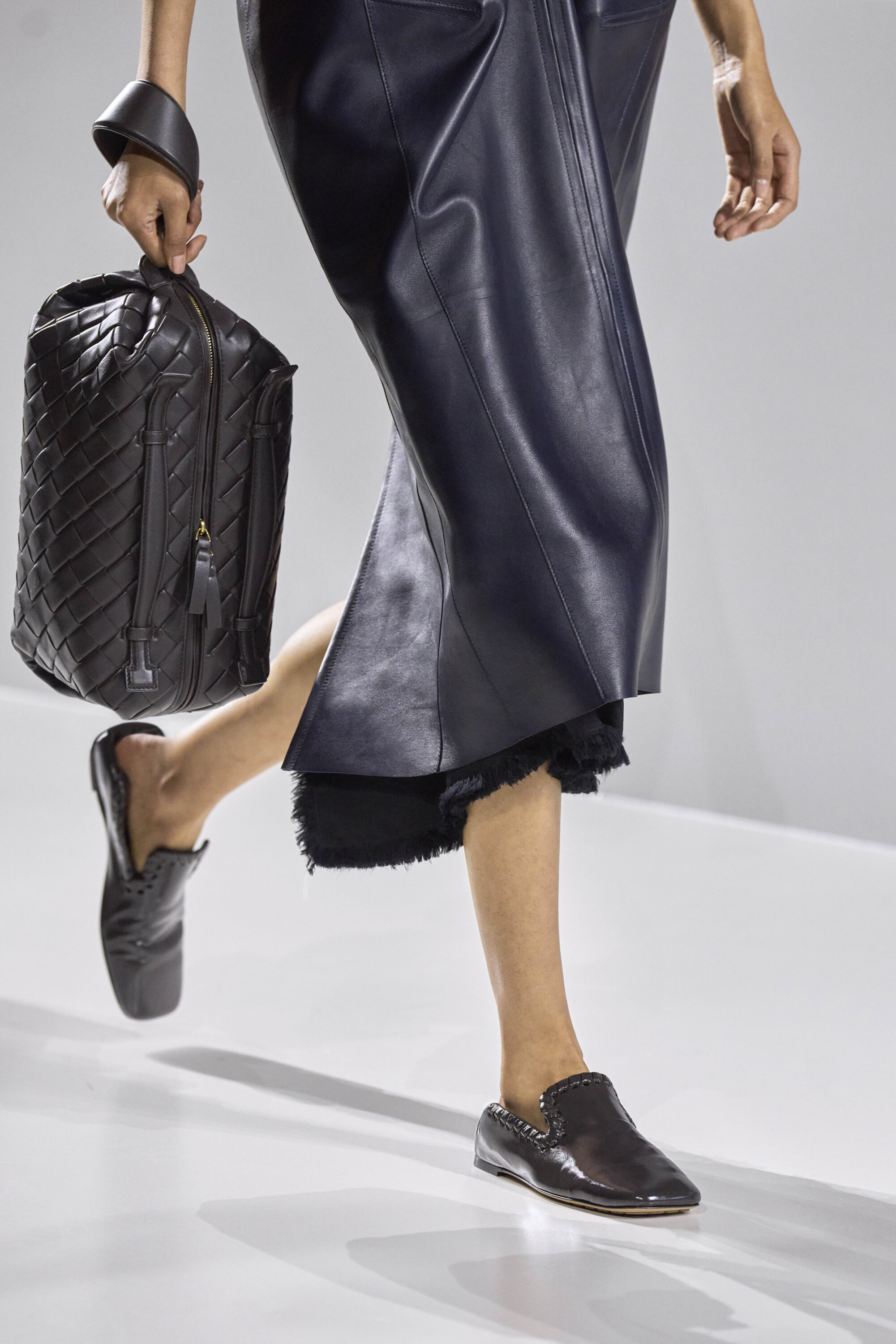 系列貫穿著 Intrecciato 編織元素,從領口取代鈕扣的編結細節,到包款、鞋履乃至配飾,甚至回收再製玻璃纖維製成的假皮草,都在傳統工藝與當代美學間遊走,她讓經典 9 毫米、12 毫米的皮革織條以全新比例回歸,並透過解構與重塑,使工藝不再只屬於手袋,而是成為衣櫥語言的一部分。