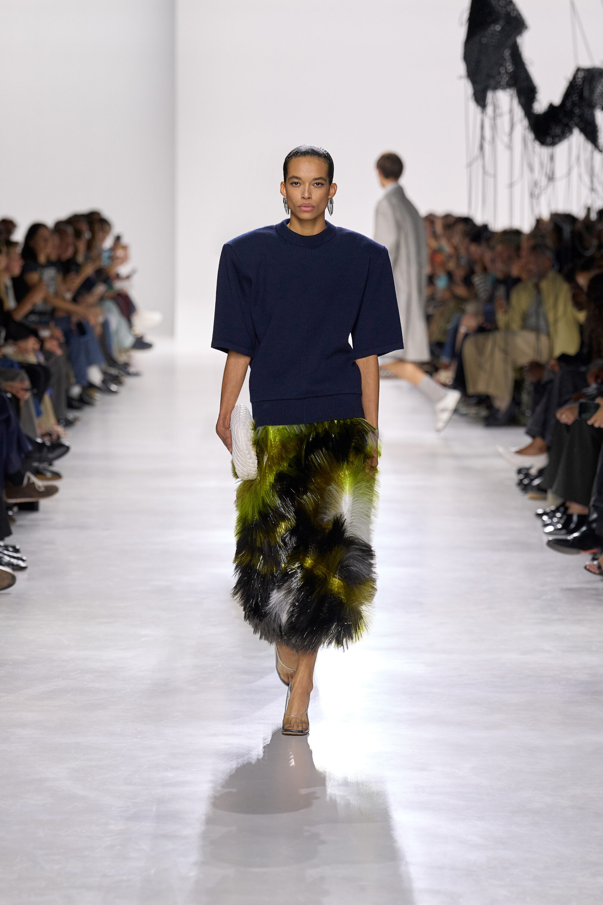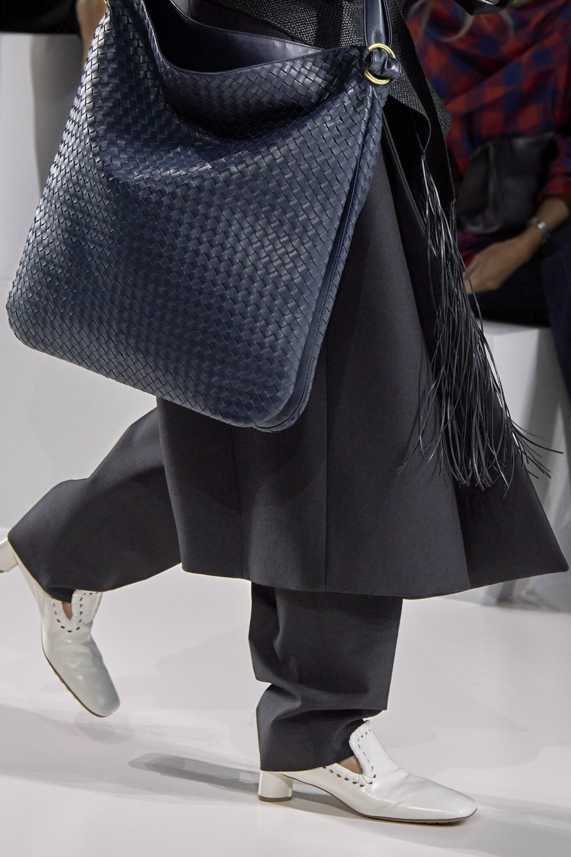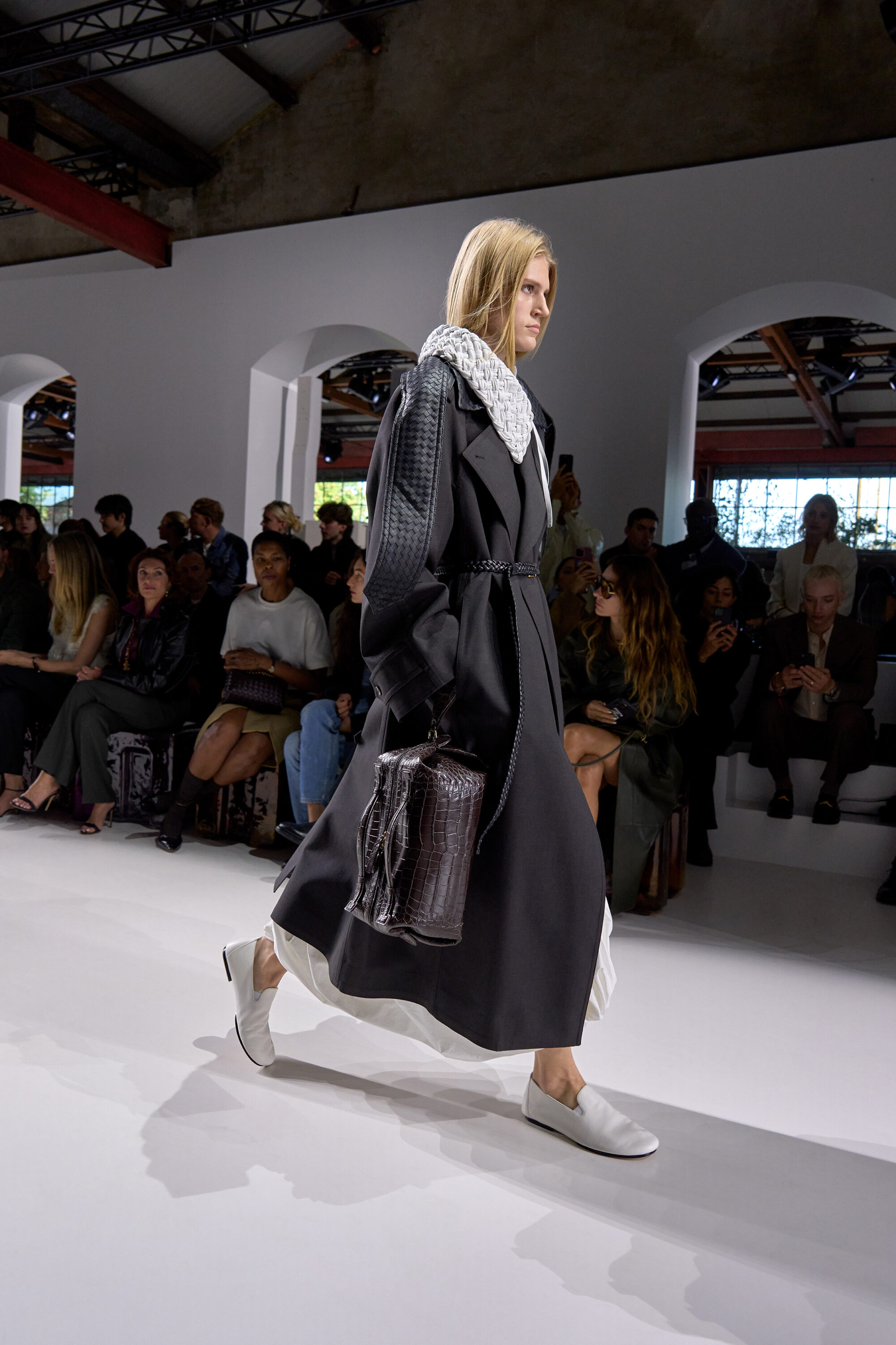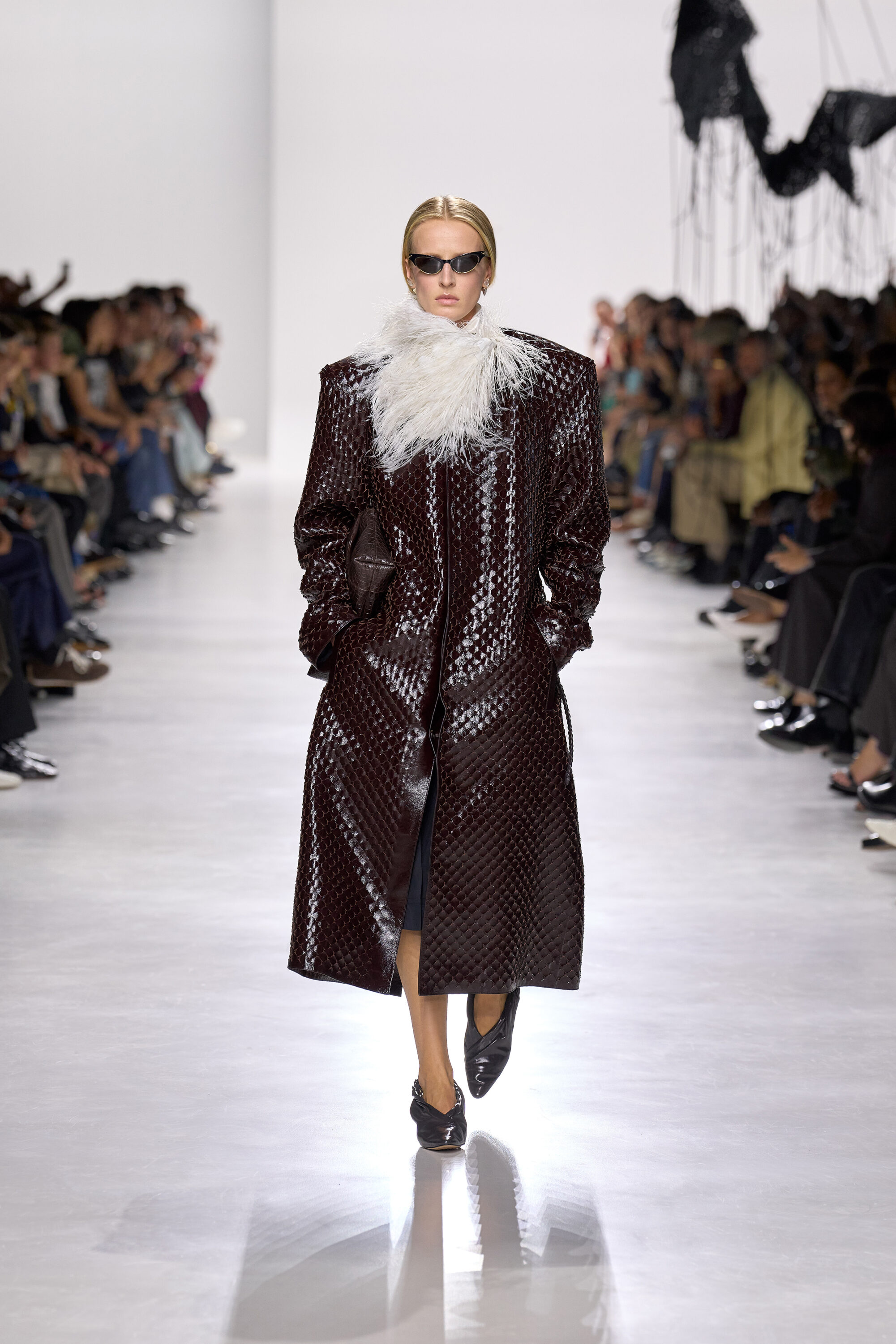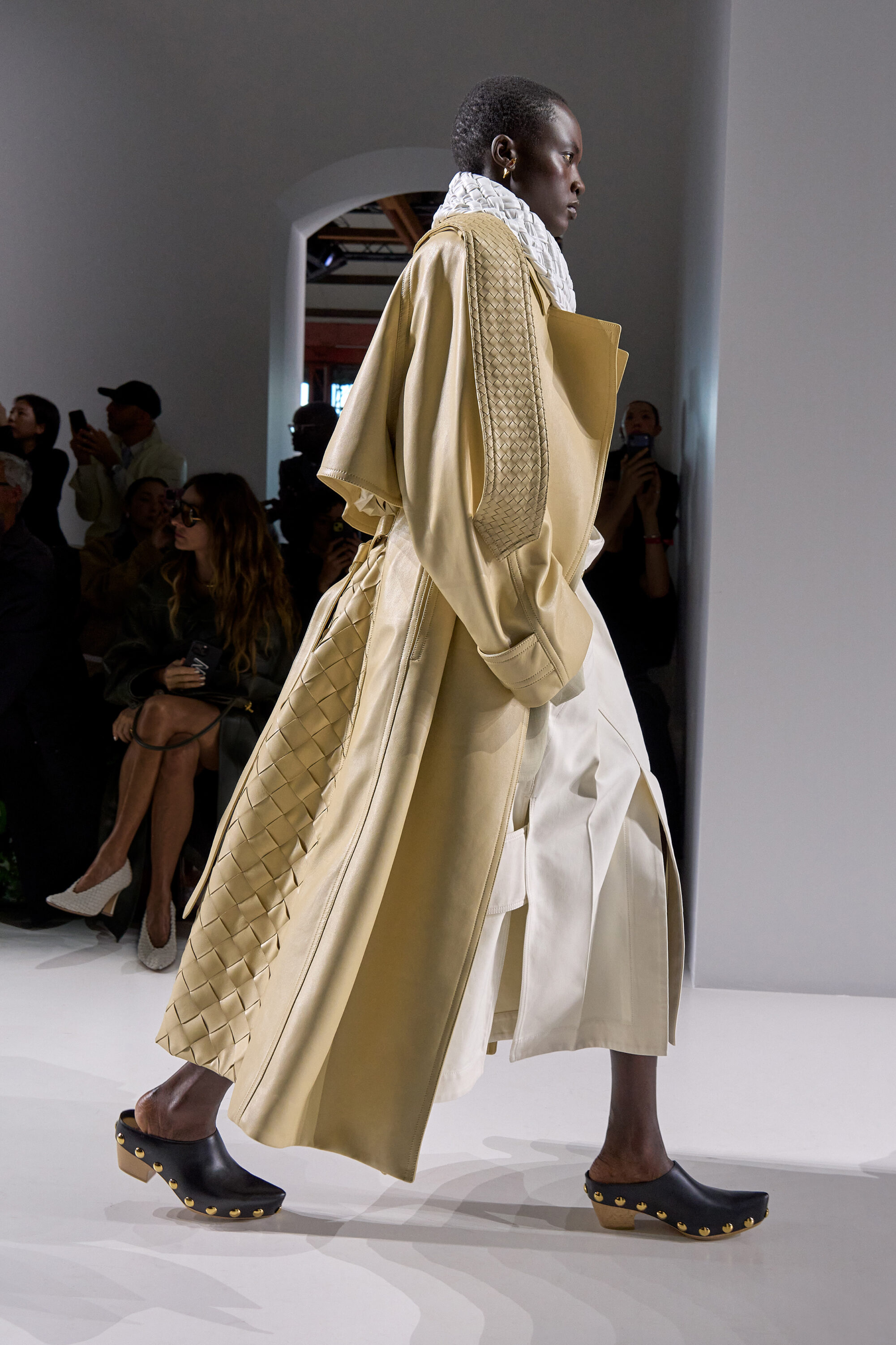 系列貫穿著 Intrecciato 編織元素,從領口取代鈕扣的編結細節,到包款、鞋履乃至配飾,甚至回收再製玻璃纖維製成的假皮草,都在傳統工藝與當代美學間遊走,她讓經典 9 毫米、12 毫米的皮革織條以全新比例回歸,並透過解構與重塑,使工藝不再只屬於手袋,而是成為衣櫥語言的一部分。