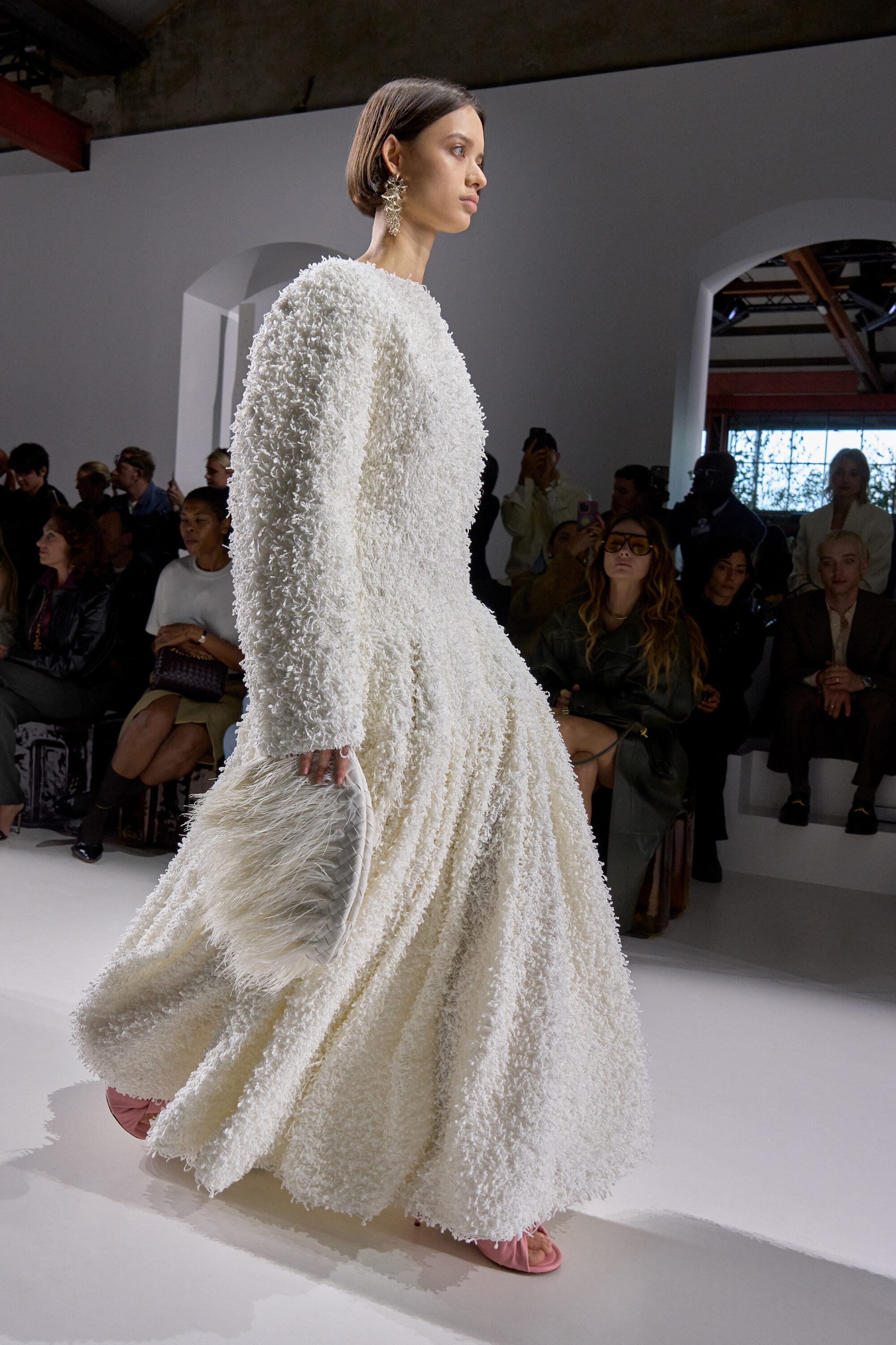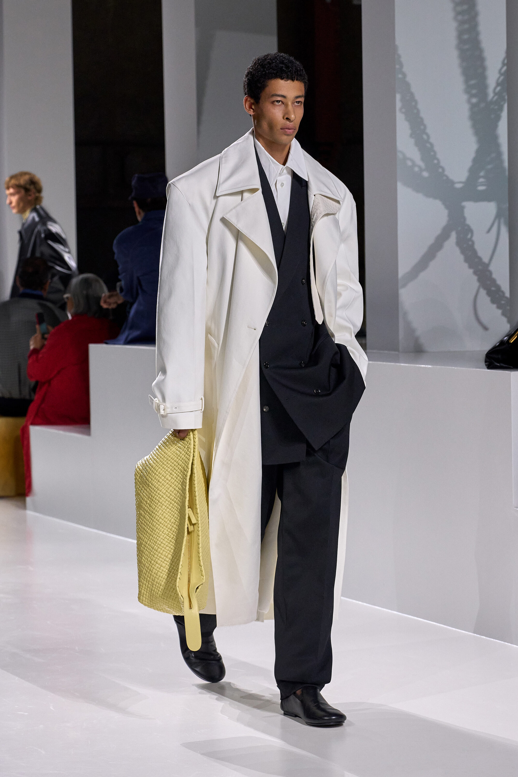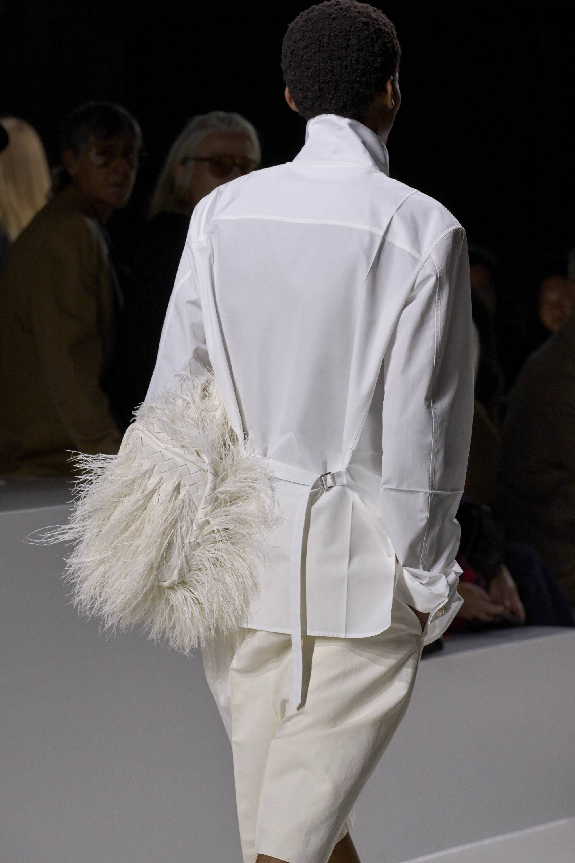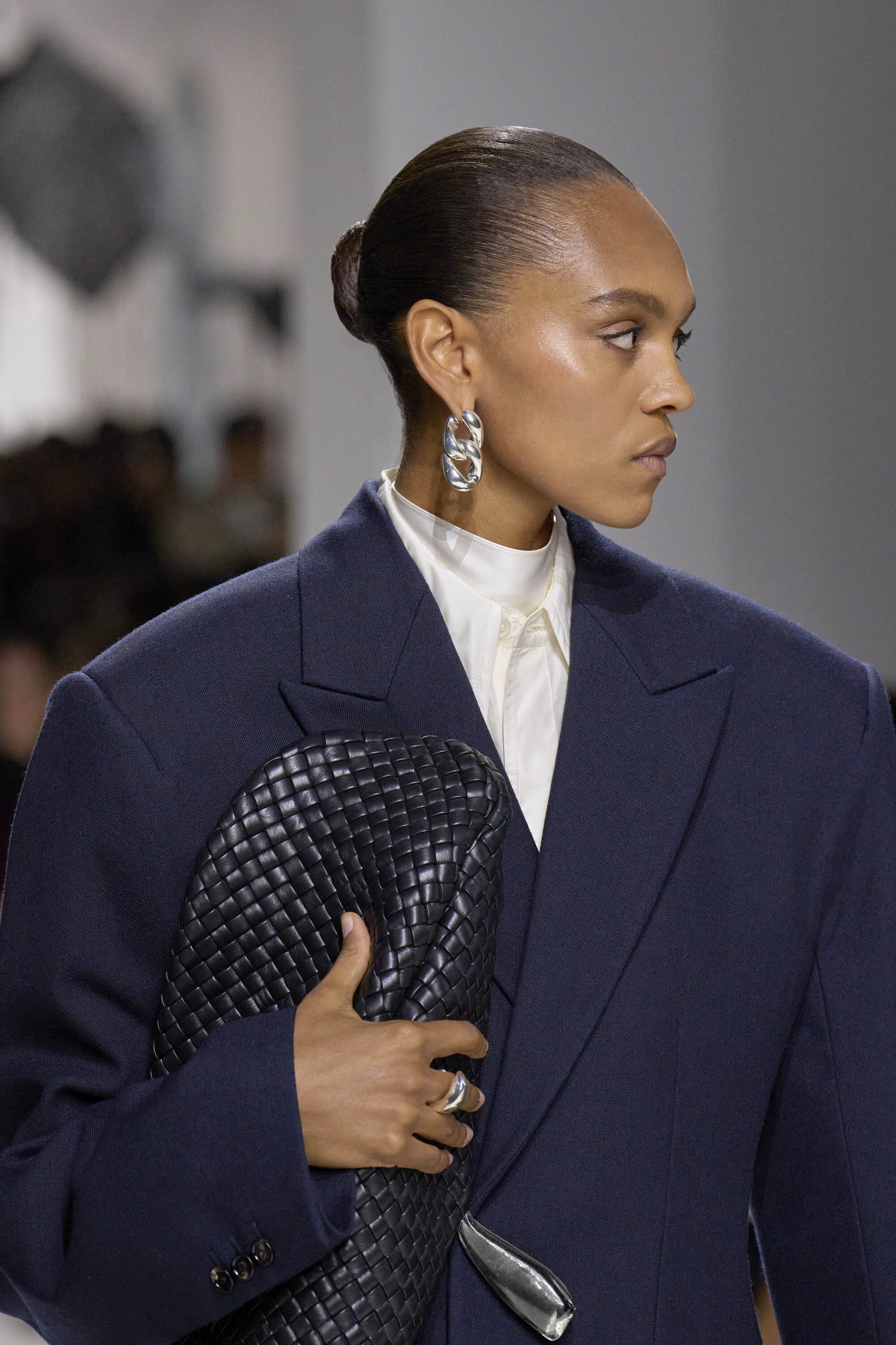 系列貫穿著 Intrecciato 編織元素,從領口取代鈕扣的編結細節,到包款、鞋履乃至配飾,甚至回收再製玻璃纖維製成的假皮草,都在傳統工藝與當代美學間遊走,她讓經典 9 毫米、12 毫米的皮革織條以全新比例回歸,並透過解構與重塑,使工藝不再只屬於手袋,而是成為衣櫥語言的一部分。