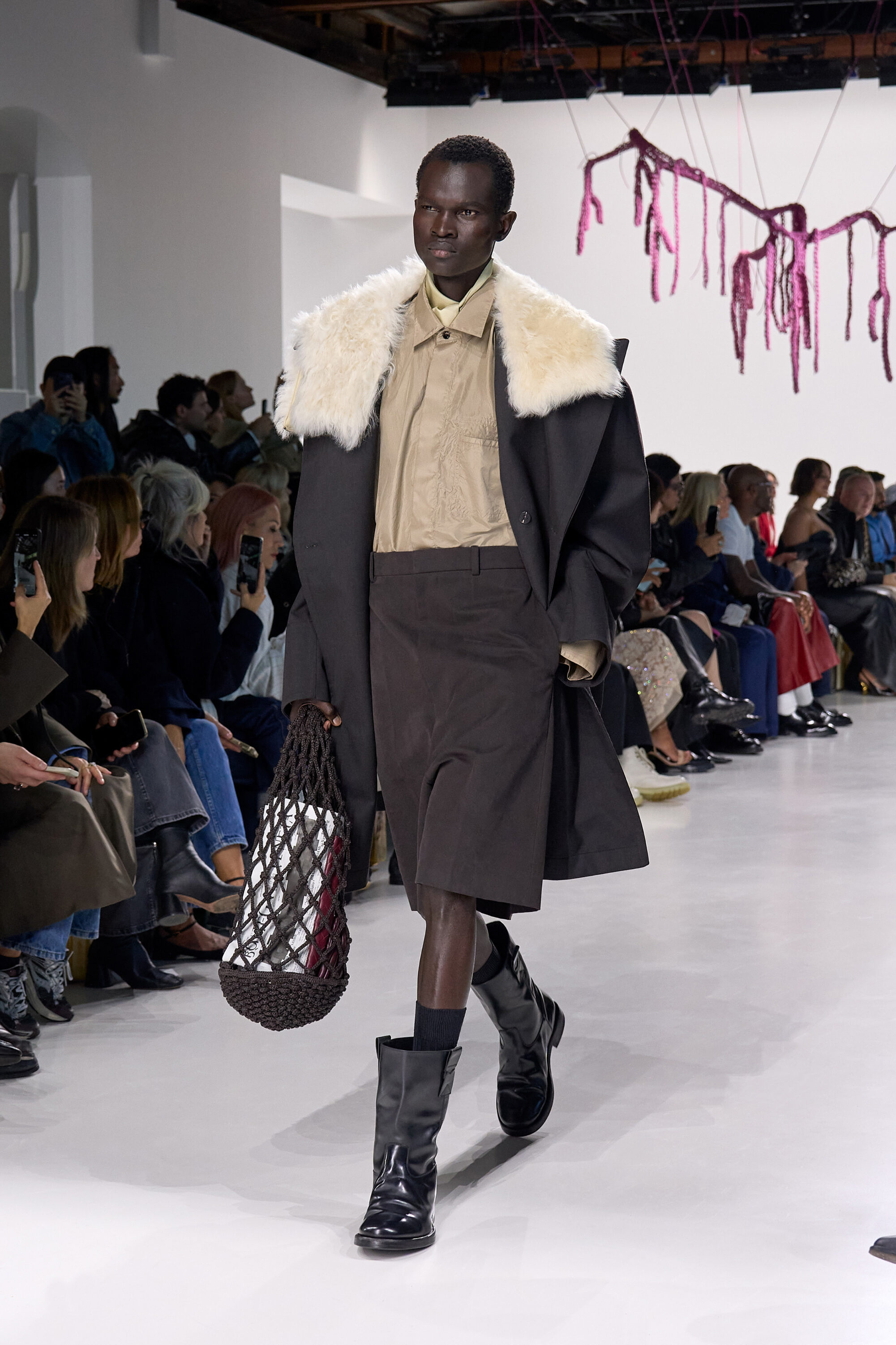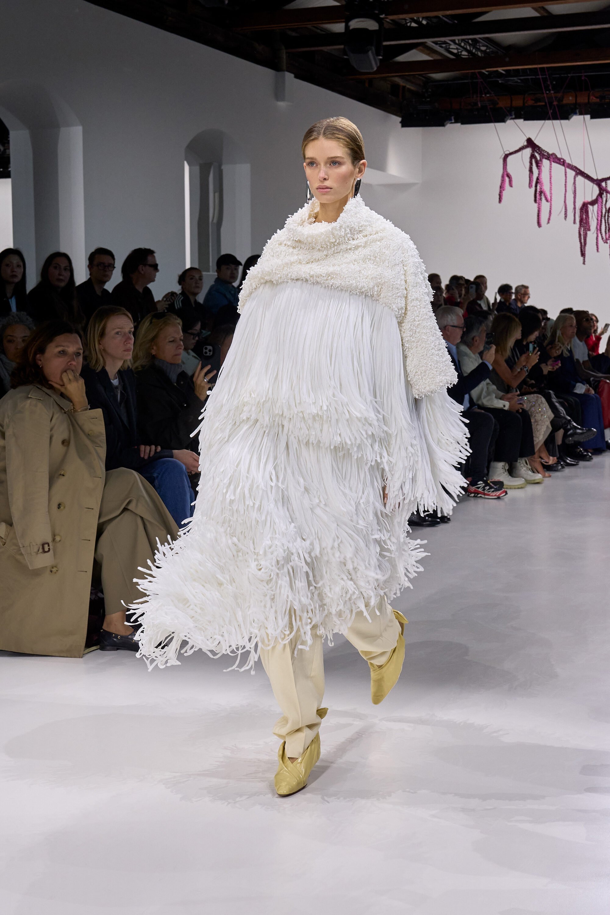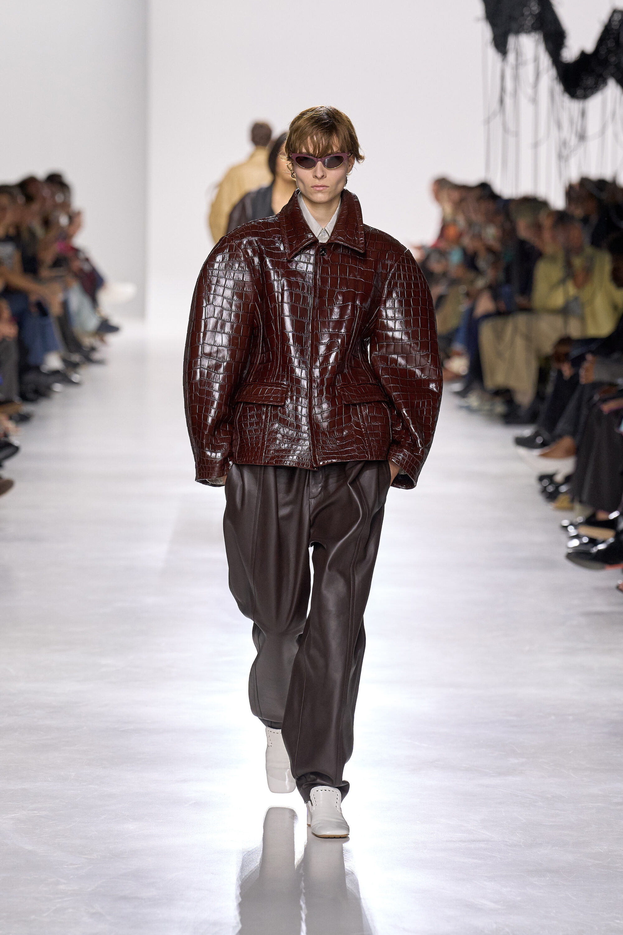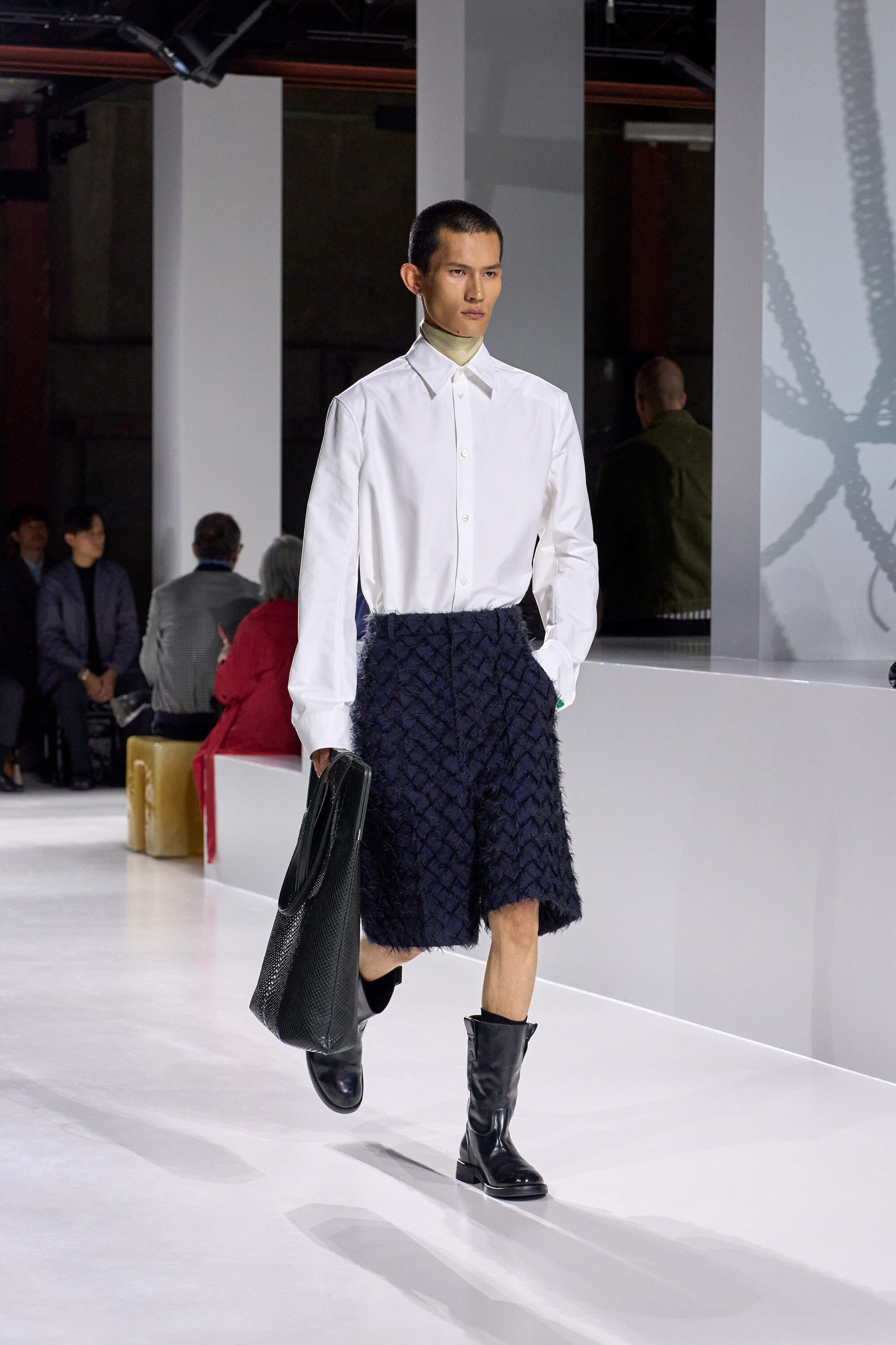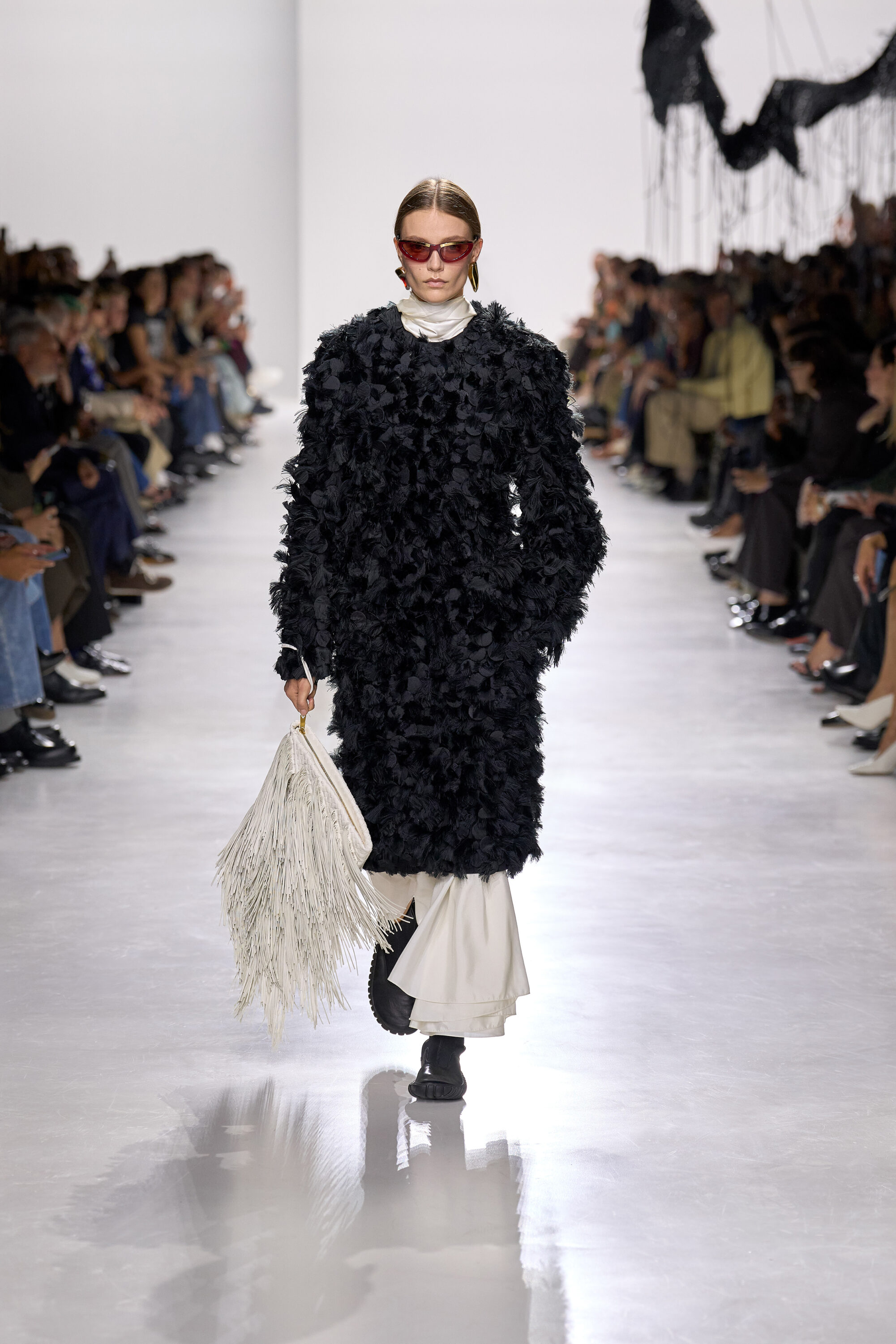 系列貫穿著 Intrecciato 編織元素,從領口取代鈕扣的編結細節,到包款、鞋履乃至配飾,甚至回收再製玻璃纖維製成的假皮草,都在傳統工藝與當代美學間遊走,她讓經典 9 毫米、12 毫米的皮革織條以全新比例回歸,並透過解構與重塑,使工藝不再只屬於手袋,而是成為衣櫥語言的一部分。