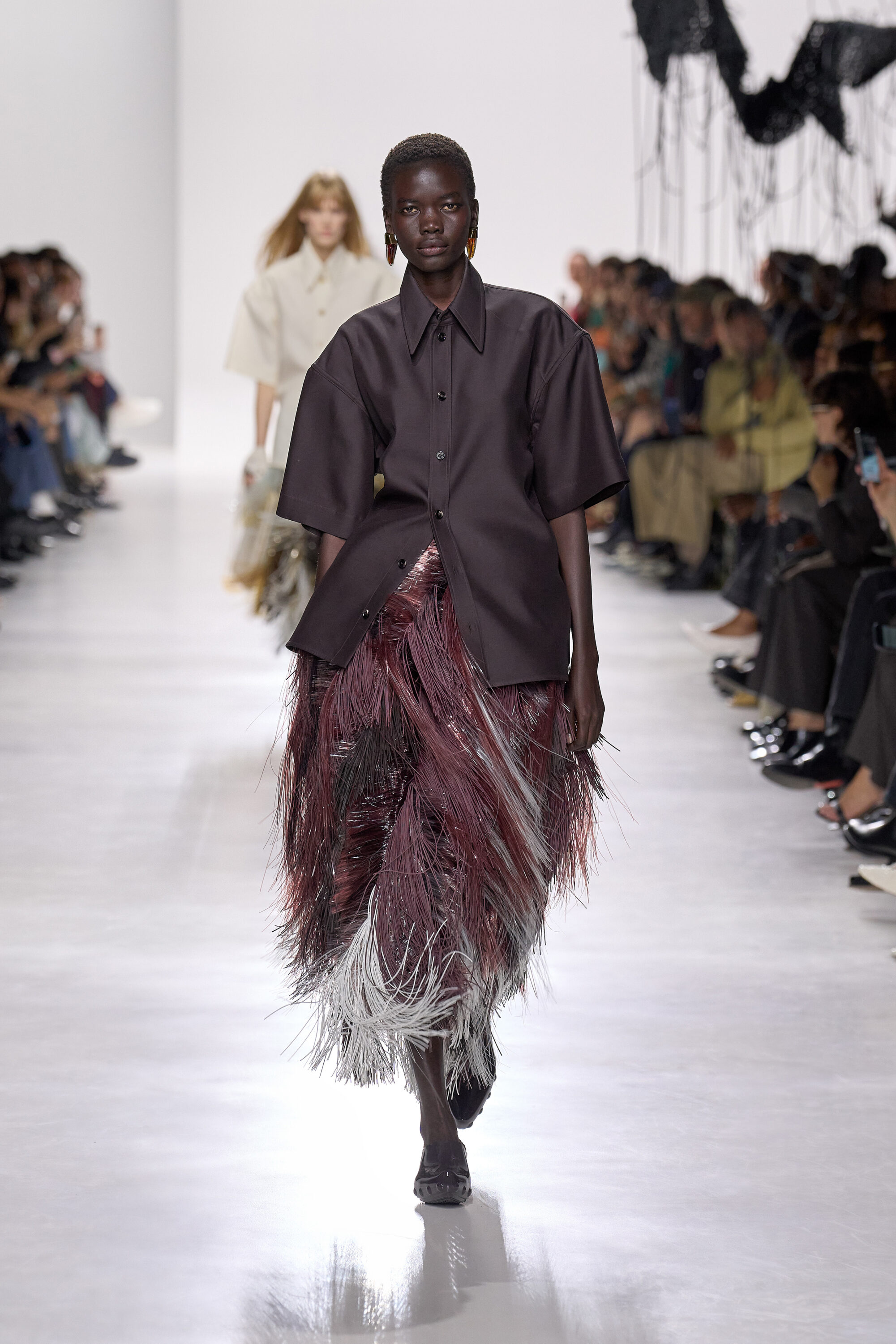 晚裝的呈現則更具張力了,流蘇裙配上硬挺襯衫,帶有一絲建築感外又蘊含著節制;簡約中長裙,卻故意留下了單肩滑落的細節,流露出若隱若現的性感。