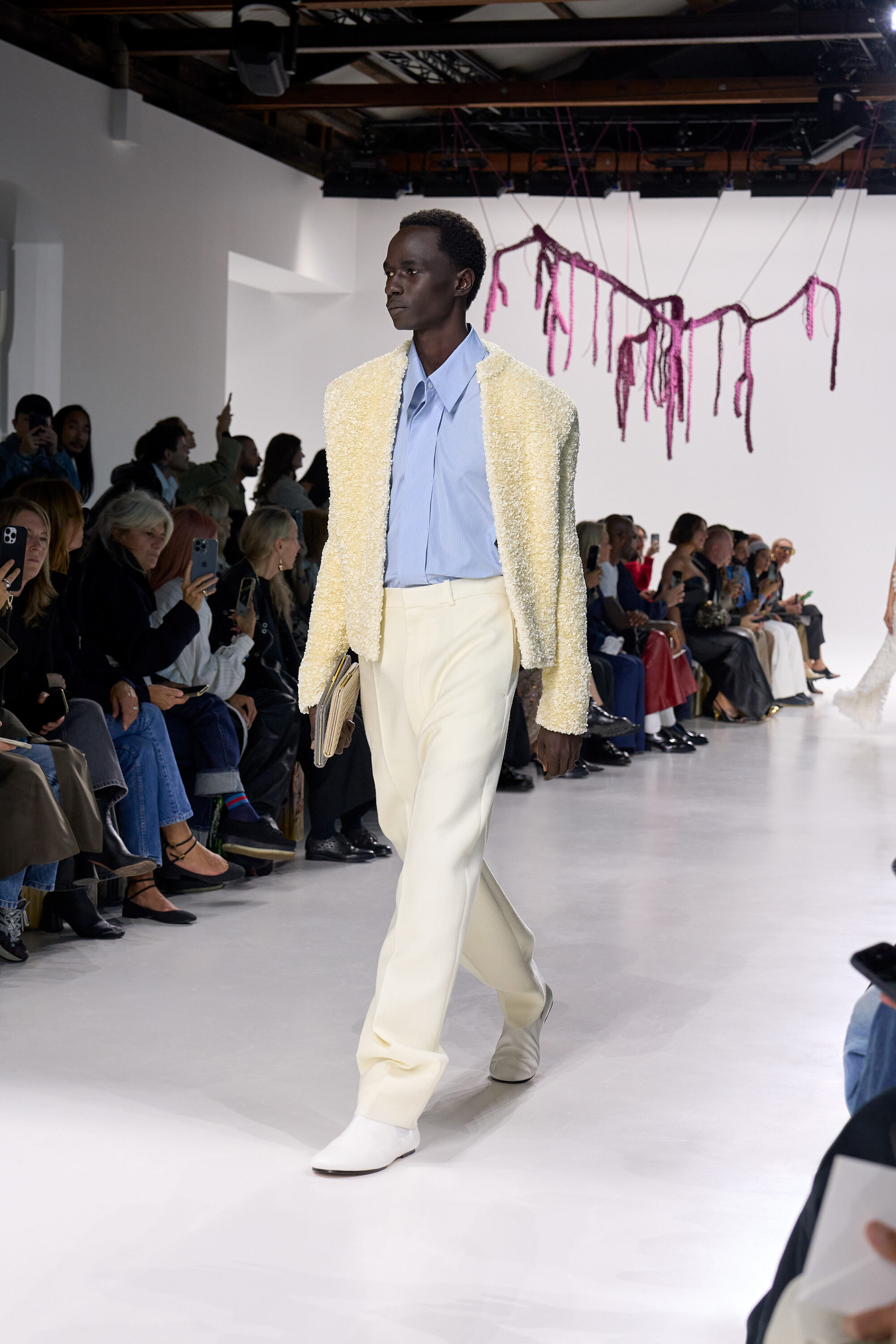 為紀念品牌成立 60 週年,Louise Trotter 也特地邀請了英國藝術家、奧斯卡導演 Steve McQueen 打造聲音裝置《’66-’76》,將 Nina Simone 與 David Bowie 版本的《Wild Is the Wind》交織在一起,就彷彿是聽覺版的 Intrecciato 編織般,不僅是對過往的致敬,也為系列注入了跨界對話的力量。