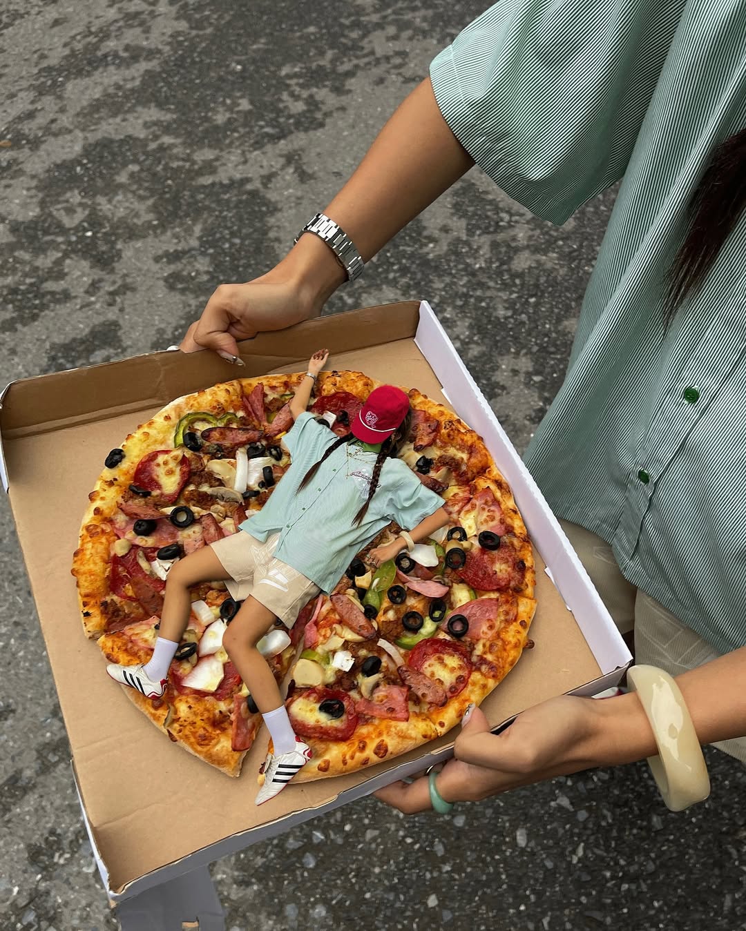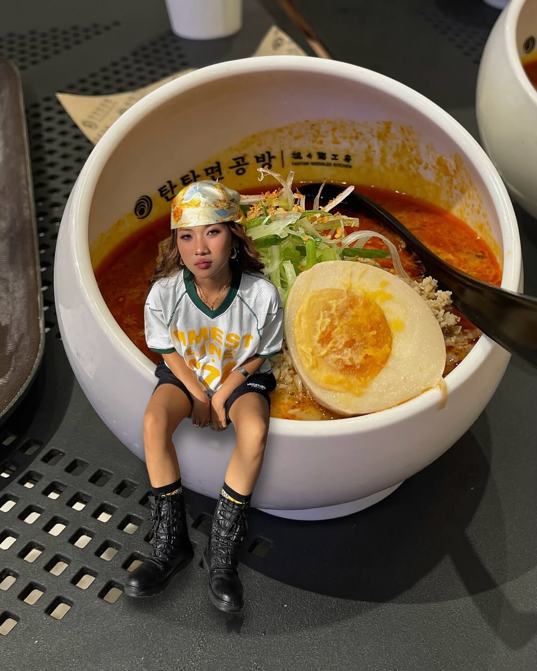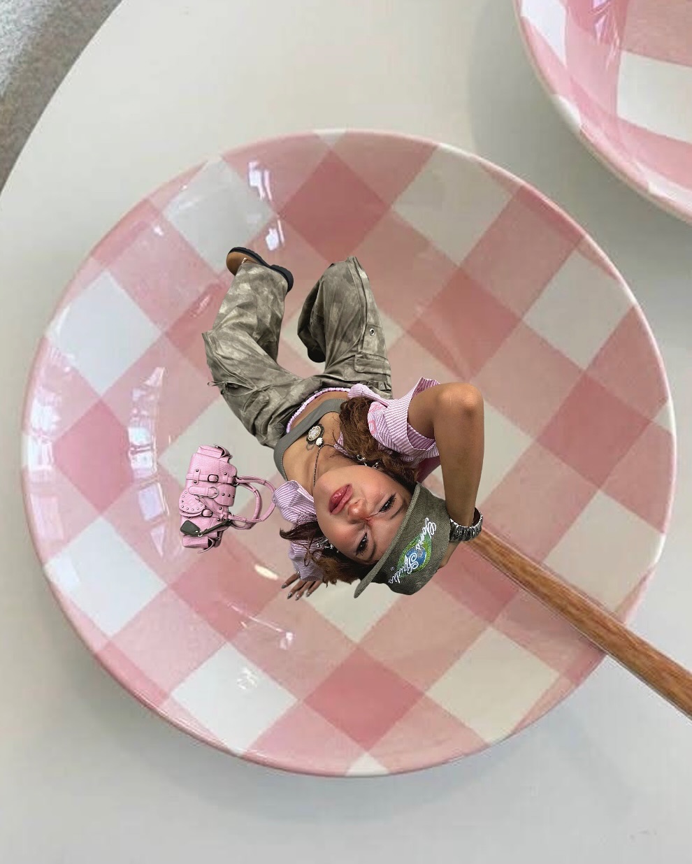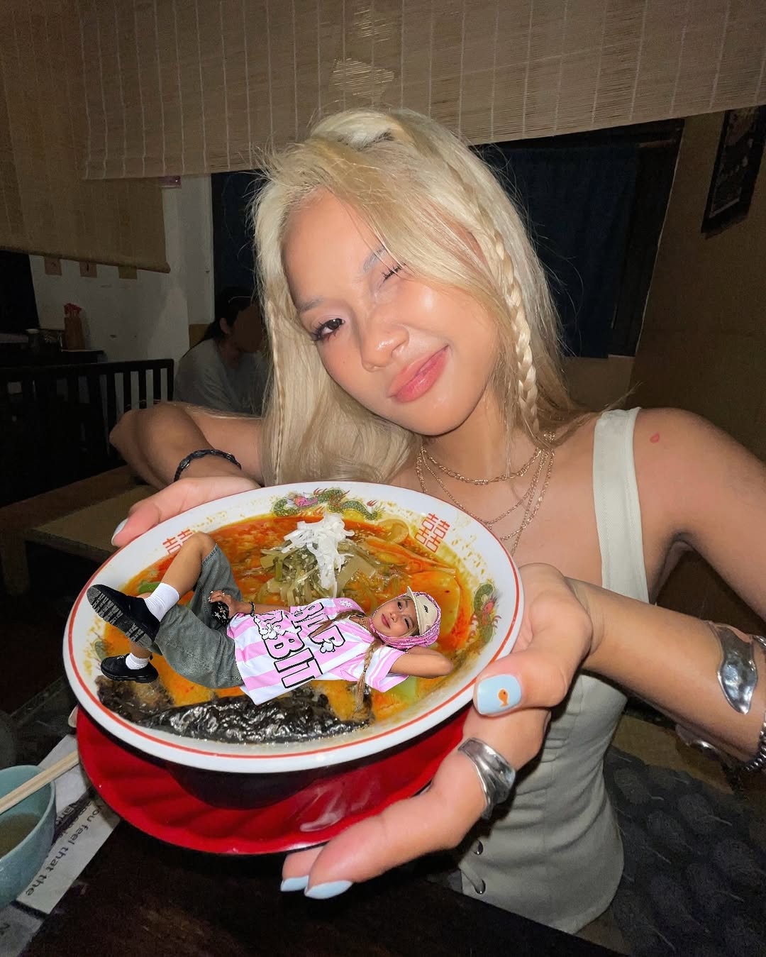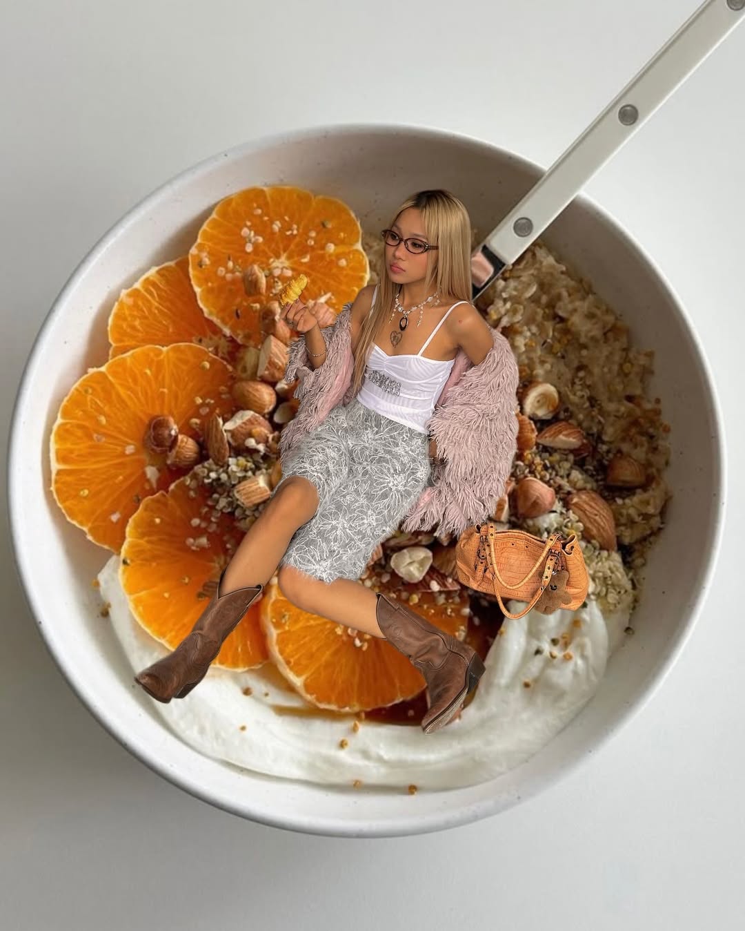 比如把衣服鋪在平面上,乍聽是很常見的拍攝手法,但她偏偏會把真人頭 P 上去;有時候還會把自己放到食物之中,坐在拉麵碗邊緣、躺在盤子上等等。