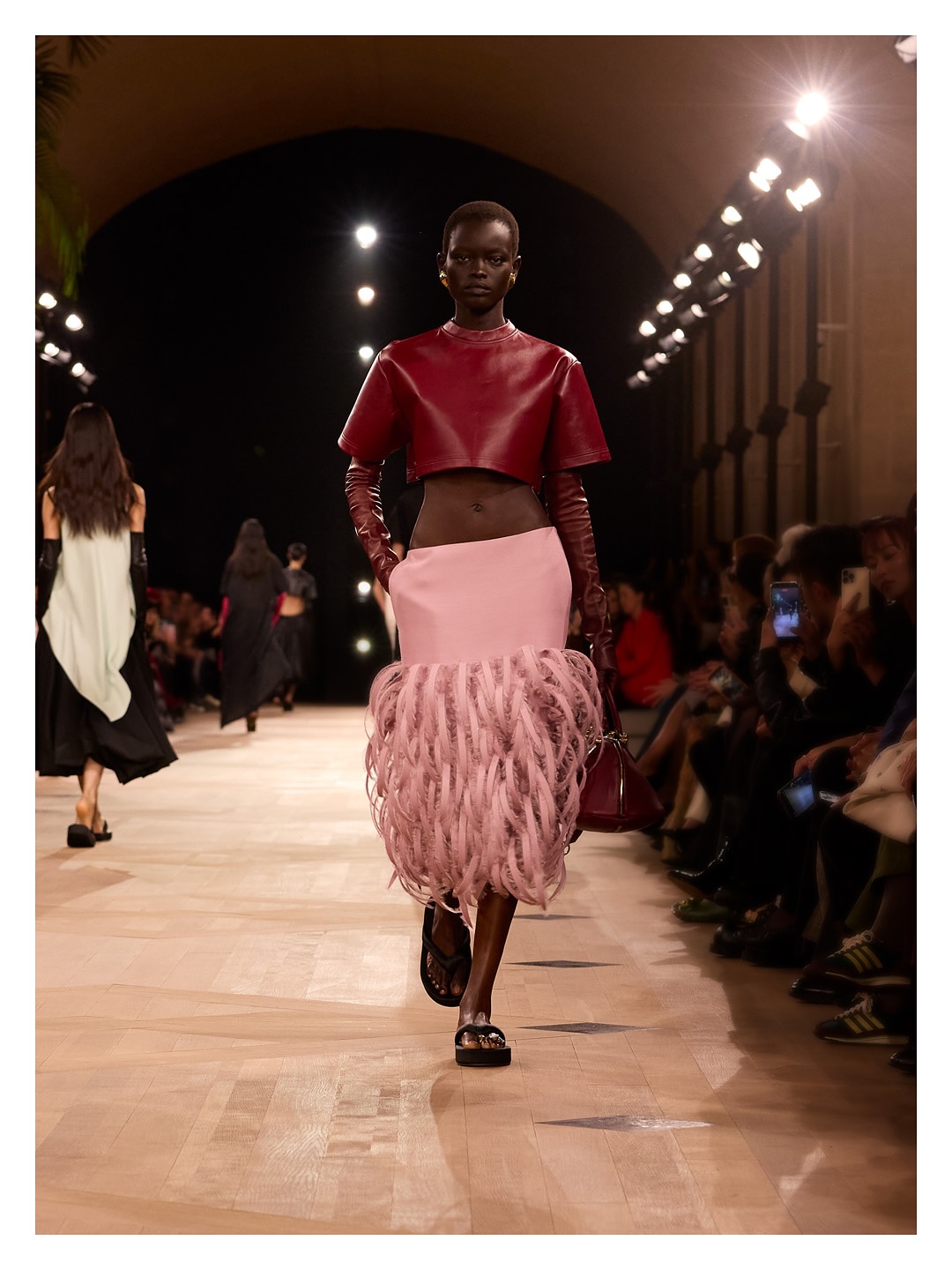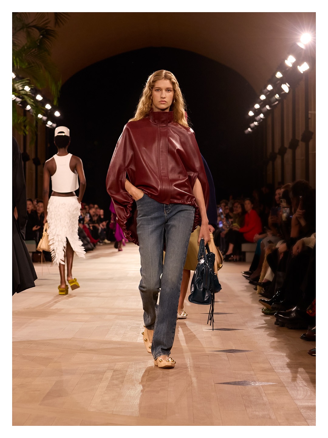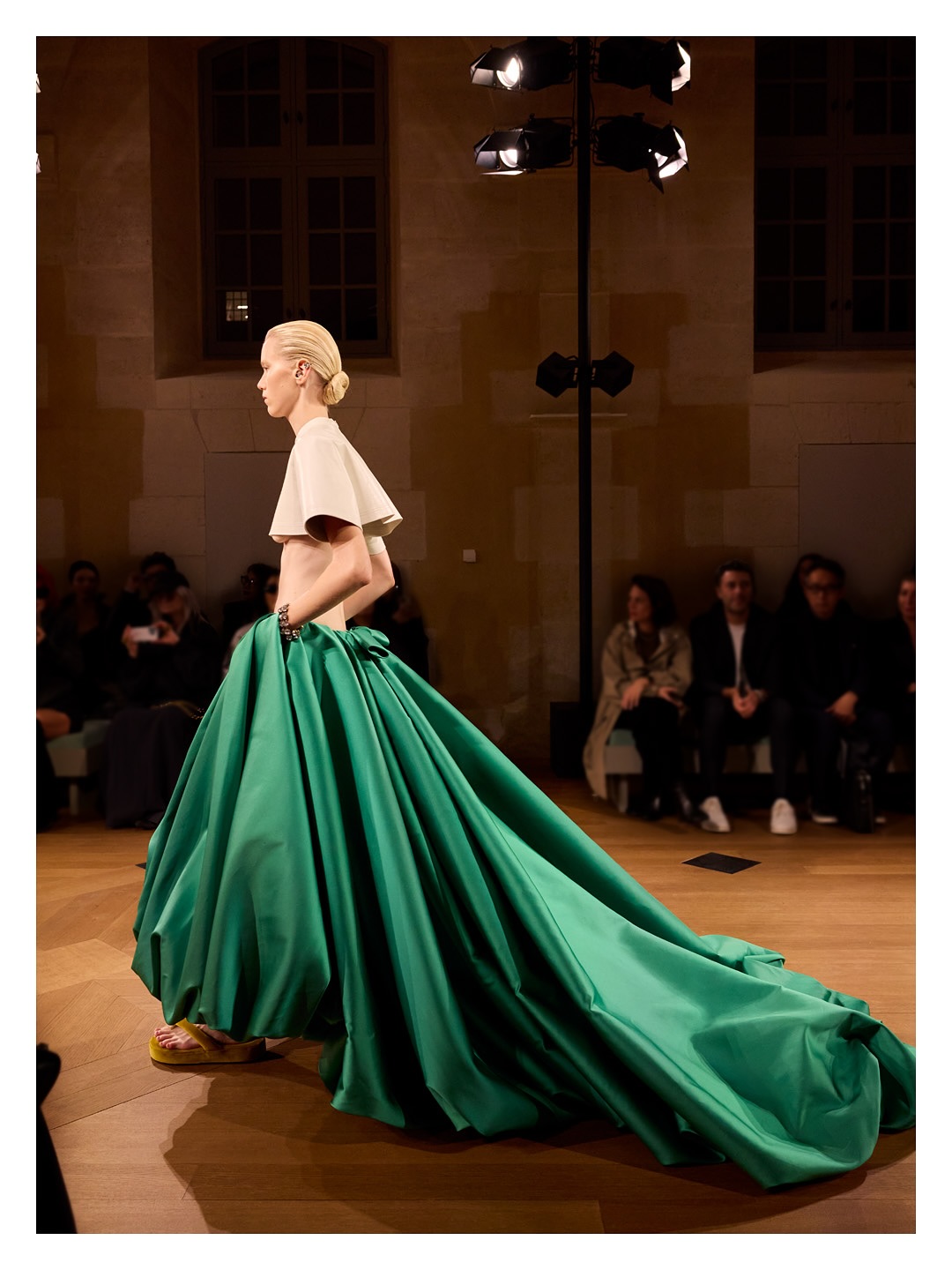 大秀的秀場空間重現了巴黎式沙龍舊景,同時縈繞著品牌全新香氛”GETARIA”的香氣。此款香氛得名於 Cristobal Balenciaga 的故鄉,一抹無形卻始終存在的氣息包裹著整個空間,在時空交錯中完成對品牌設計基因的崇高敬意,也讓人難忘。