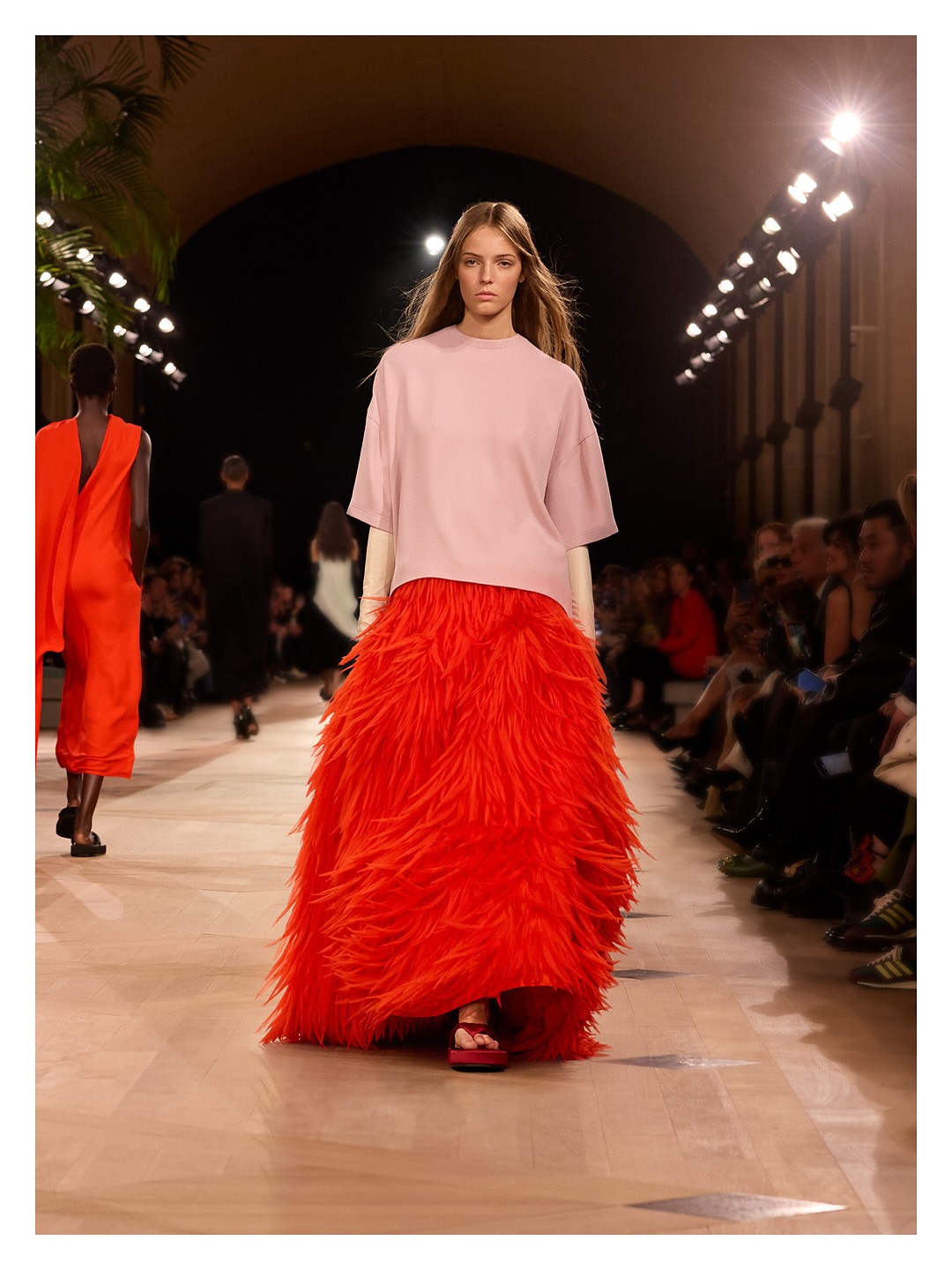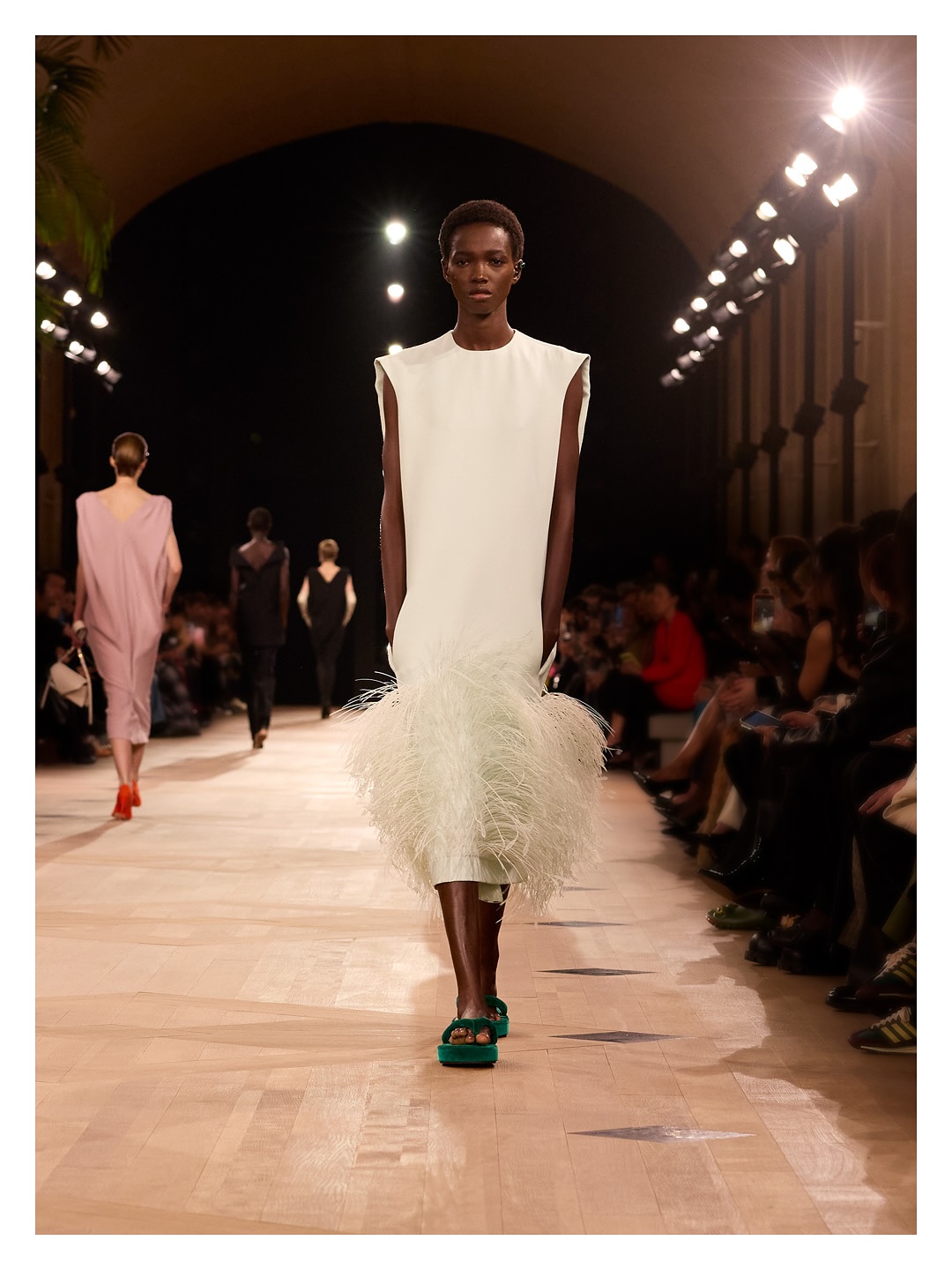 其中的亮點還有本季使用的面料。Balenciaga 品牌最具代表性的”GAZAR”面料——這款1958 年由 Cristobal Balenciaga 和瑞士面料商研發的重磅絲綢,本季被賦予新生,以本布製成的花卉與羽毛刺繡,不再是裝飾元素,而成為一種建築般的建構手法,它以極致純粹的剪裁,再度從根本上重塑身體輪廓。