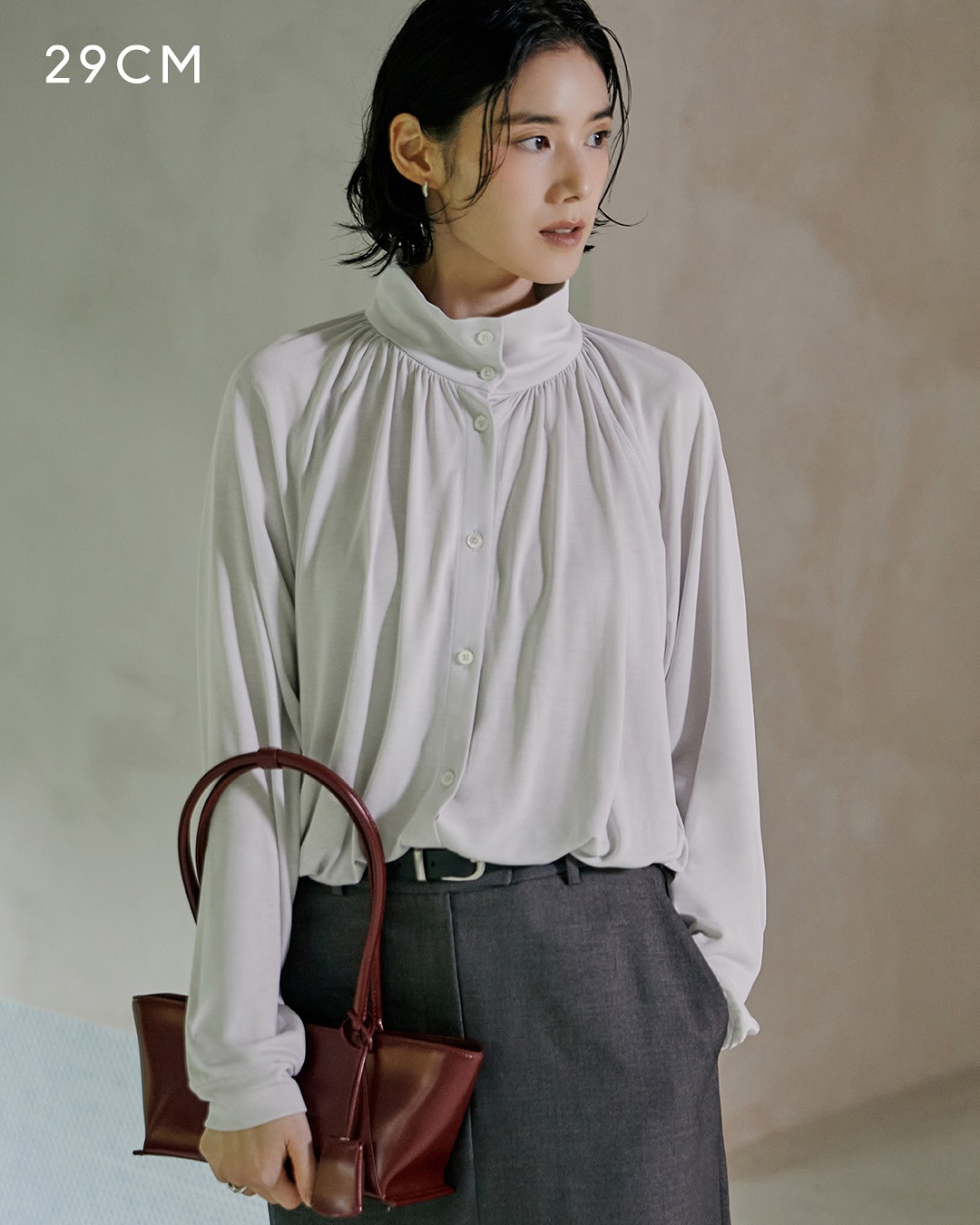 在韓國服飾品牌 NILBY P 的秋冬廣告中,她梳起中分瀏海,將髮尾夾了一點自然的捲度,隨性地勾到耳後,身穿灰色針織與白褲,外罩寬肩西裝外套,簡簡單單的就好顯氣質,好好看。