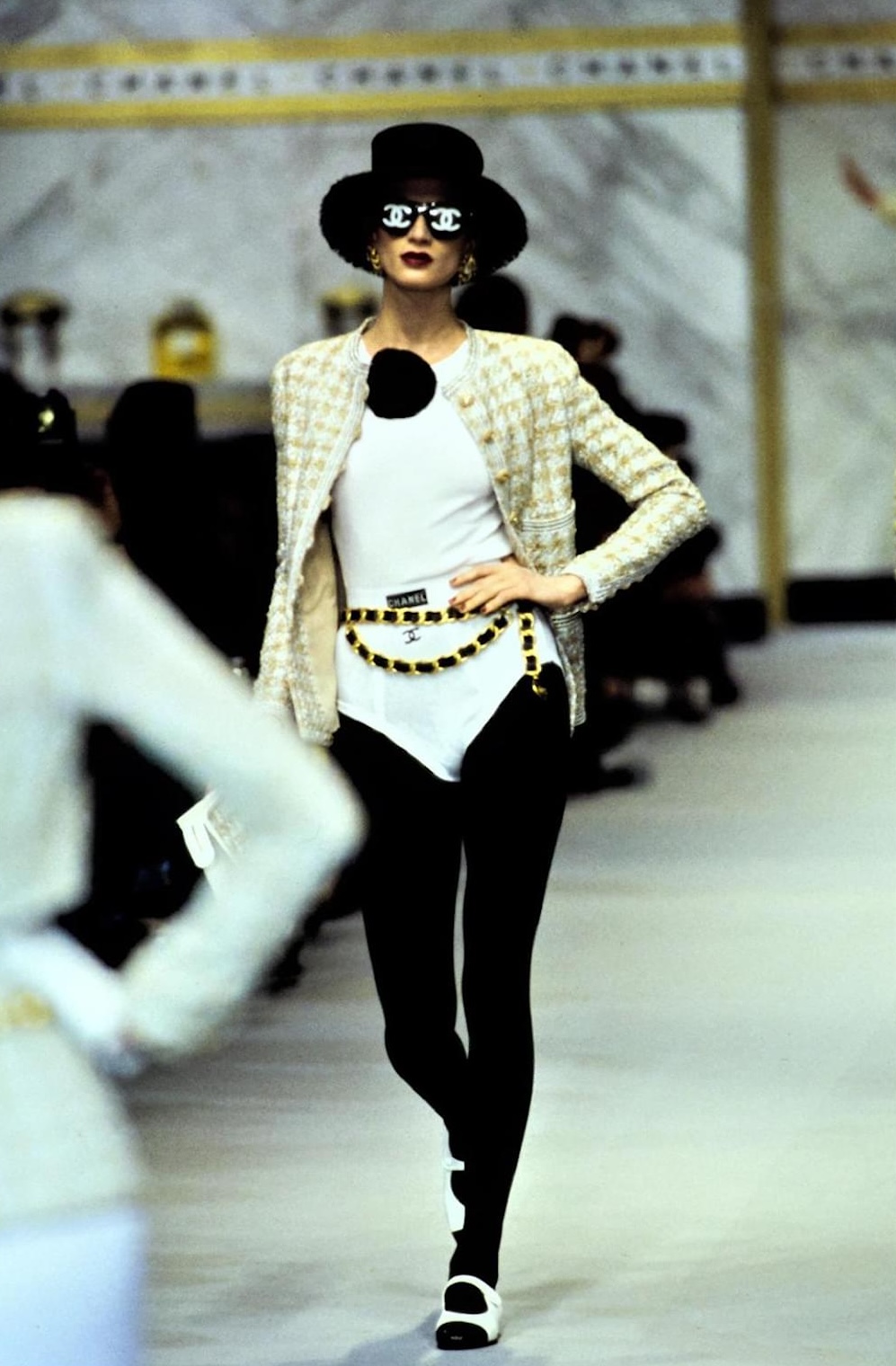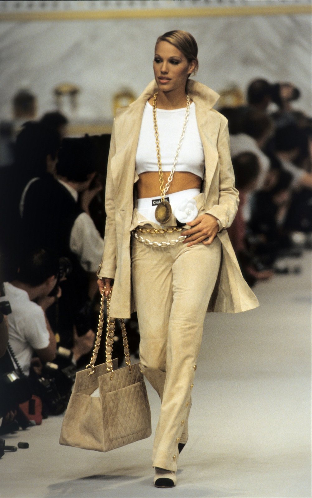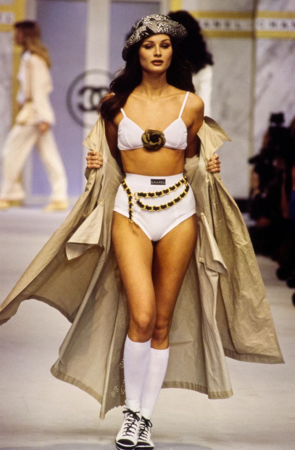 CHANEL 1993 春夏系列是由 Karl Lagerfeld 擔任創意總監,當時他將男性風格的底褲融入女性套裝,搭配經典山茶花與粗花呢外套,風格帶點顛覆、性感,近一步拉近高級時裝與日常穿搭的界線。