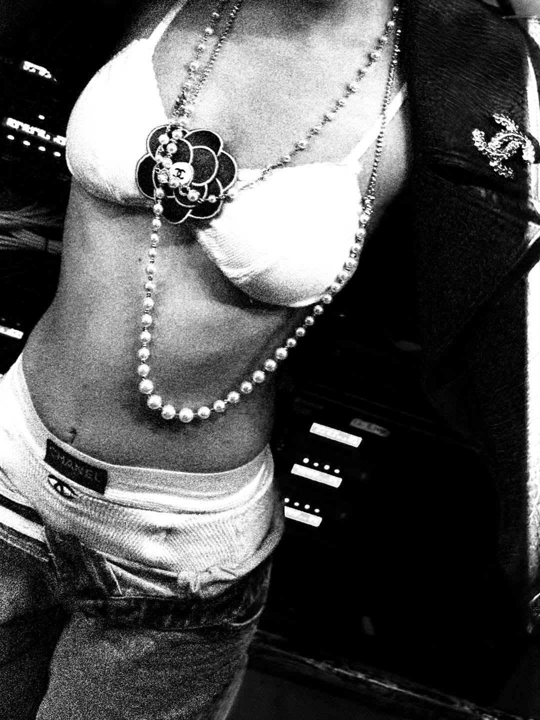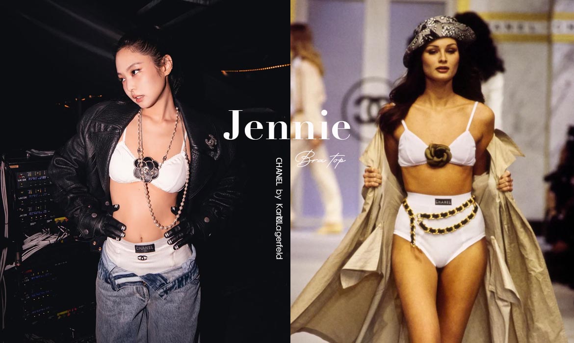 造型師 Sam Woolf 今日也公開表示這一套正是來自 CHANEL 1993 春夏系列服裝,以白色 Bra Top 搭配高腰底褲,還刻意將牛仔褲穿低,露出一大截底褲腰頭,營造率性前衛的氛圍,並搭配皮手套和皮外套增添個性,而胸前所搭配的黑色山茶花胸針則來自 1995 春夏系列。