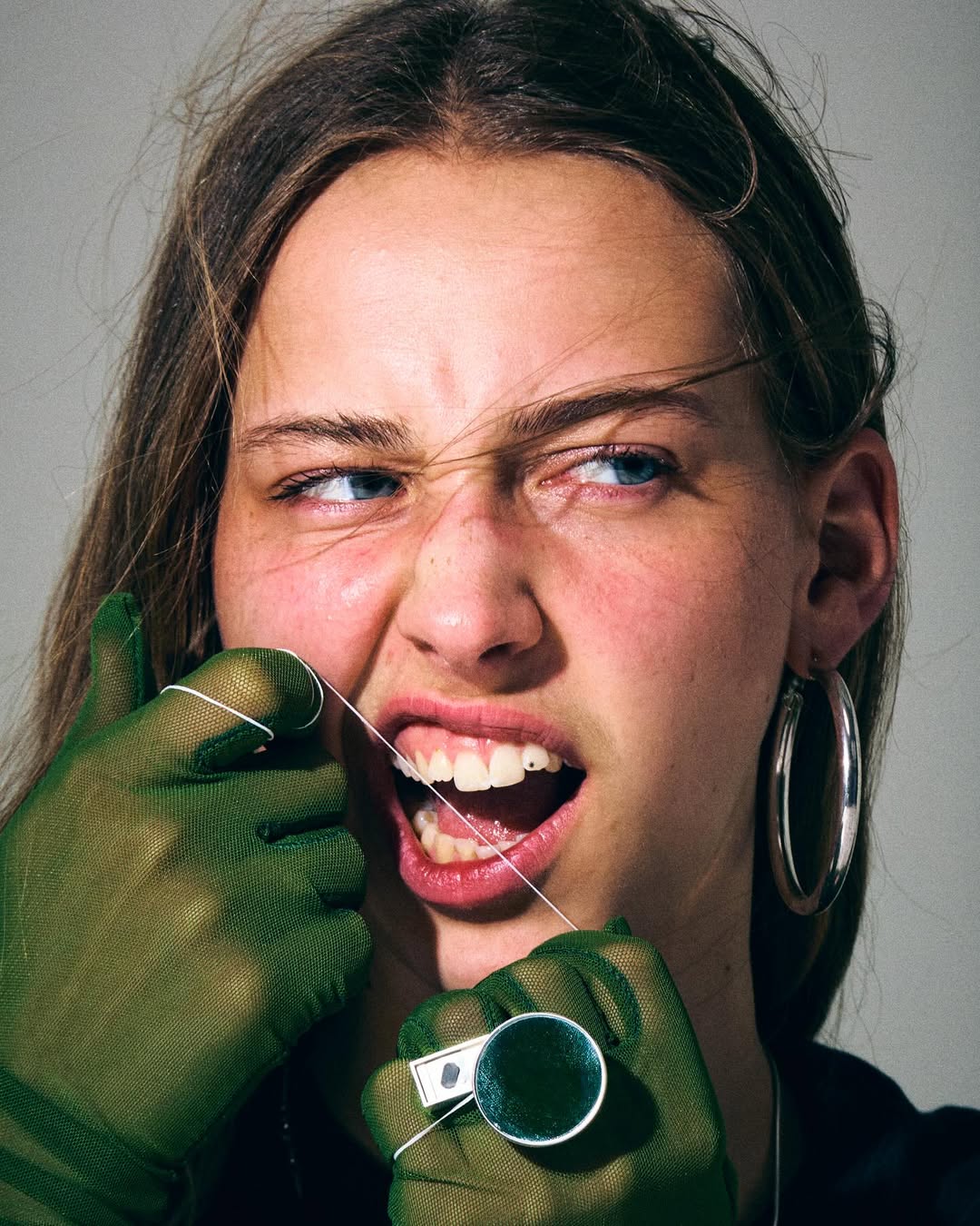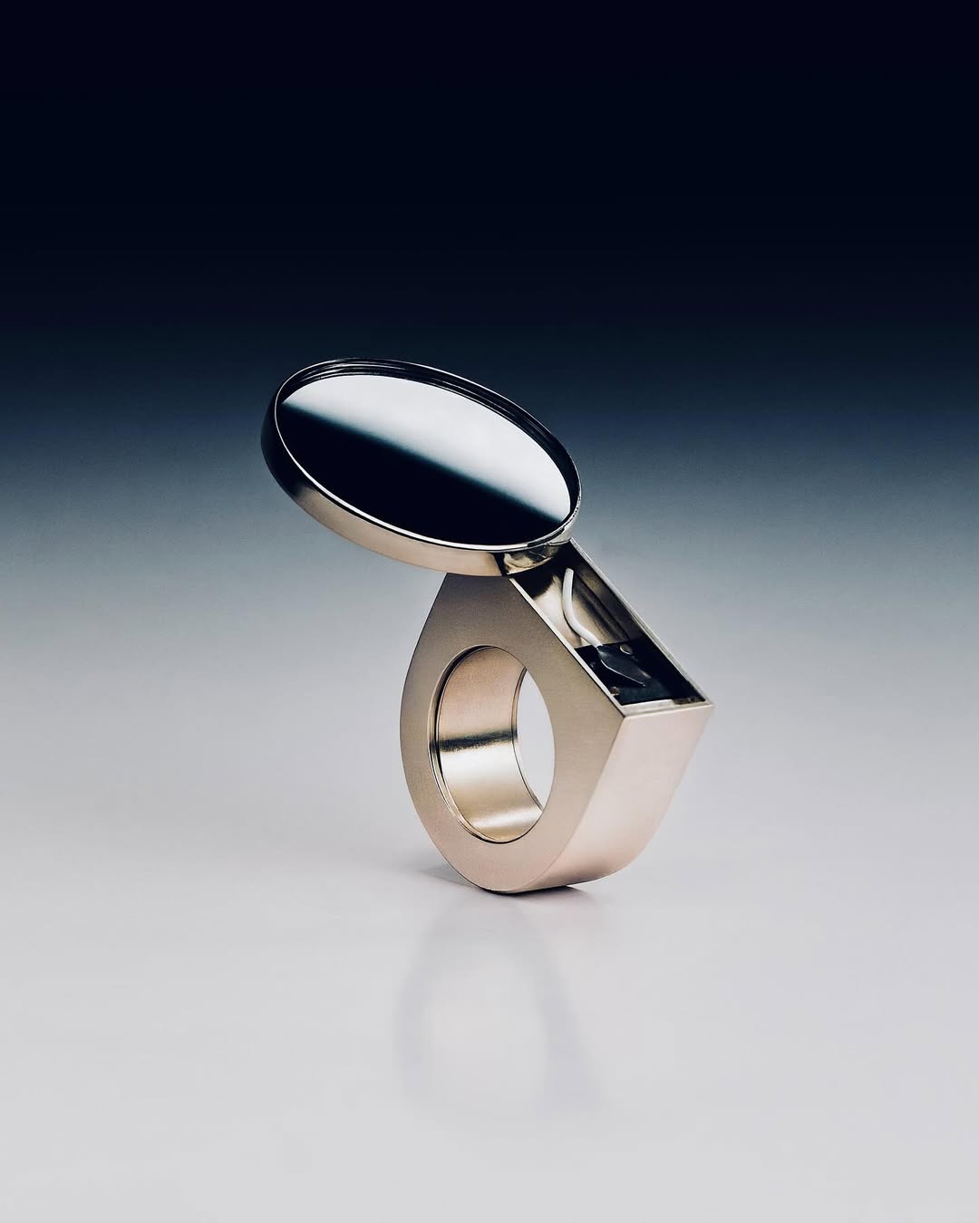 「牙線戒指」的靈感就是自己經常遇到的情況,因為在韓國喜歡吃辣,吃完後常常卡辣椒粉,那一刻他只想低調快速解決,因而製作出暗藏牙線的戒指。乍看之下是俐落冷冽的幾何圖形戒指,旋轉戒面的鏡子後,底下竟然是牙線,看似荒謬卻意外實用。