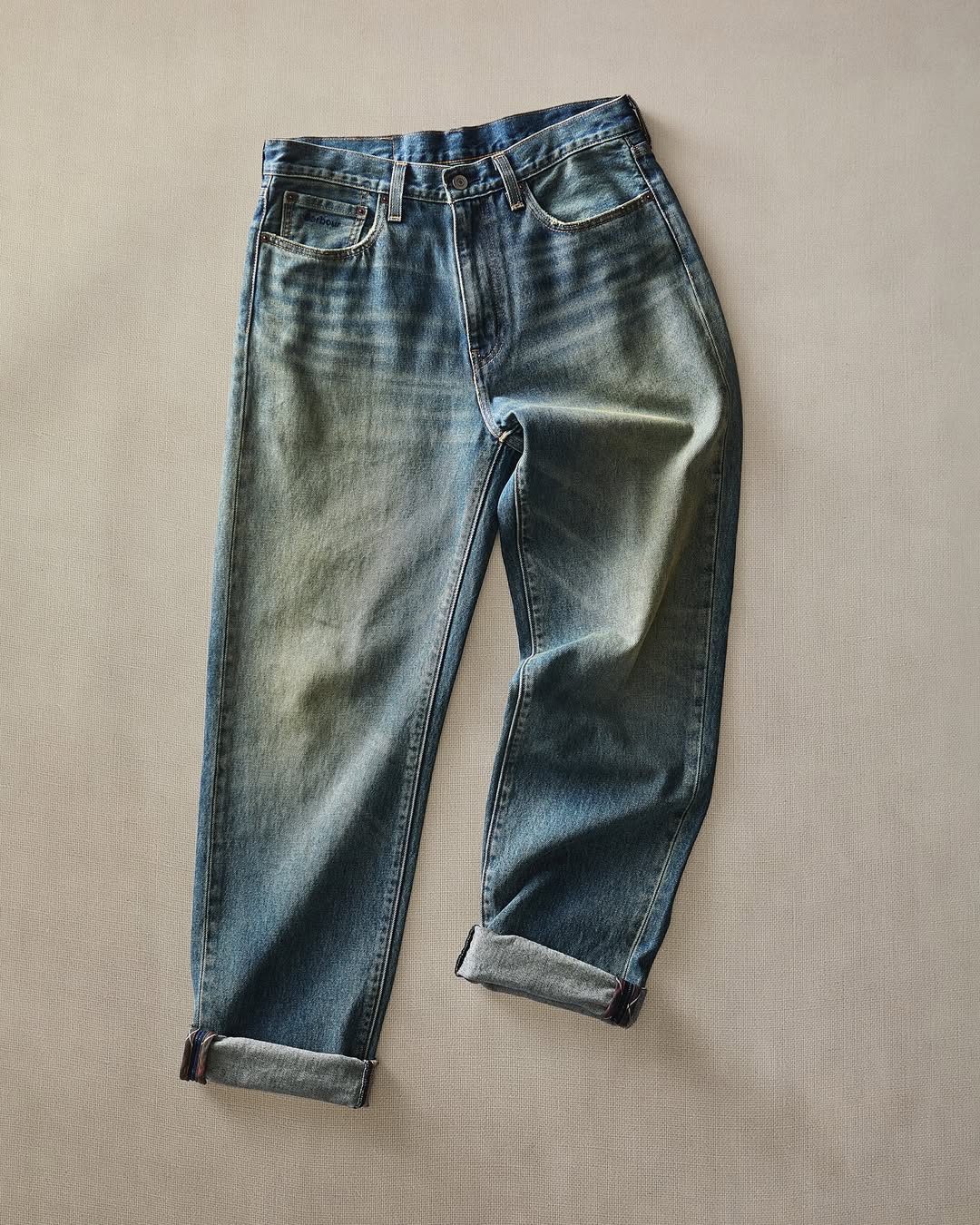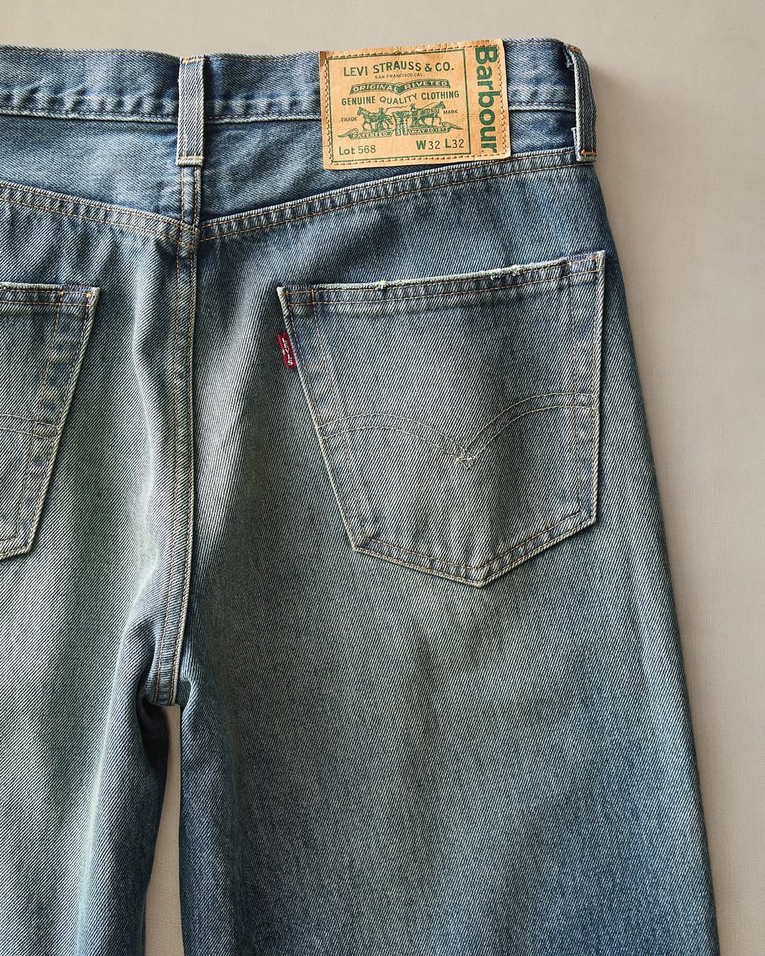另一款 568 寬版丹寧褲則以深色仿舊布料打造,邊角飾以格紋鑲邊,既復古又耐穿。值得一提的是,兩款褲子的後腰都飾有以 Barbour 經典綠為底的聯名皮標,非常有紀念價值!