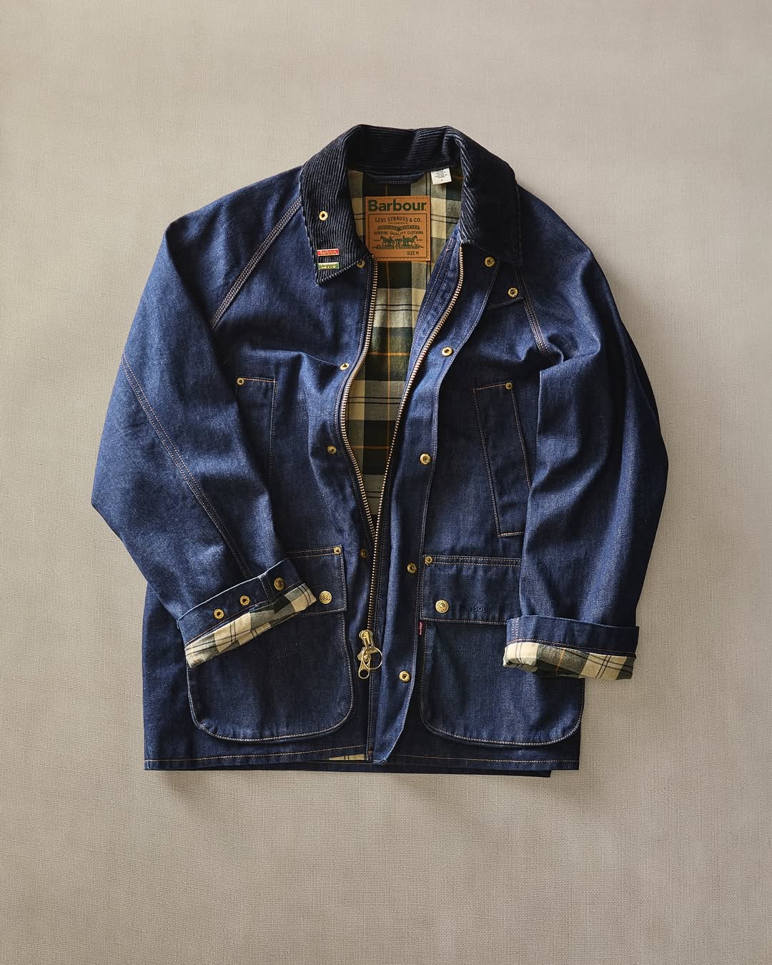 褲款部分的 578 燈芯絨長褲採用的是打摺設計,並在內裡以格紋布料飾邊;口袋內襯則印有來自雙方品牌檔案庫的圖像,也就是 Barbour 的漁夫造型與 Levi’s® 的淘金工人造型,象徵兩種勞動文化的精神延續。
