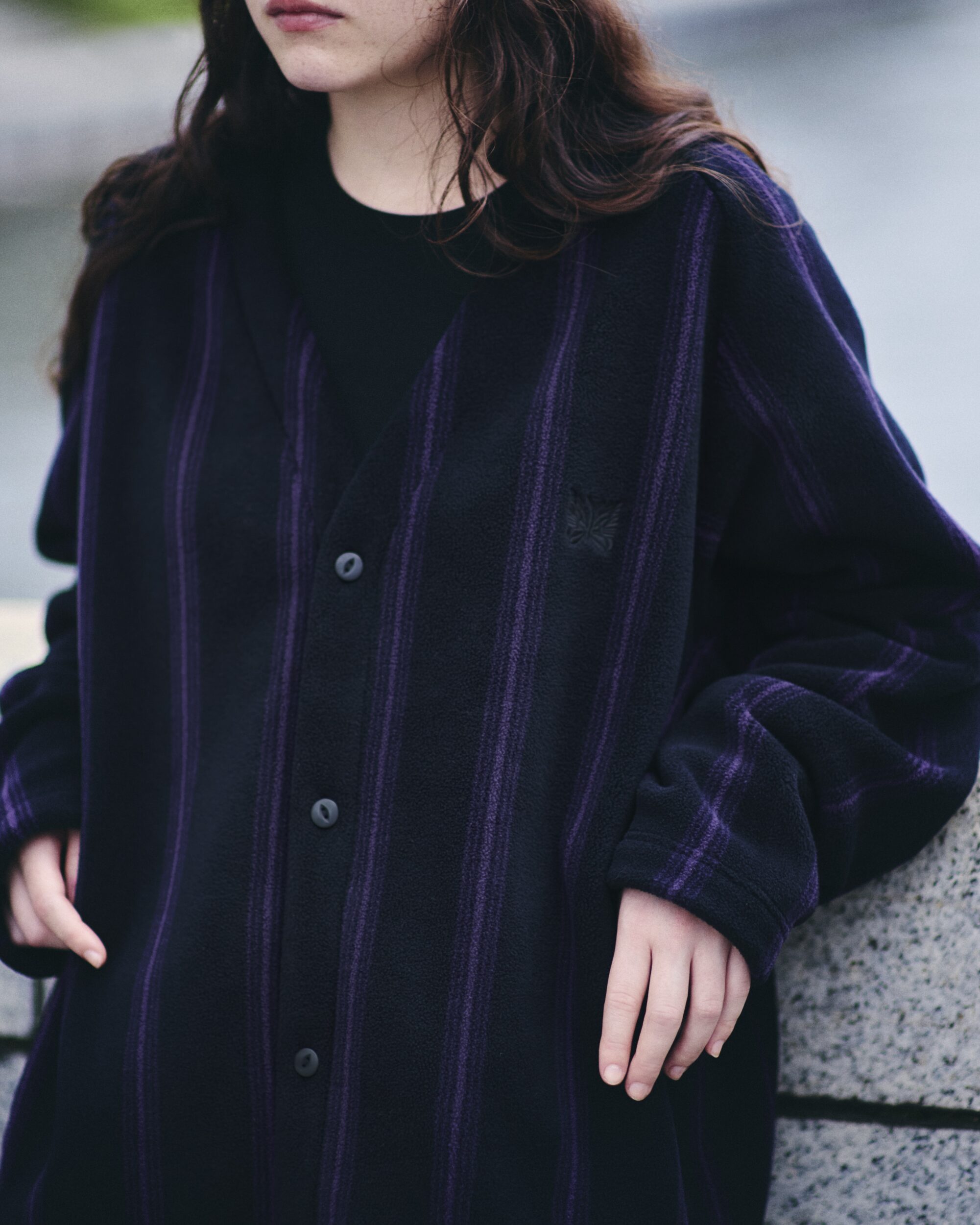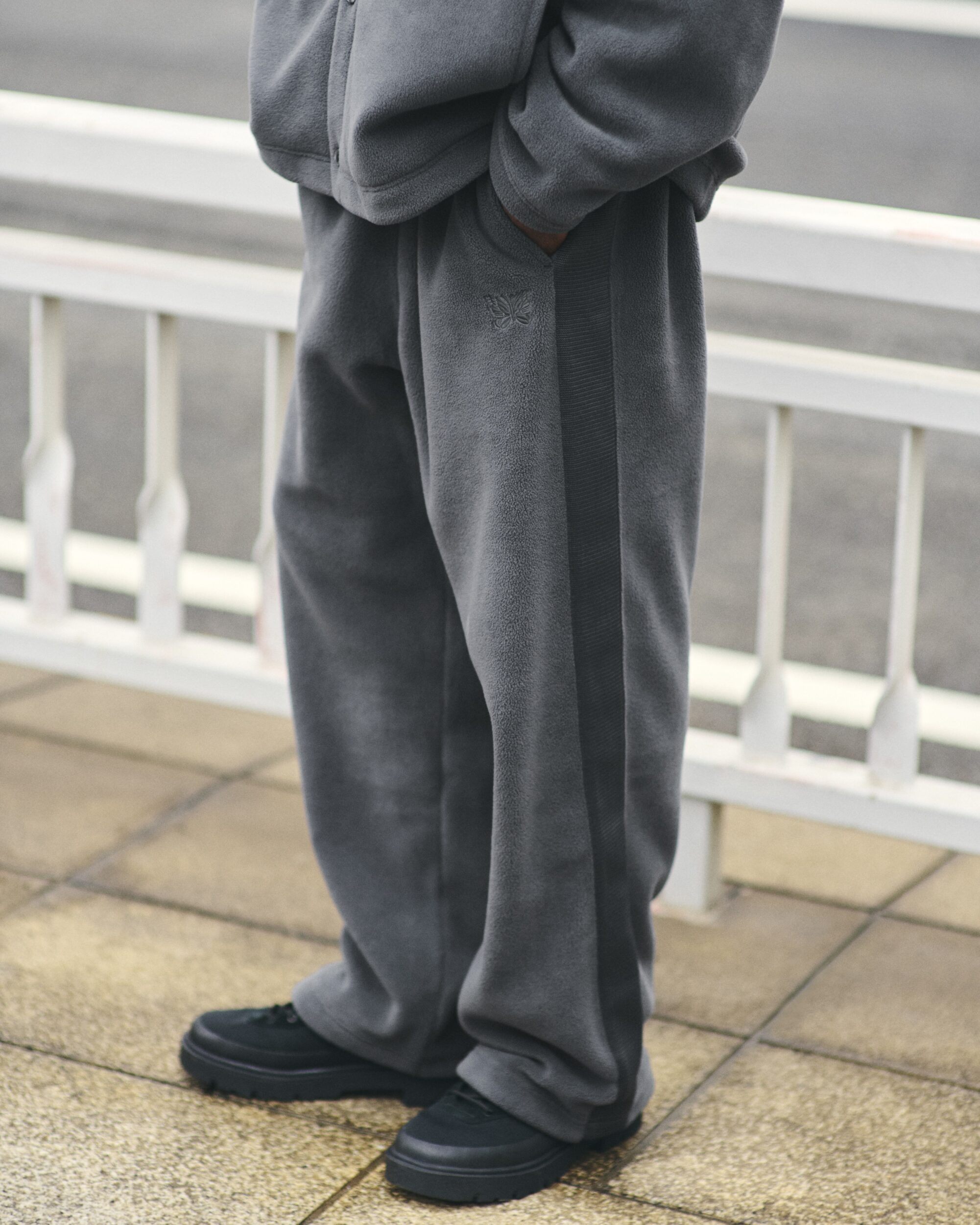 其中刷毛外套以寬鬆摩登的廓形勾勒出 1970 年代的復古氛圍,在柔軟溫暖的觸感中融入率性的街頭氣息;寬版開襟外套則巧妙將 NEEDLES 標誌性的蝴蝶與條紋細節融入俐落剪裁,讓隨性感與結構感達到平衡;而刷毛寬褲則以筆直俐落的輪廓搭配同色系的條紋側線,展現低調卻不失洗練的格調,同時帶來不分性別皆能駕馭的自在穿著體驗。