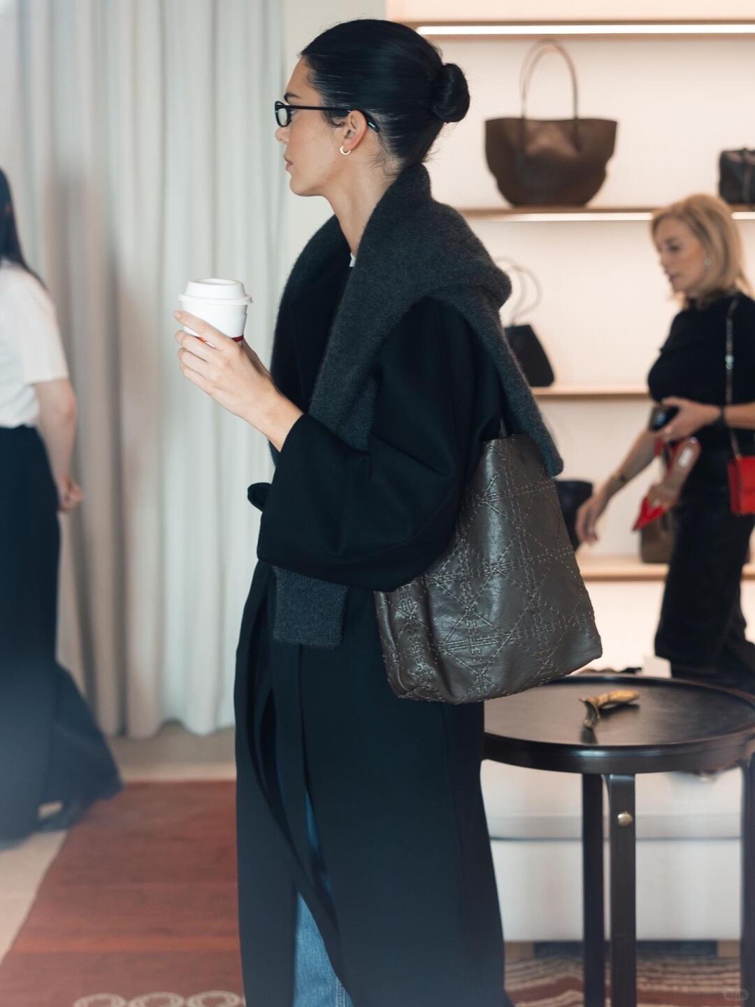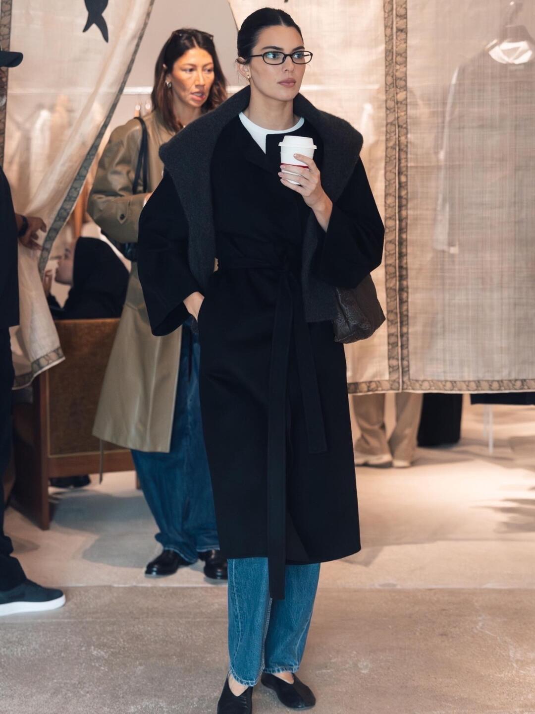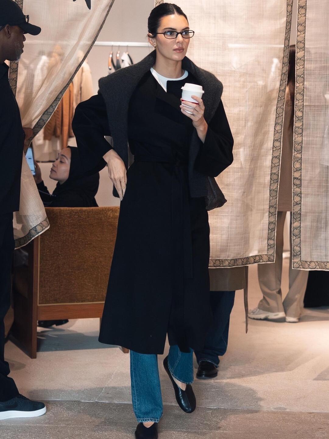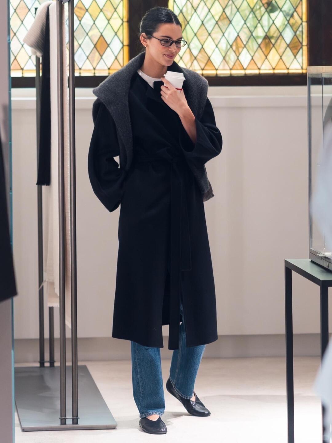 隔日,Kendall Jenner 身穿黑色長版大衣與 Khaite 直筒牛仔褲,搭配灰色針織披肩,腳踩 The Row 芭蕾平底鞋,又變回時髦書呆子的模樣。只不過這次將性感的包臀裙換成了學院風格的大衣。