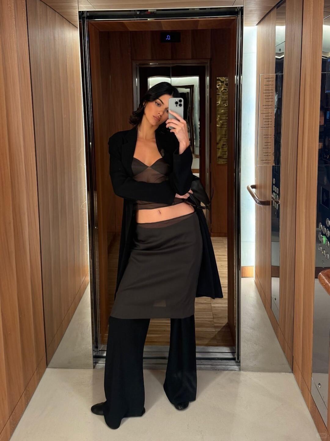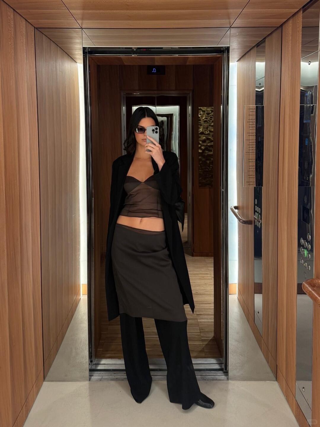 接著來到春夏時裝週,Kendall Jenner 也現身巴黎,這一套 St.Agni 深棕色透視裝有夠辣,下身則是出其不意地以裙裝搭配褲裝,讓造型瞬間又多了點率性,性感又帥氣。