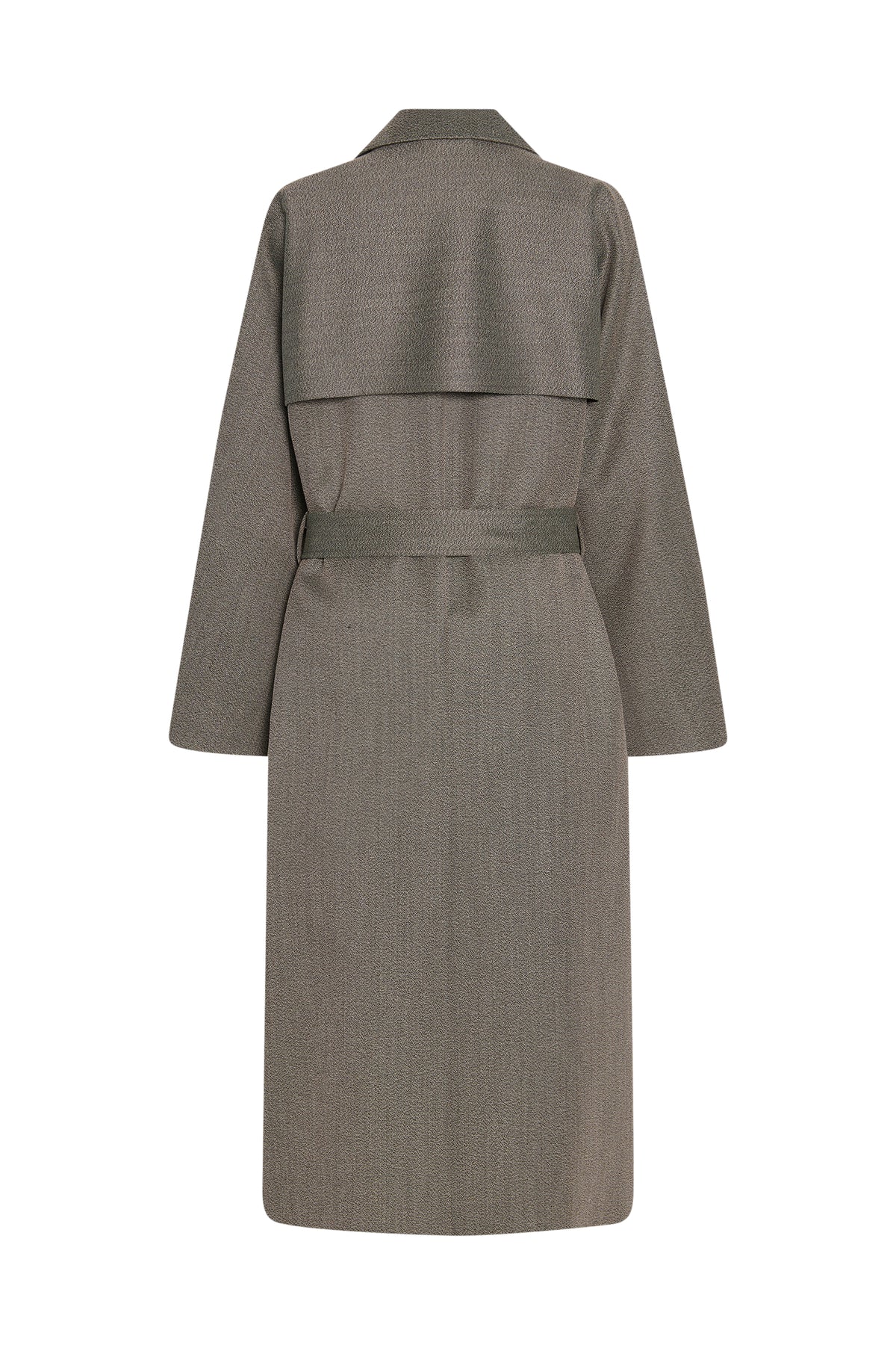 接著又是一套長版外套造型,看來秋天真的是長風衣的季節,她這件 The Row 灰色長版風衣,腰間繫了條綁帶加強腰身,裡頭則搭配了同材質的長裙,風格簡約時髦,一點也不拖泥帶水。