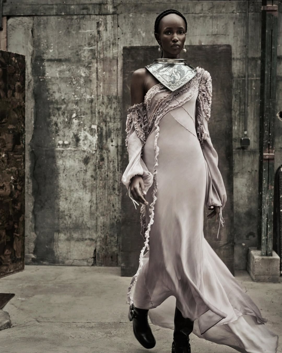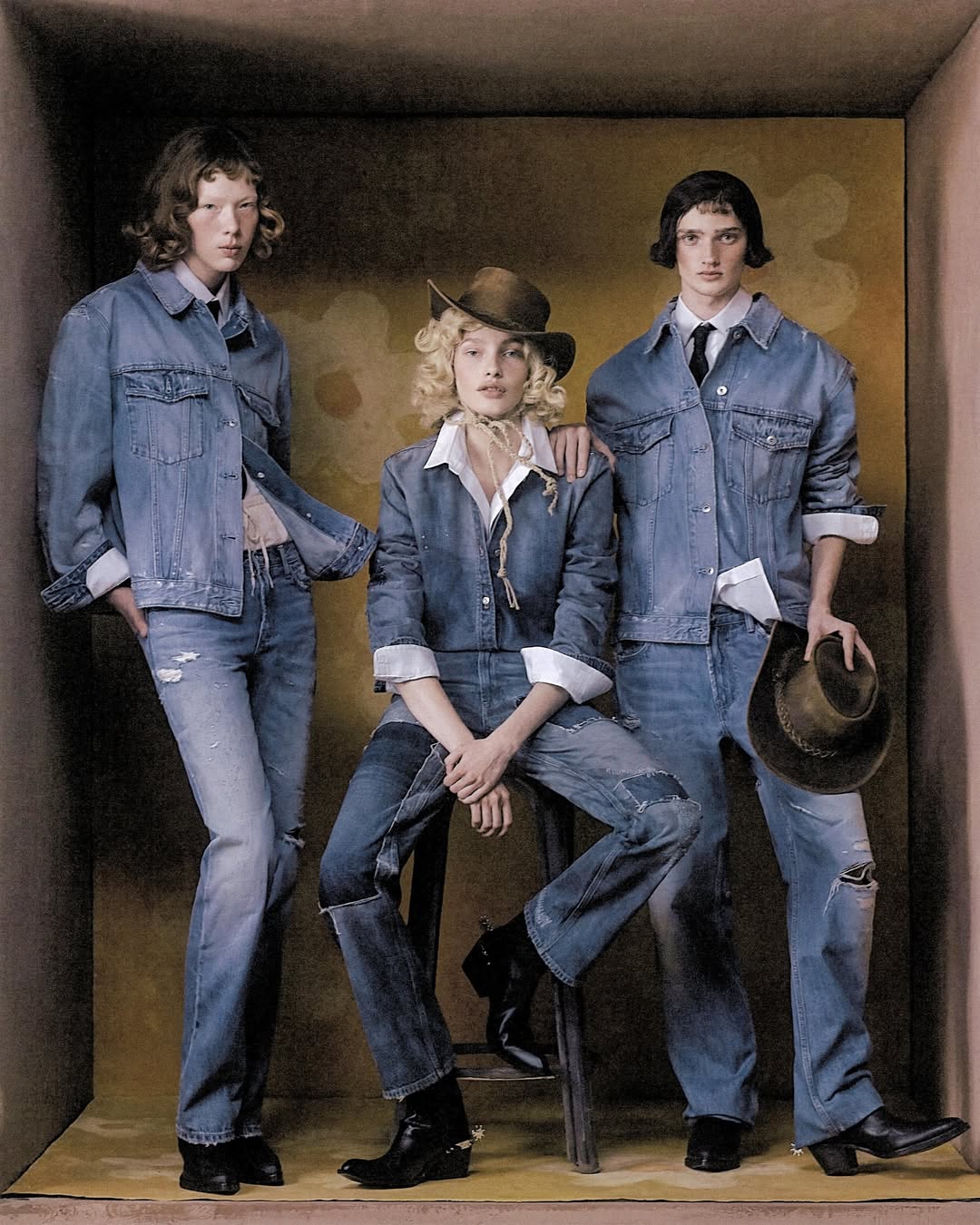 另一個焦點是牛仔單品,有打摺短版牛仔外套與做舊感牛仔襯衫;牛仔連身裝則結合了翻領與束袖設計,簡約又好看;還有另外兩款低腰寬版牛仔褲,一條是拼接款,一條是破壞款,不僅重新定義了經典輪廓,也展現出街頭與結構間的平衡。