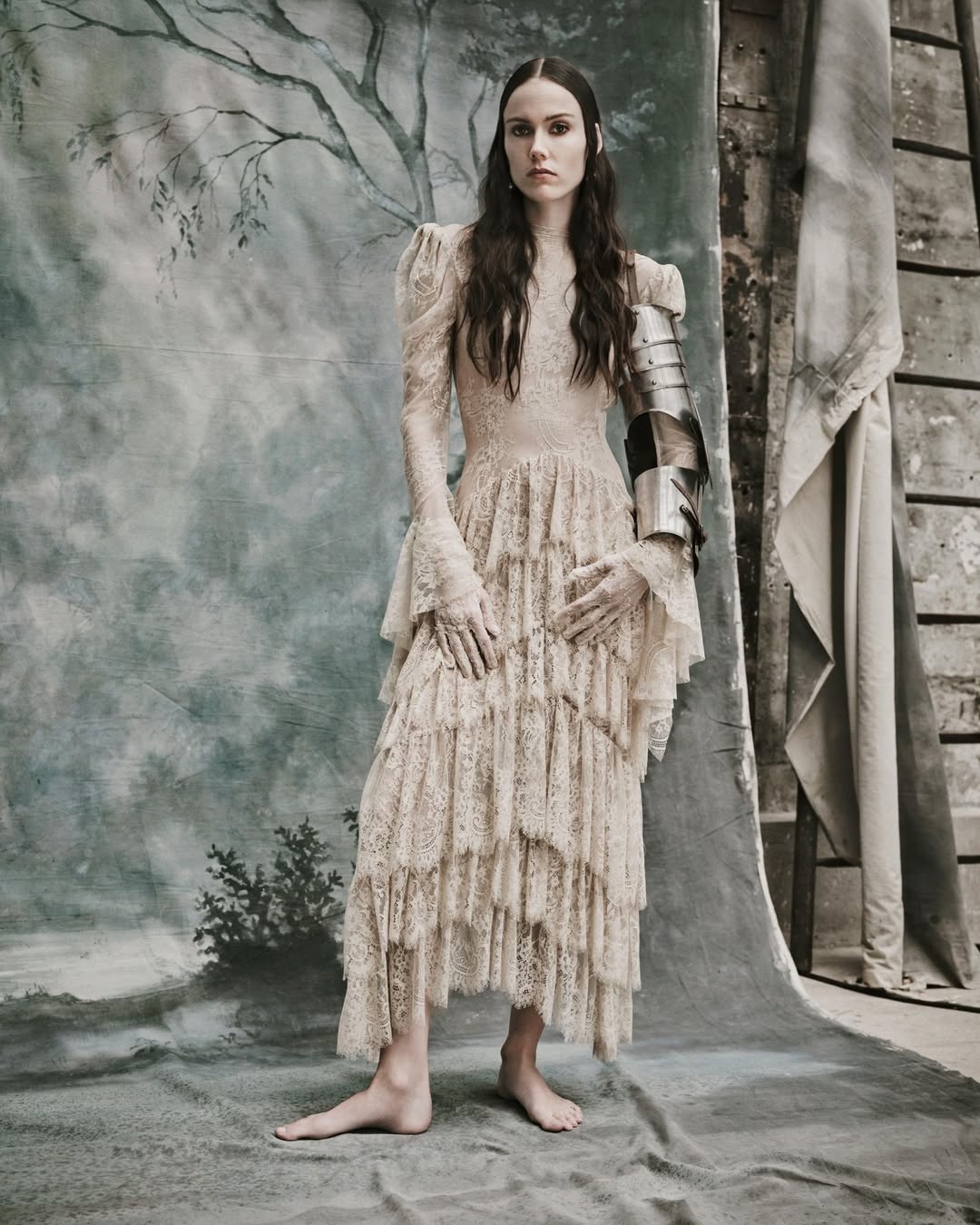 整個系列主打浪漫與堅毅並存,像是以萊賽爾纖維(再生纖維素纖維)製成的蕾絲中長洋裝,就以蓬袖、立體領片與波浪袖口帶出了柔和的層次感;而不對稱蕾絲襯衫則透過蕾絲拼接與弧形下擺,展現 Zara 對細節的拿捏。