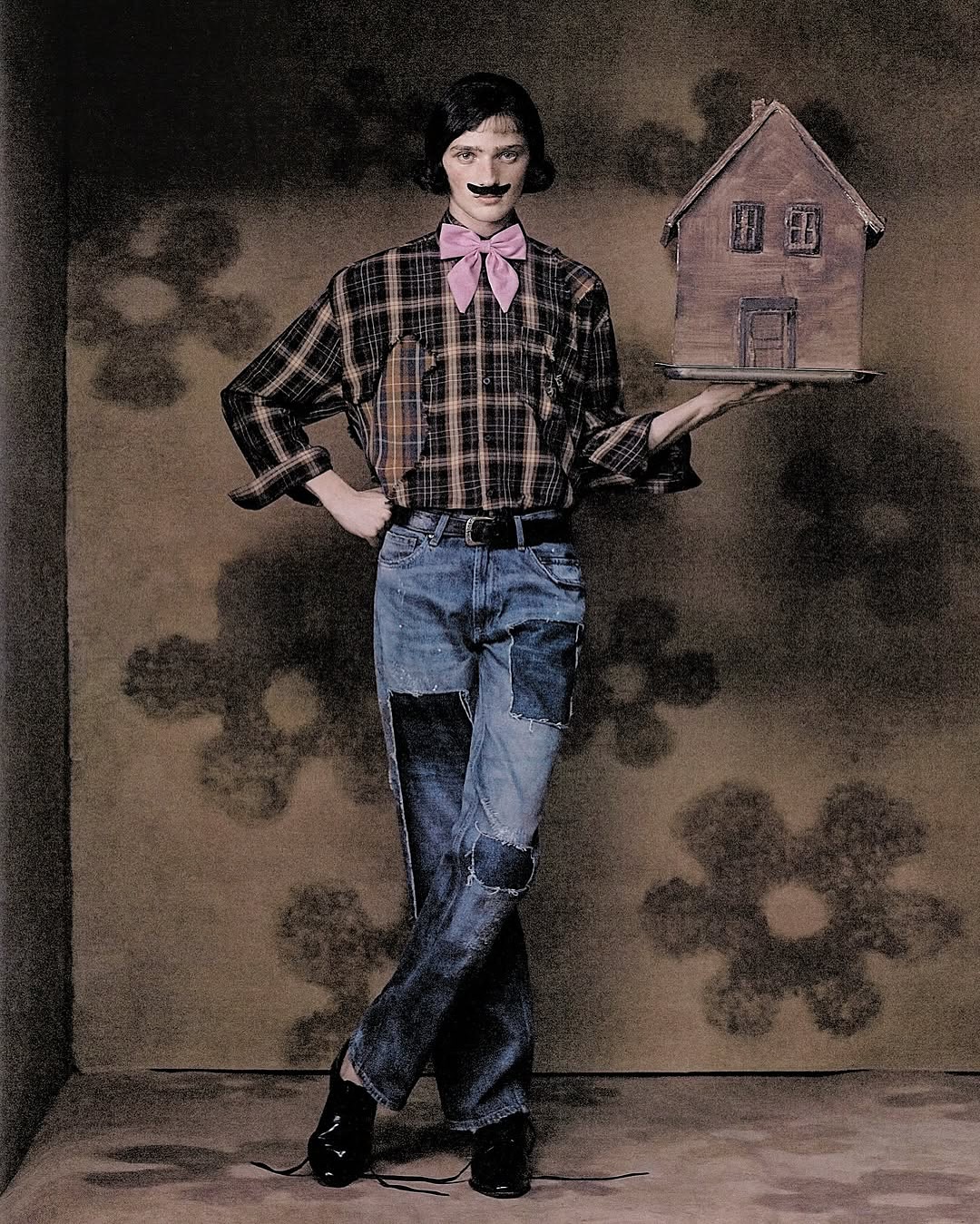 另一個焦點是牛仔單品,有打摺短版牛仔外套與做舊感牛仔襯衫;牛仔連身裝則結合了翻領與束袖設計,簡約又好看;還有另外兩款低腰寬版牛仔褲,一條是拼接款,一條是破壞款,不僅重新定義了經典輪廓,也展現出街頭與結構間的平衡。