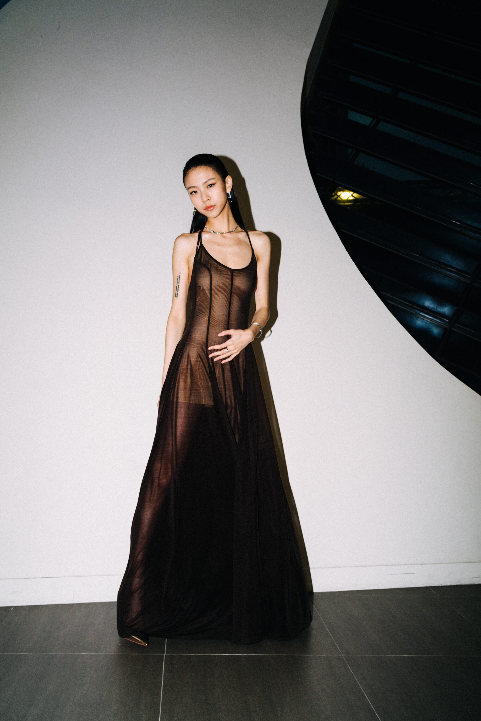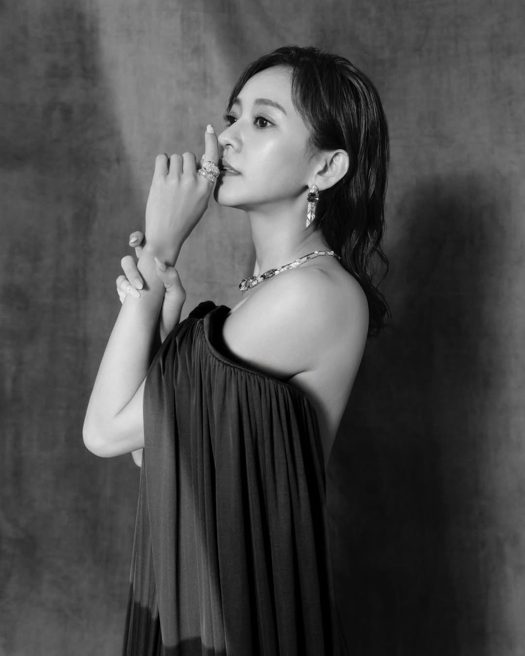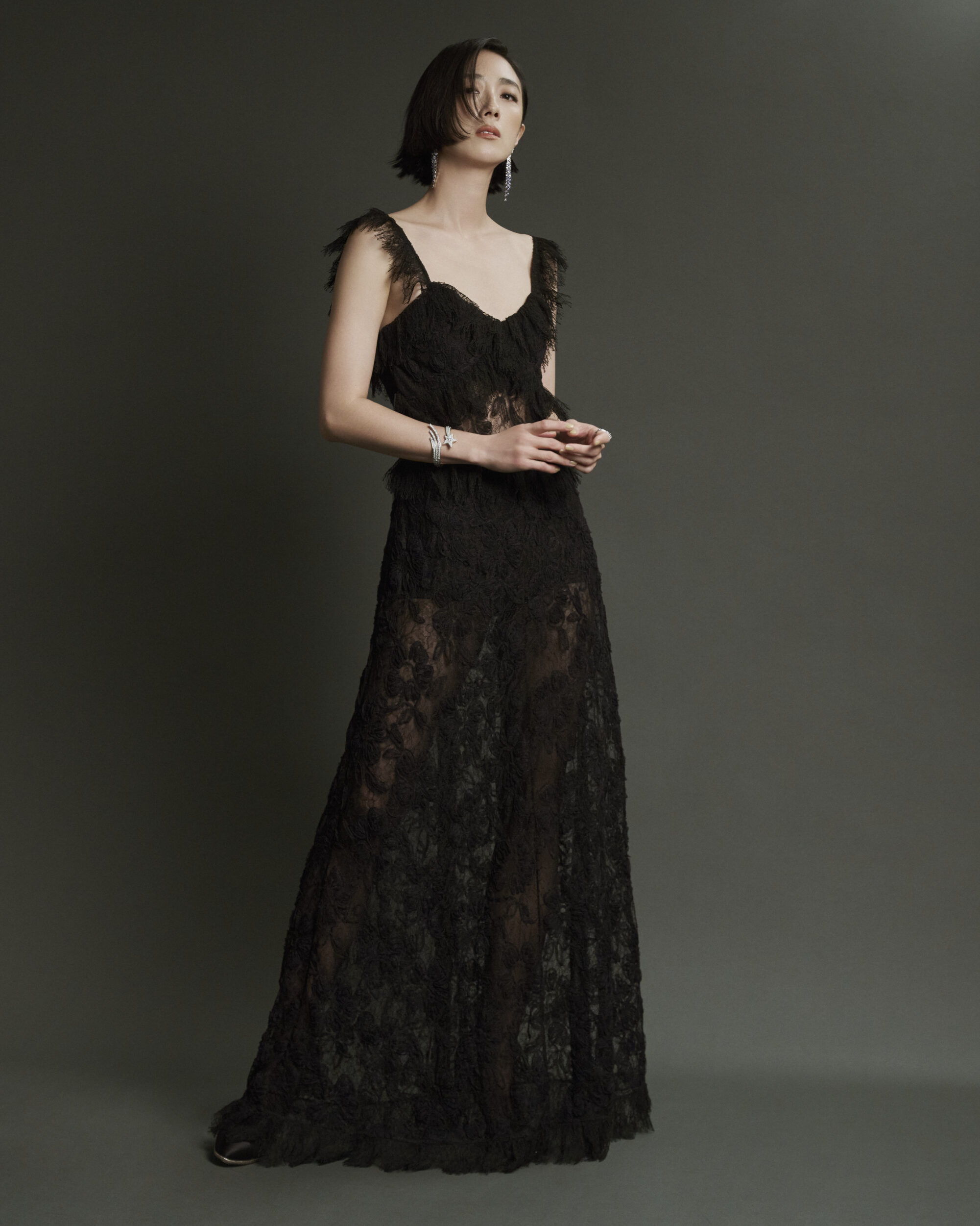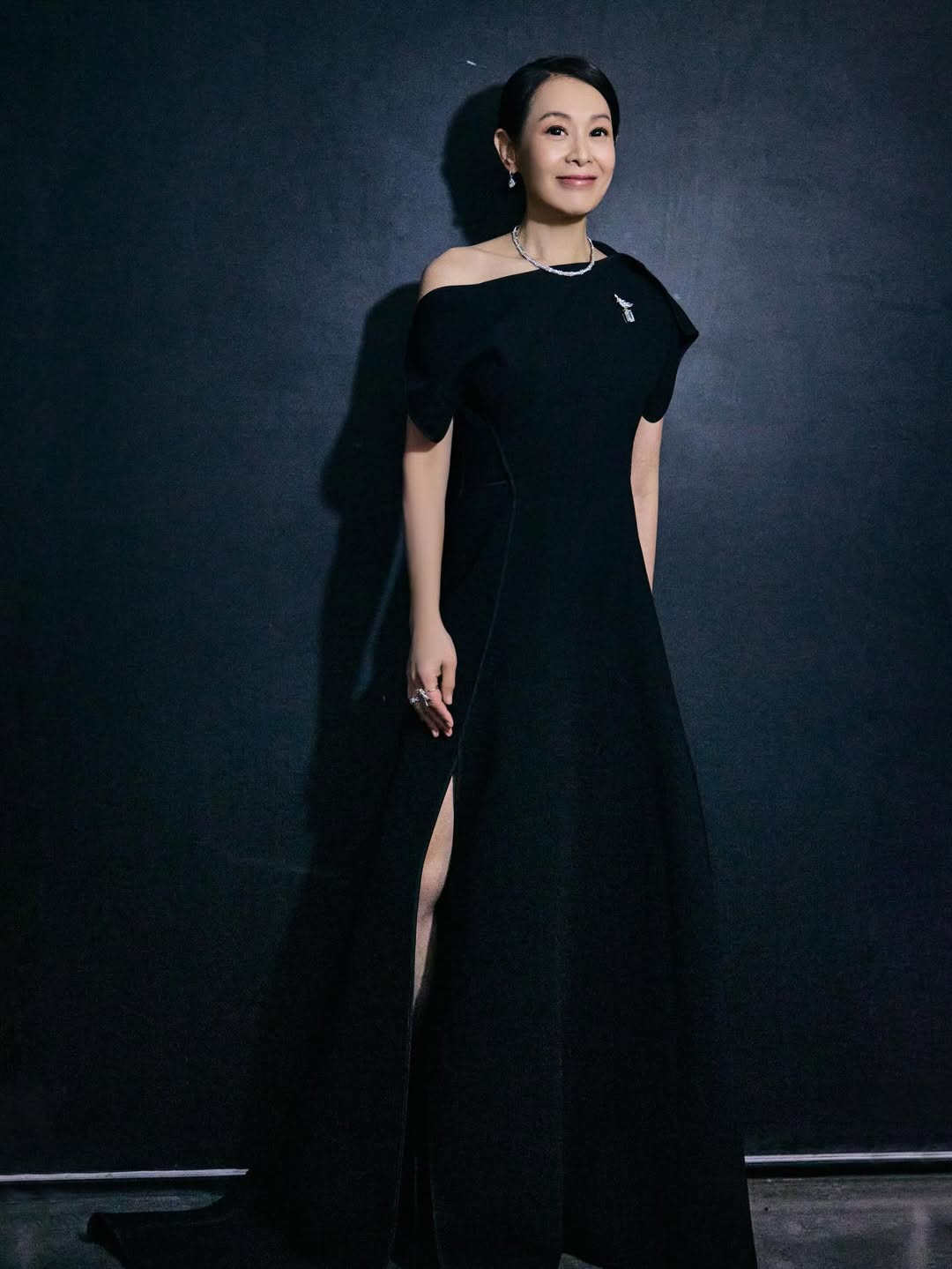 頒獎典禮上,桂綸鎂換上另外一套黑色禮服,來自 Nicole + Felicia 的設計,風格轉為簡約俐落,佩戴 CHANEL 頂級珠寶 RUSSE 圖騰耳環與 LUNE TALISMAN 戒指。