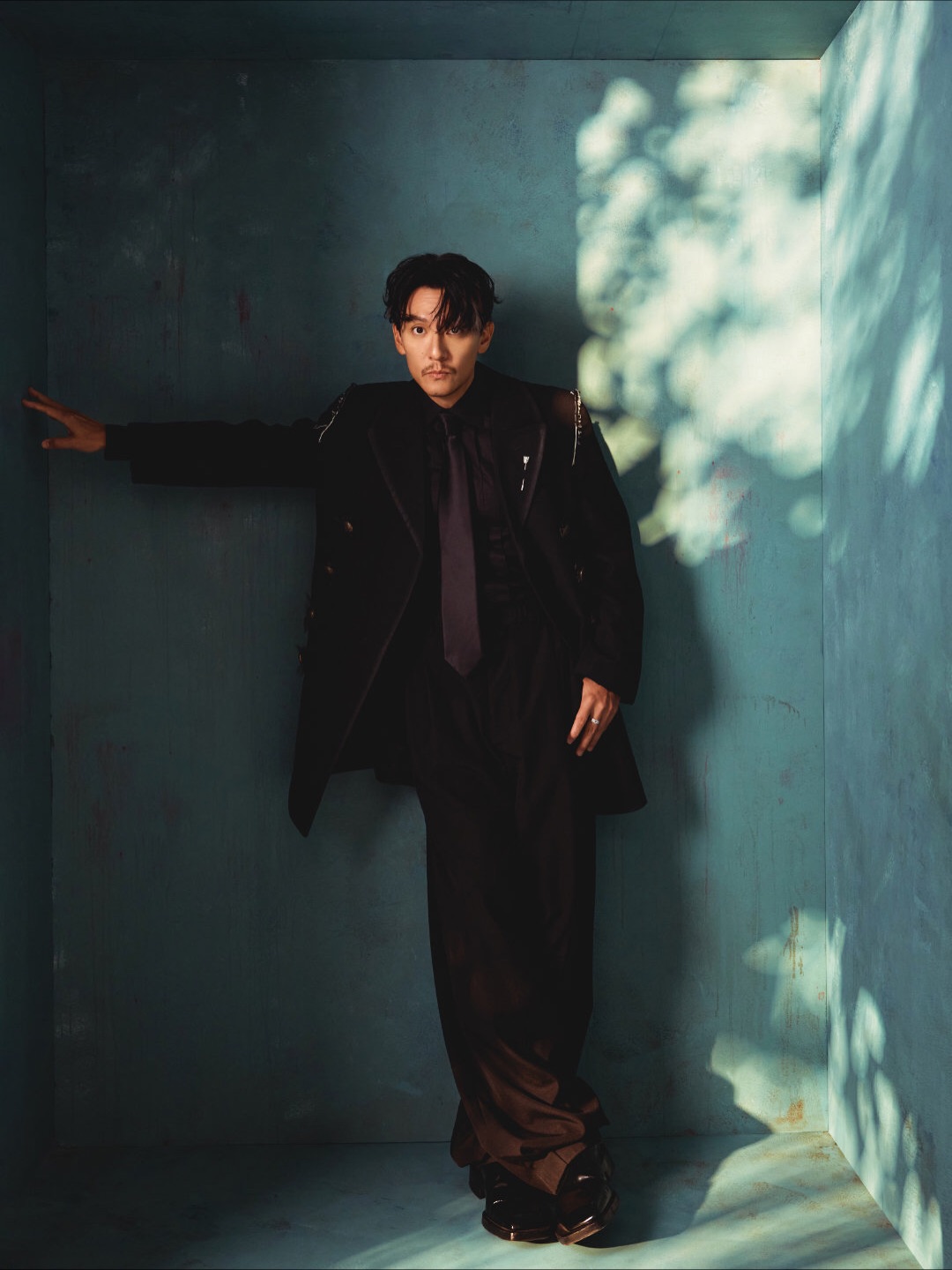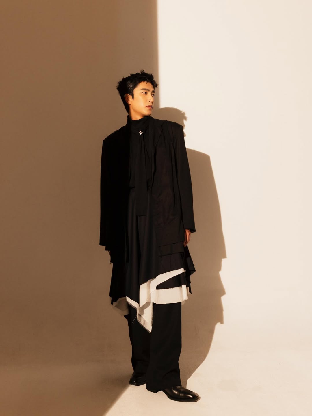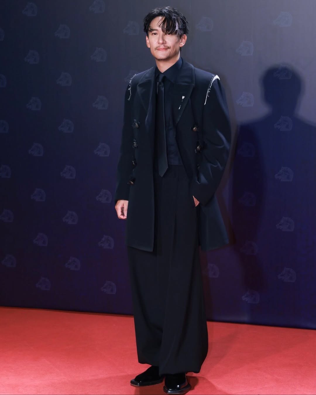 典禮上他選穿了設計師品牌 Rhyzem 黑色連身西裝裙與長褲,並搭配 Boucheron Quatre