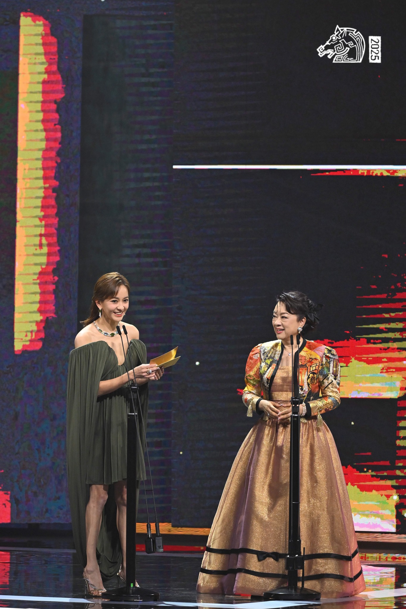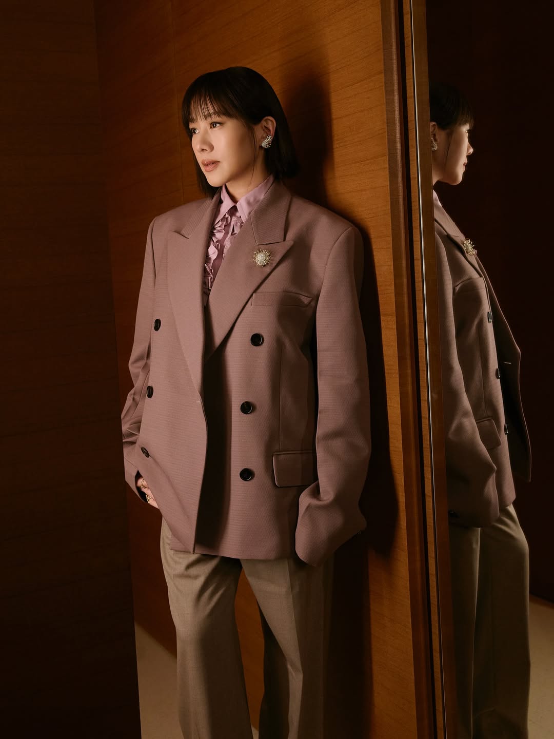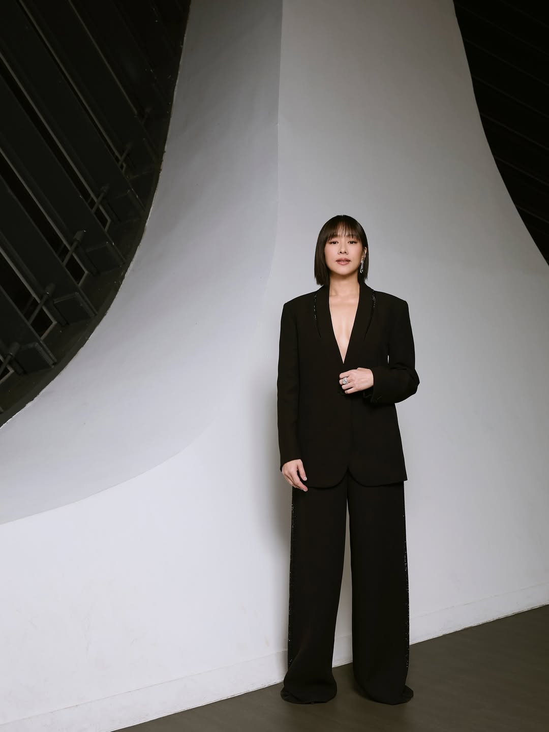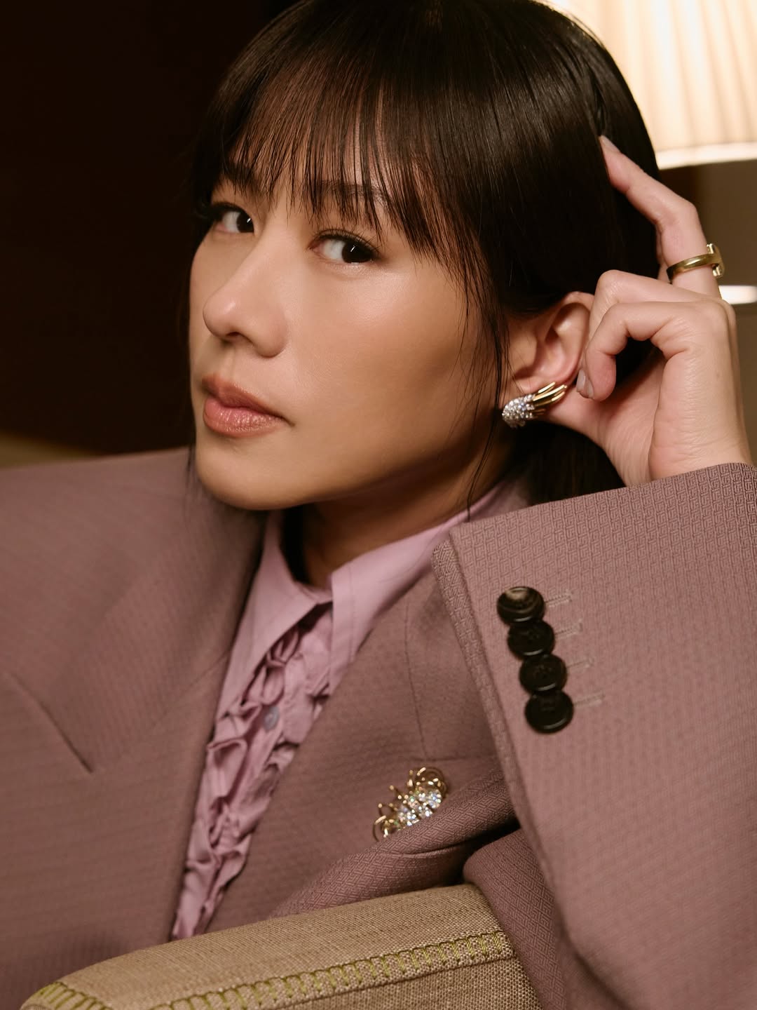 同樣都是西裝,穿起來風格大不同,頒獎典禮時,林嘉欣換上 Giorgio Armani 2025 秋冬系列西裝套裝,並大膽單穿外套,深 V 領口相當性感,同時又不失帥氣個性,並搭配 CHANEL 頂級珠寶 GOLD SLIDER BLACK & WHITE 耳環與 GOLD SLIDER 戒指。