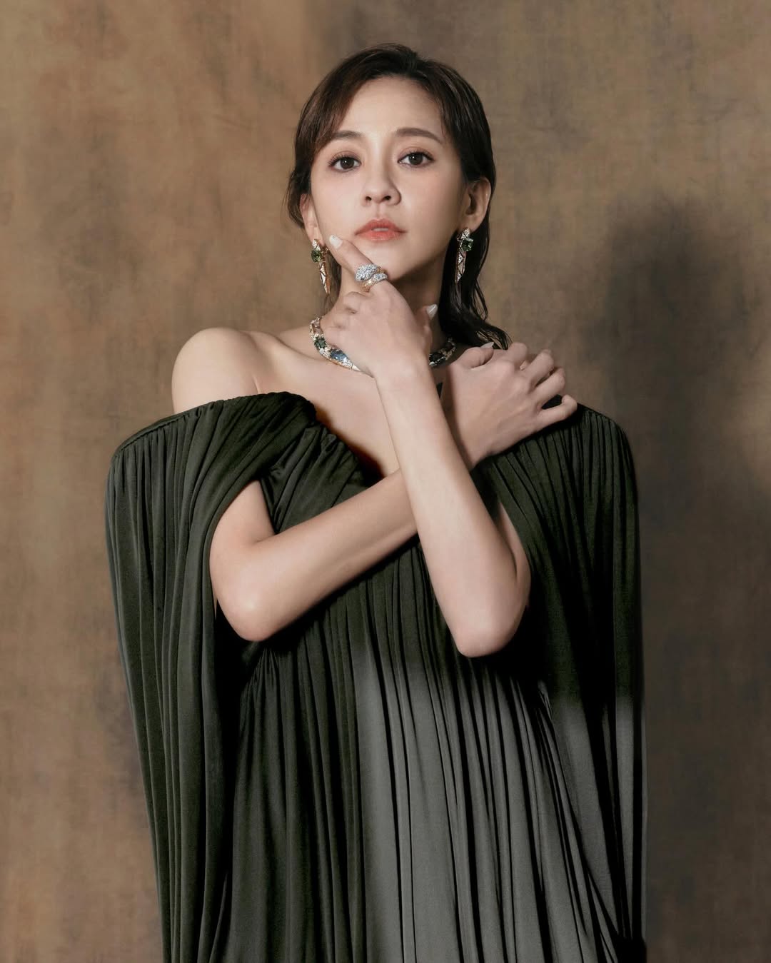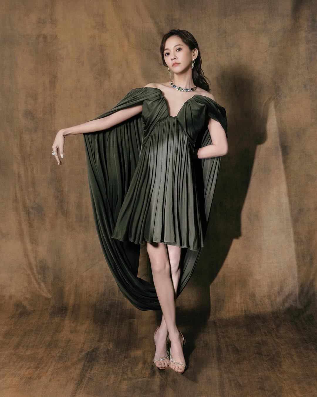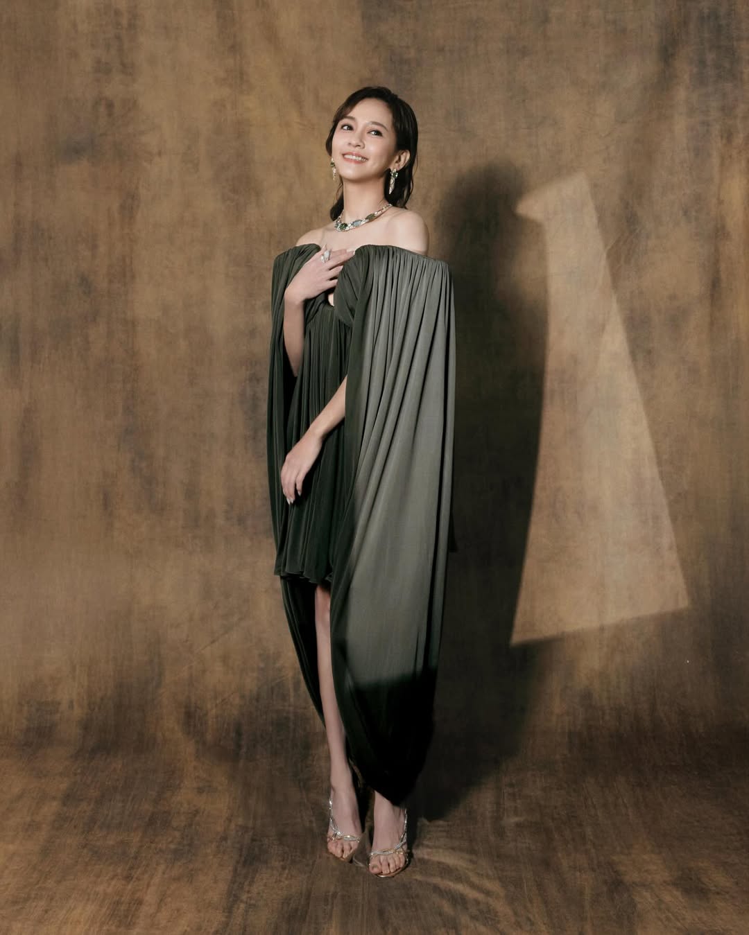 陳意涵身為頒獎嘉賓,身穿 LOEWE 綠色洋裝出席,搭配同樣綠色調的 BVLGARI 珠寶項鍊,在一片深色系的禮服中尤其吸睛,不僅顏色特別,披風設計也相當別緻,令人眼睛為之一亮。