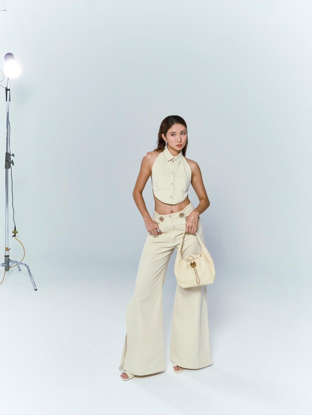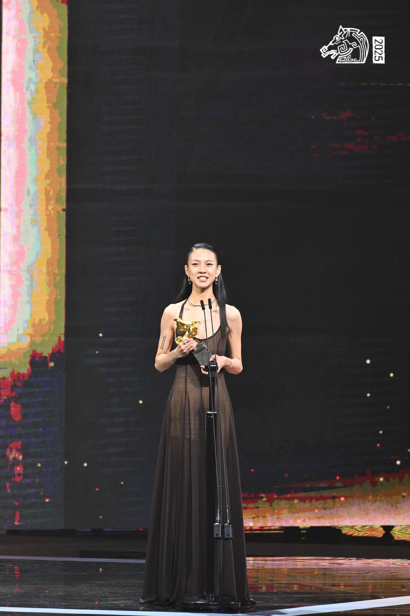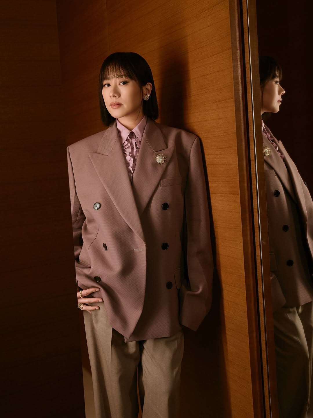 9m88 以《大濛》入圍最佳原創電影歌曲,身穿 CHANEL 2025/26 Cruise 度假系列淡黃色套裝亮相,以丹寧短版繞頸上衣搭配淡黃色牛仔褲,佩戴 CHANEL 頂級珠寶 RUBAN 耳環、KNOTTED N°5 戒指以及 PREMIÈRE HYPER LUCKY STAR 腕錶,淺色套裝在群星之中顯得格外耀眼。