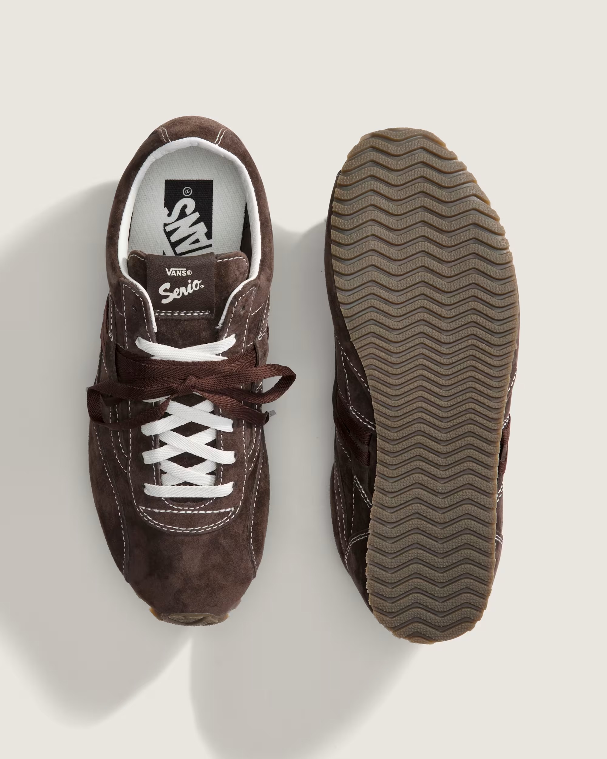 一眼就被 Vans 這雙深棕色薄底鞋抓住目光,Premium Super Lowpro Trainer 靈感源自 Vans 1980 年代的經典檔案,薄底結構搭配麂皮材質,加入白色縫線增添細節,還有雙色鞋帶設計,完美融入復古風格與日常實穿性。