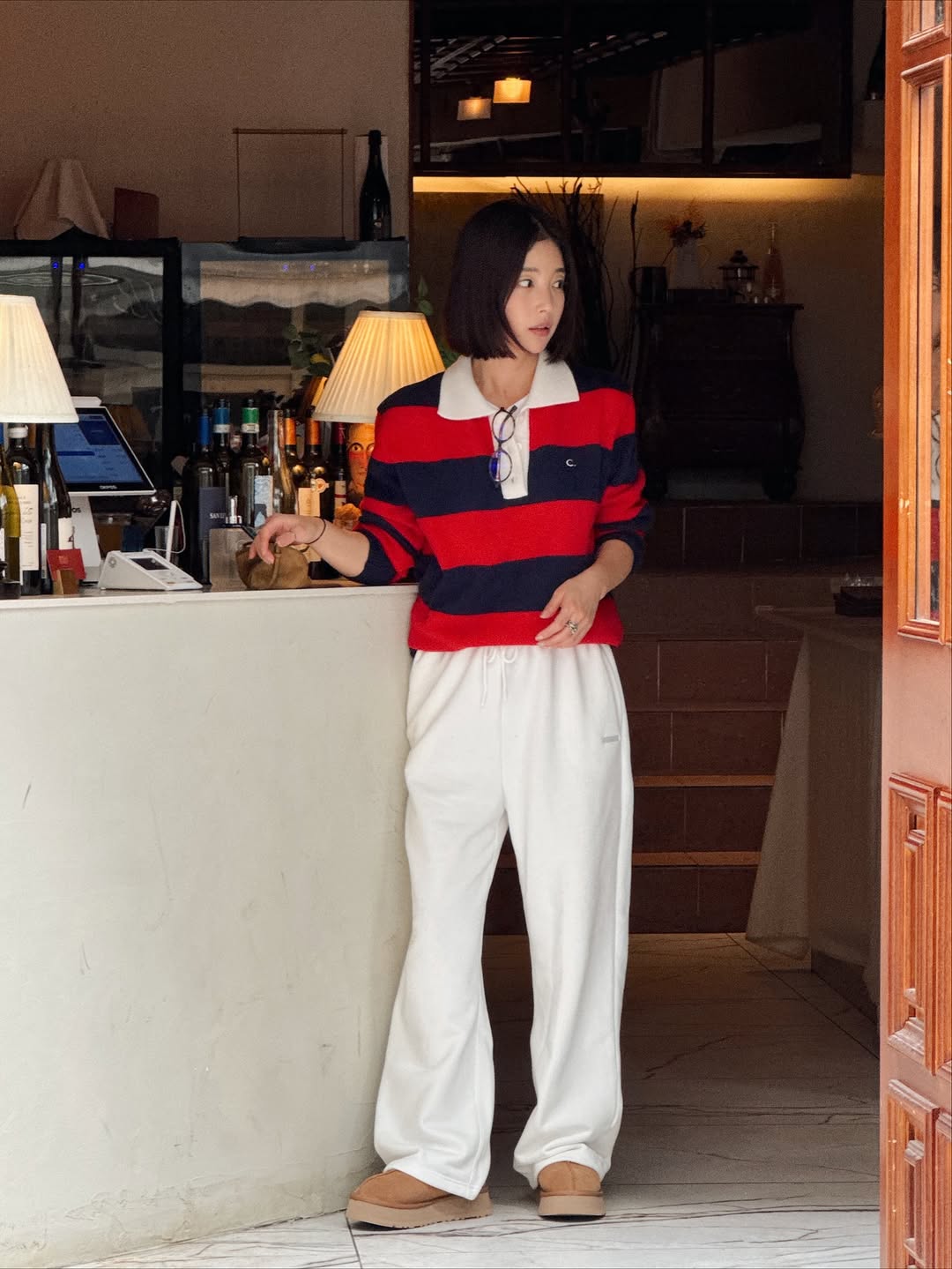 都說她剪短後多了點復古氣息,連帶著穿搭也有點懷舊感了呢,最近的條紋 Polo 衫在她的穿搭頁面中出鏡率極高,尤其是粗條紋款式,搭配褲裝,紮進去穿,休閒俐落,散發不不經意的時髦感,一眼就很抓人目光。還可以學學她多加一件披肩,讓造型更有層次感。
