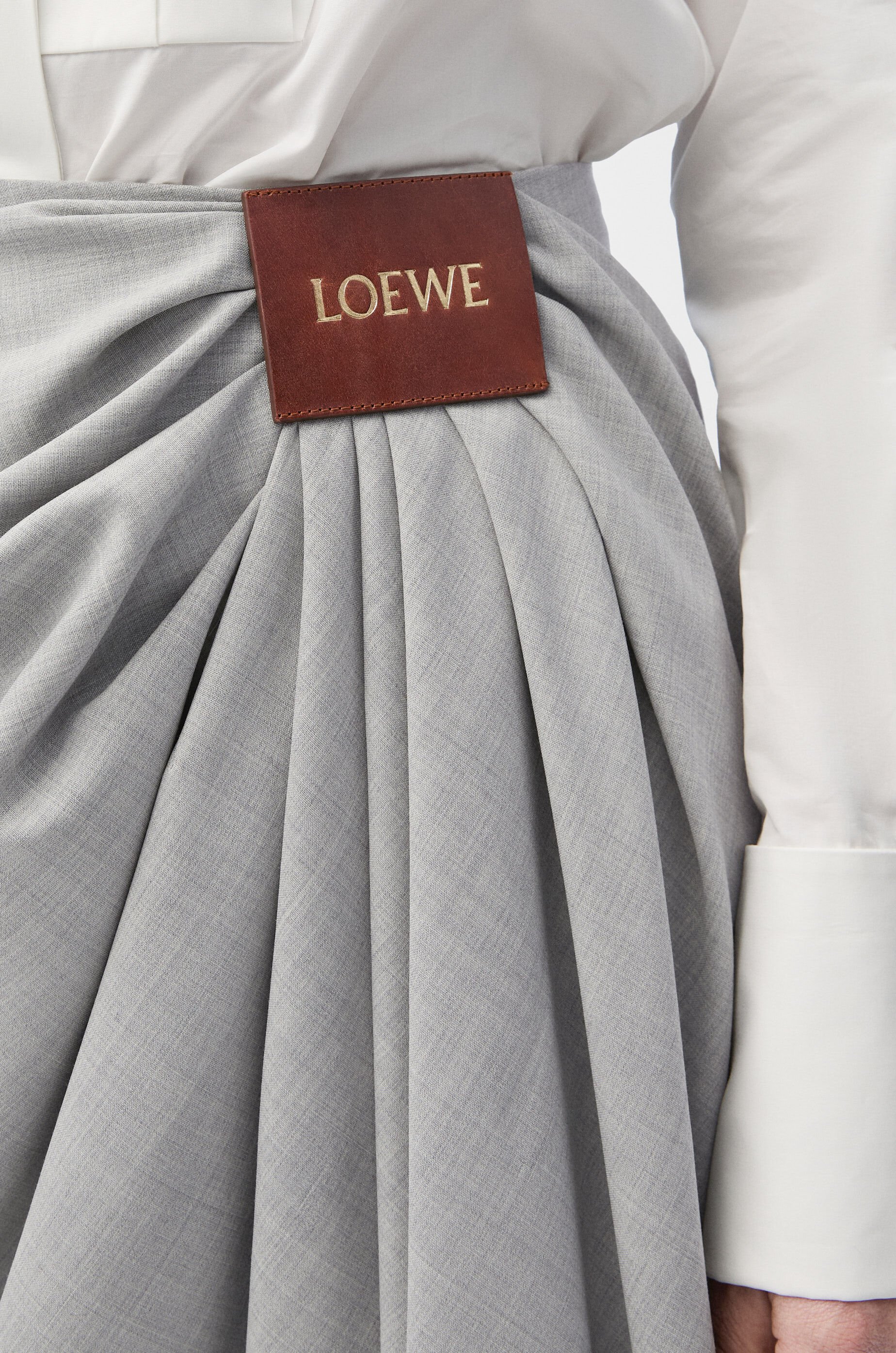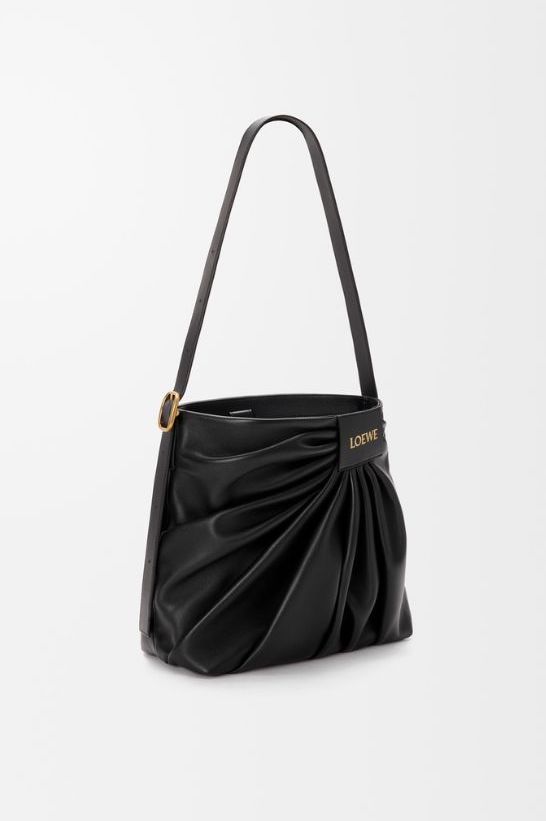 現在,這樣的設計語彙也延伸到了包袋上,官網全新上架的 Draped Tote 正是從前兩季的「垂墜造型」演化而來的,透過柔軟的 Nappa 小羊皮塑造出自然下垂的包身線條外,包面中央輕盈的褶皺,更是彷彿在動與靜之間擺盪,而金色壓印的 LOEWE 字樣也為低調的輪廓注入了力量。