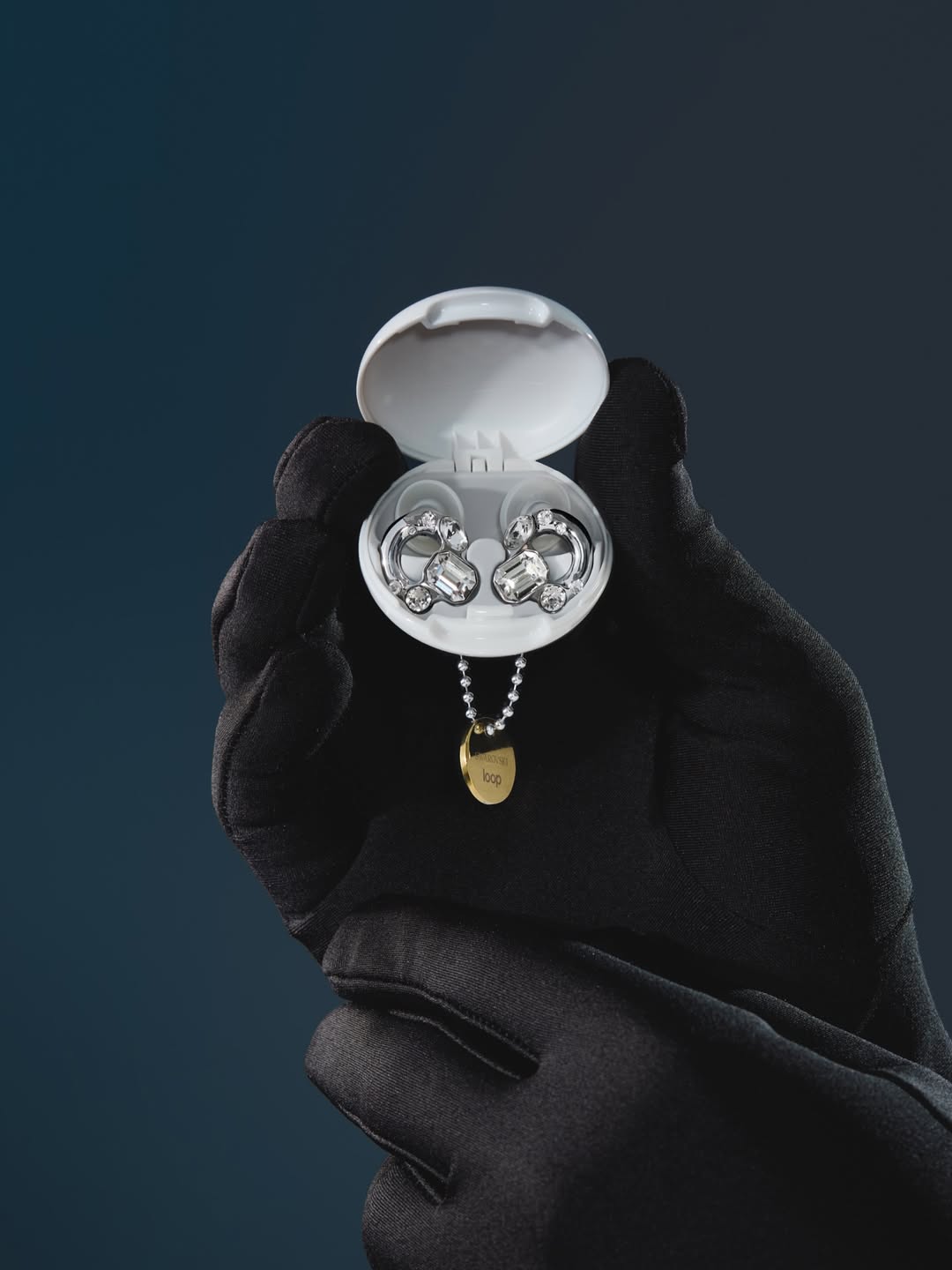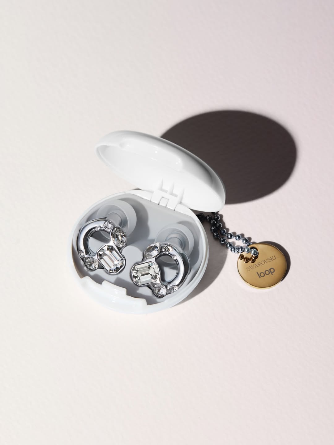 這些水晶被固定在光面鉻合金的 3D 列印邊框中,將 Loop 耳機流線型的聲音過濾技術,融入 Swarovski 美學外,每一對耳機都還配備有一個客製化設計的收納盒,上面點綴著一個精緻的 Swarovski 吊飾,從裡到外都透露著奢華感。