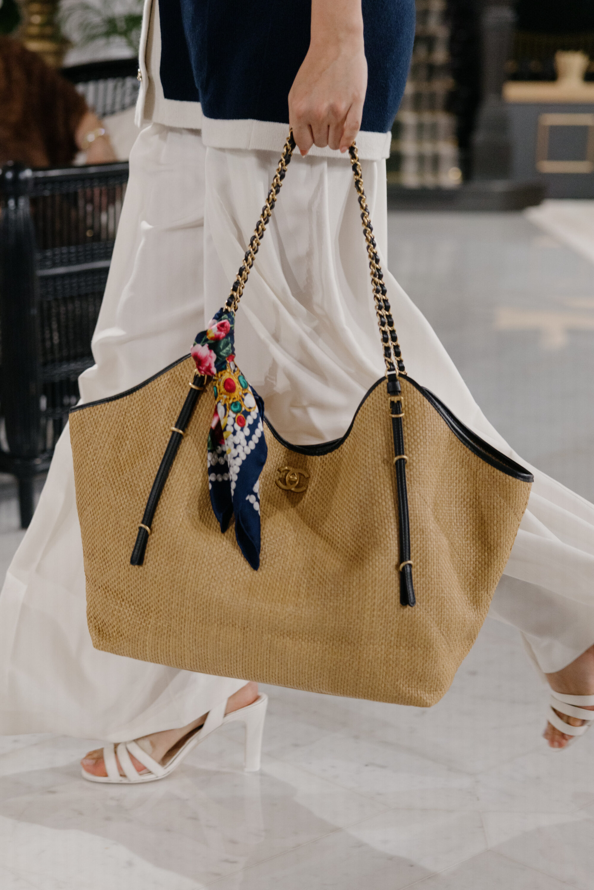 配件部分,也帶來多款充滿度假風情的設計,包含藤編/草編包和草帽,以及髮間、手腕和腳踝還出現許多絲緞方巾,讓整體造型更靈動隨性,展現度假時尚的自由與優雅。