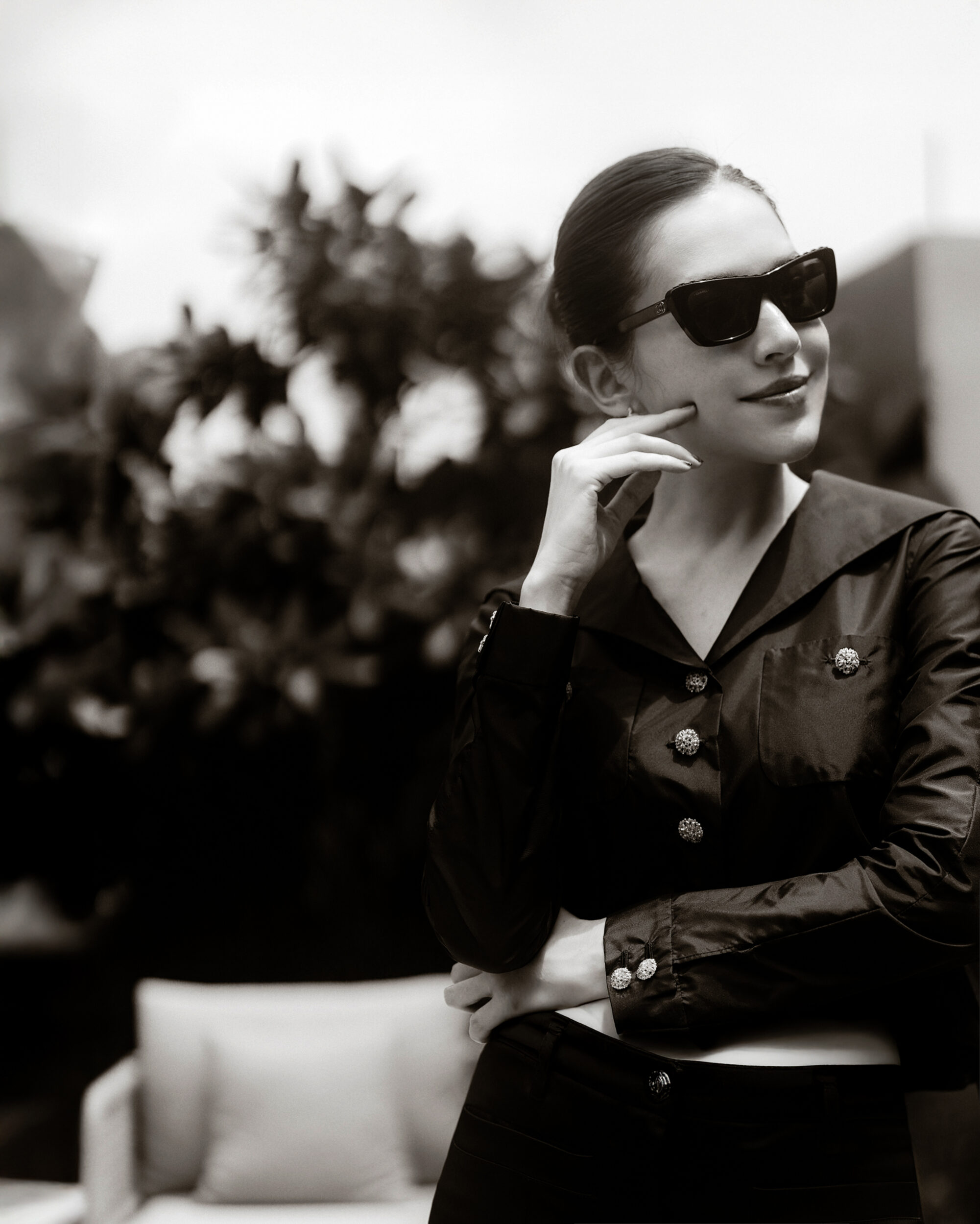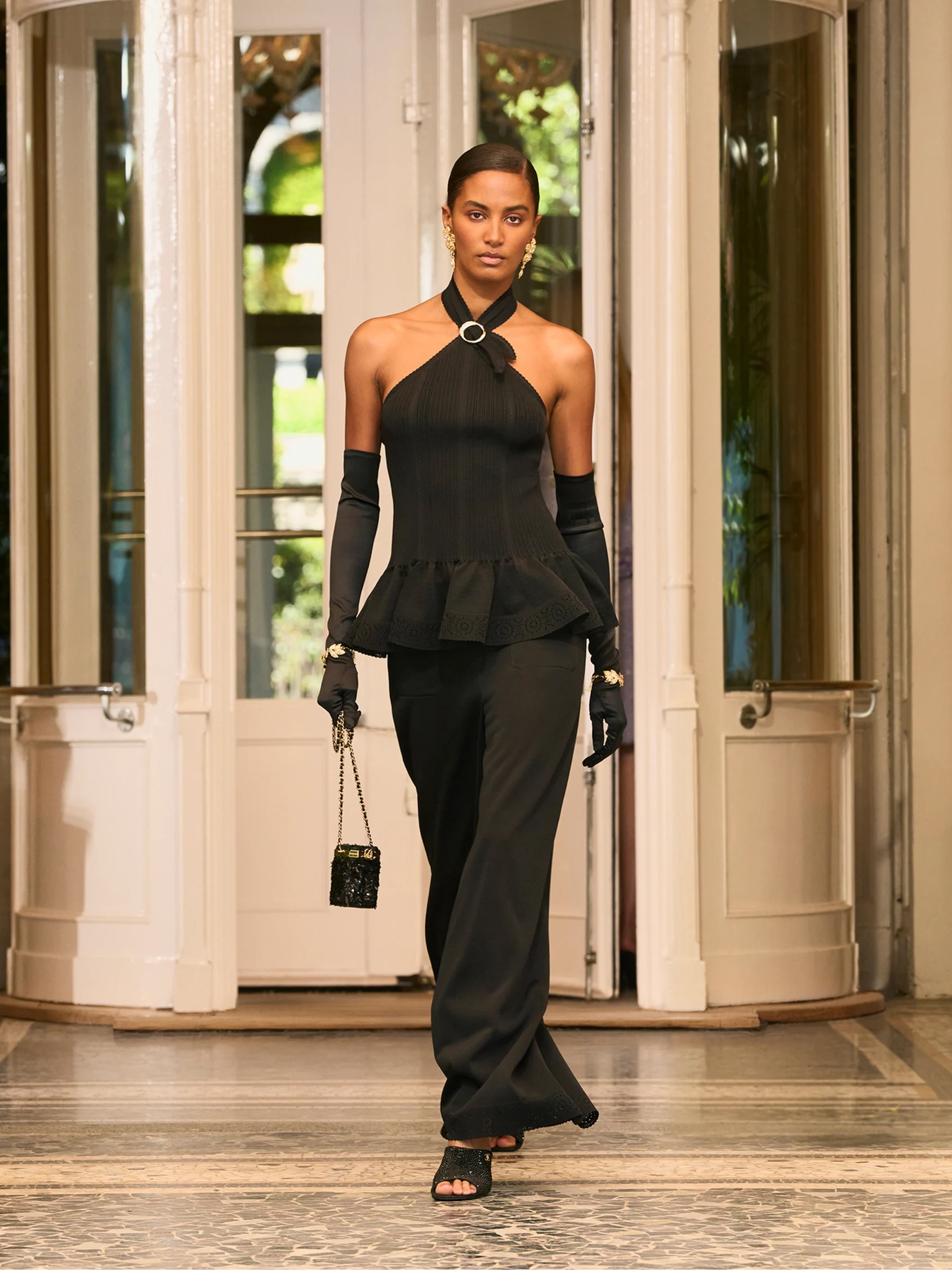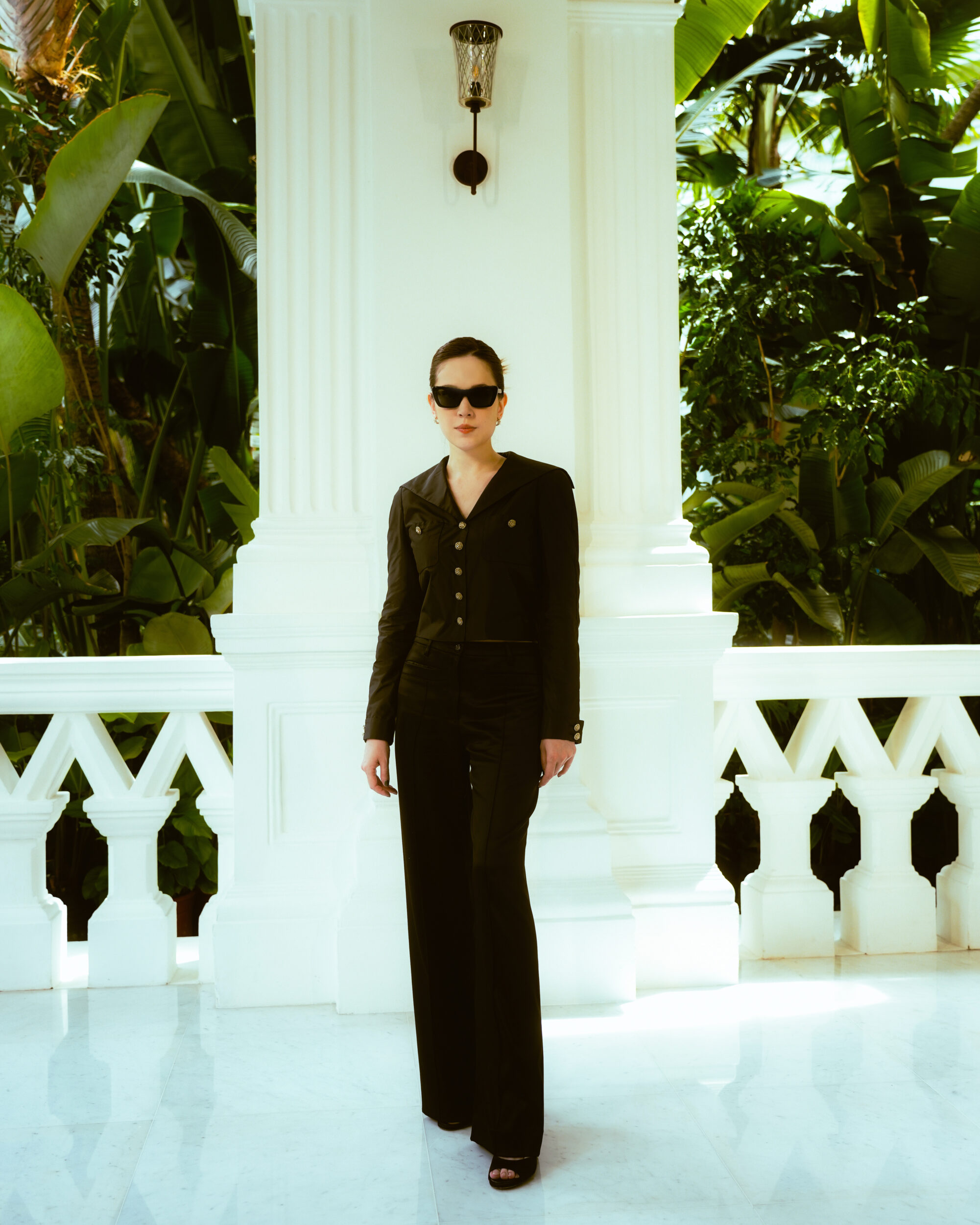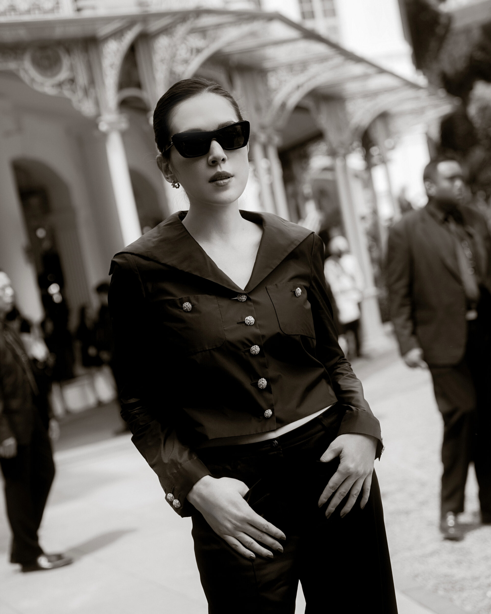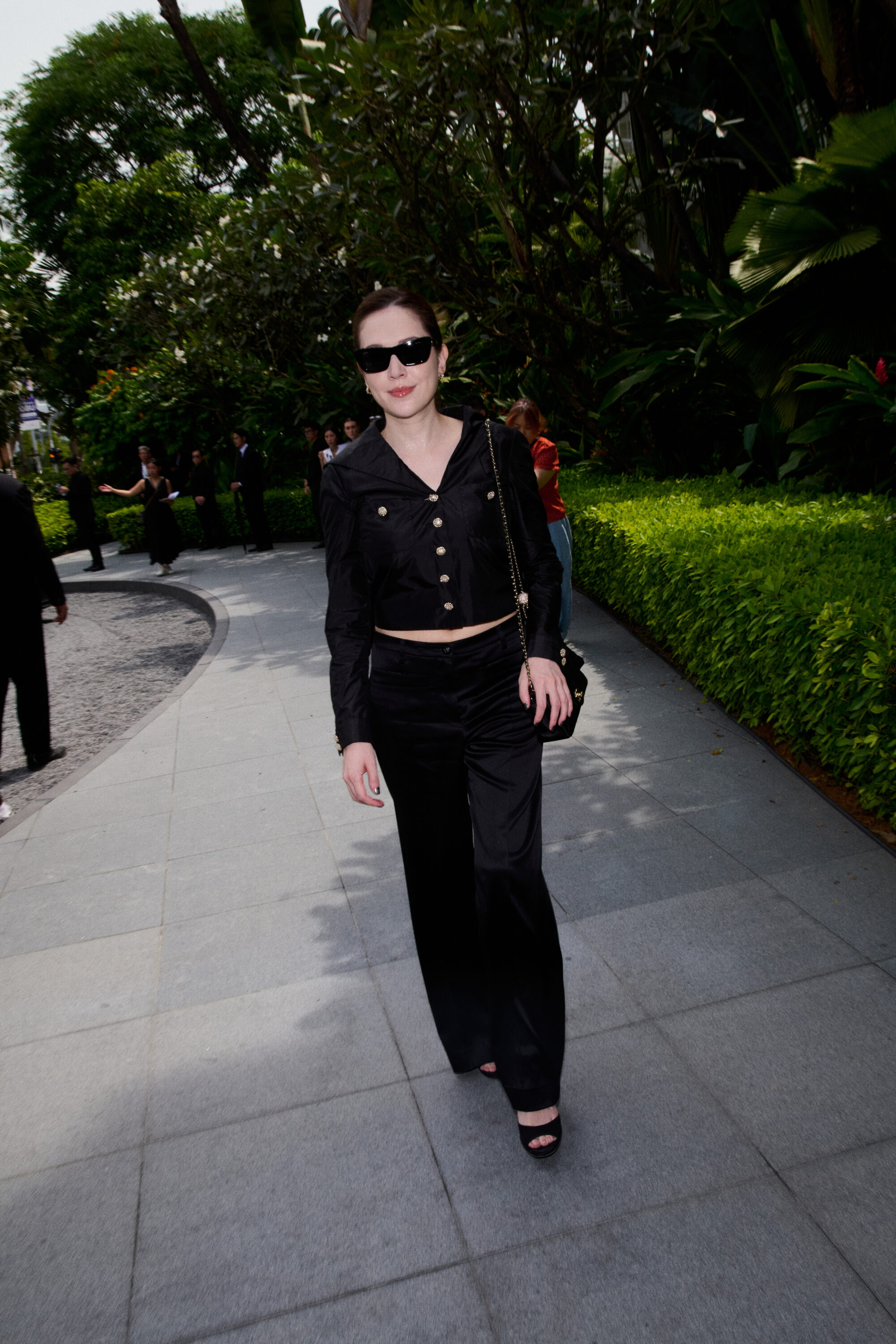 大秀當天,許瑋甯梳起俐落的 All-back 頭,架上一副超有氣勢的黑色墨鏡,並以 2025/26 Cruise 度假系列的短上衣搭配錦緞寬褲,換上全黑造型亮相。這款長褲材質輕盈,走起路來有種流動感;上衣剪裁則有點像風衣,背後還有小披風設計巧思,整體造型既率性又優雅,充滿女性力量與自信。