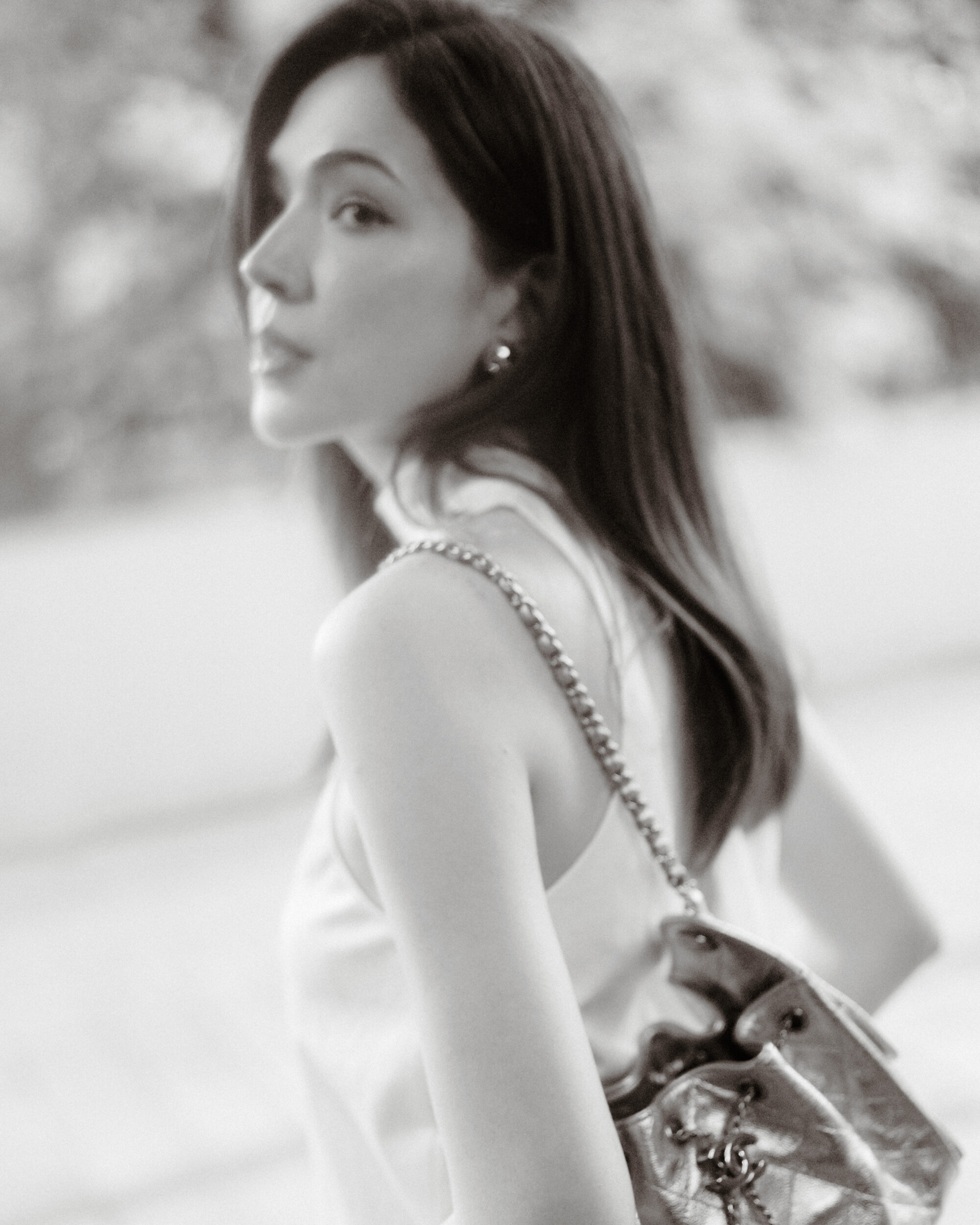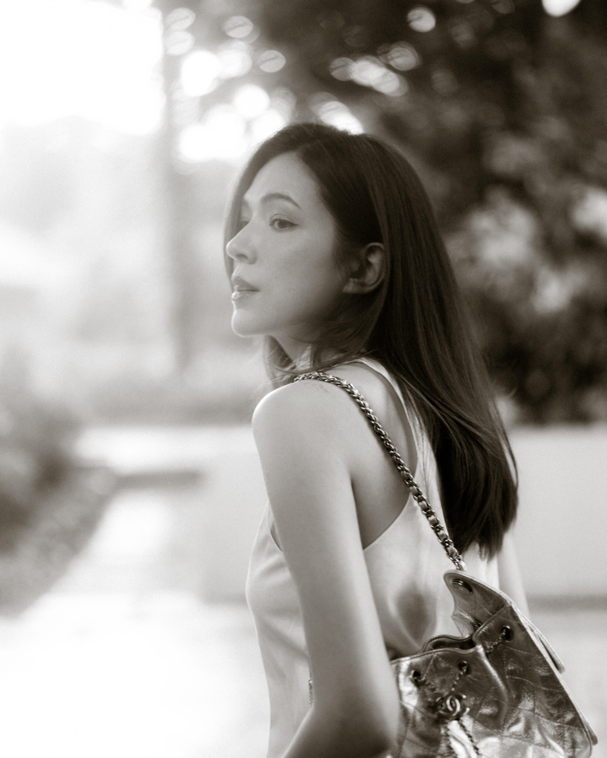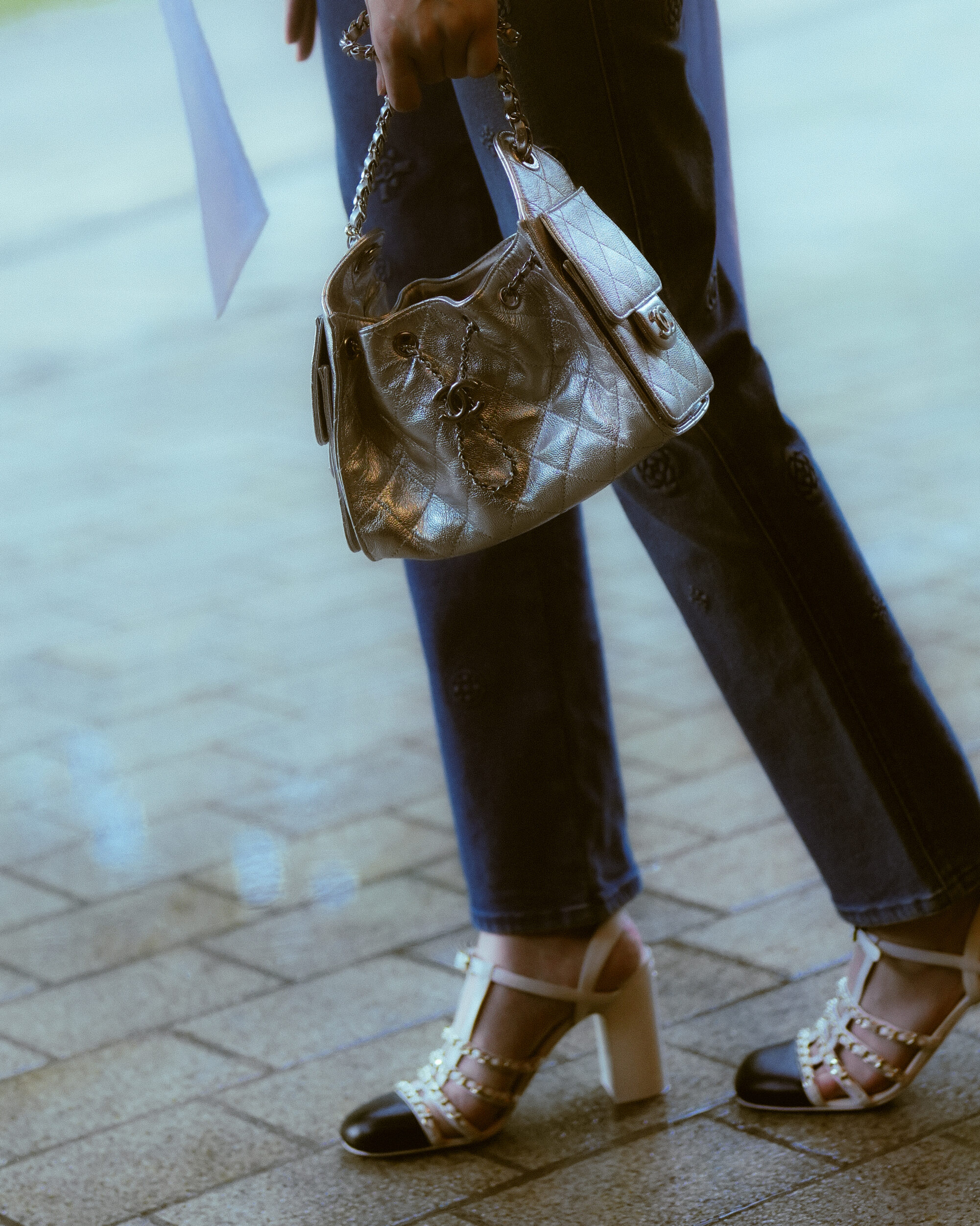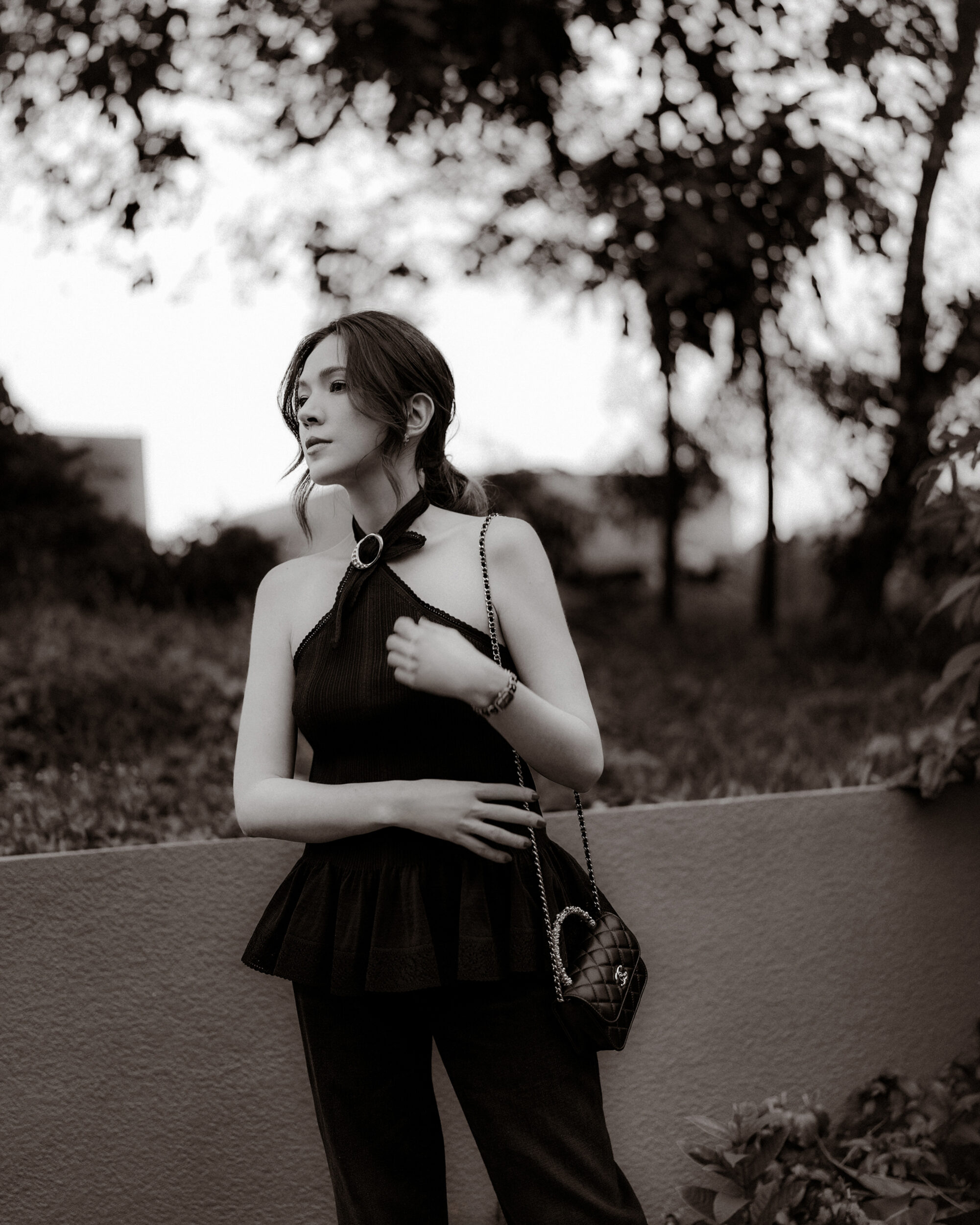 在剛抵達新加坡時,許瑋甯身穿 2025/26 CRUISE 度假系列的削肩上衣及牛仔褲,搭配銀色 CHANEL 25 迷你包款和黑白雙色皮穿鍊高跟涼鞋,一身休閒裝扮顯得輕鬆自在,也和新加坡的南洋風情相呼應。