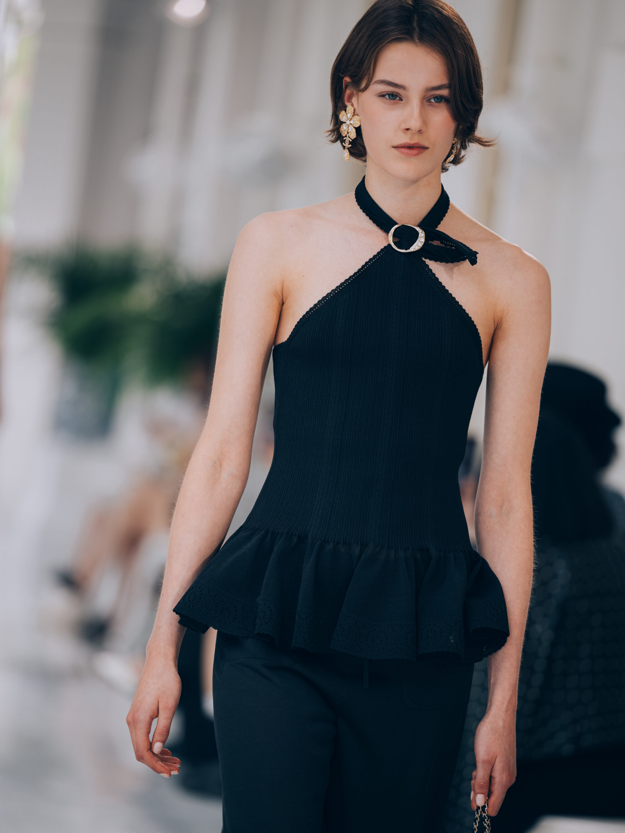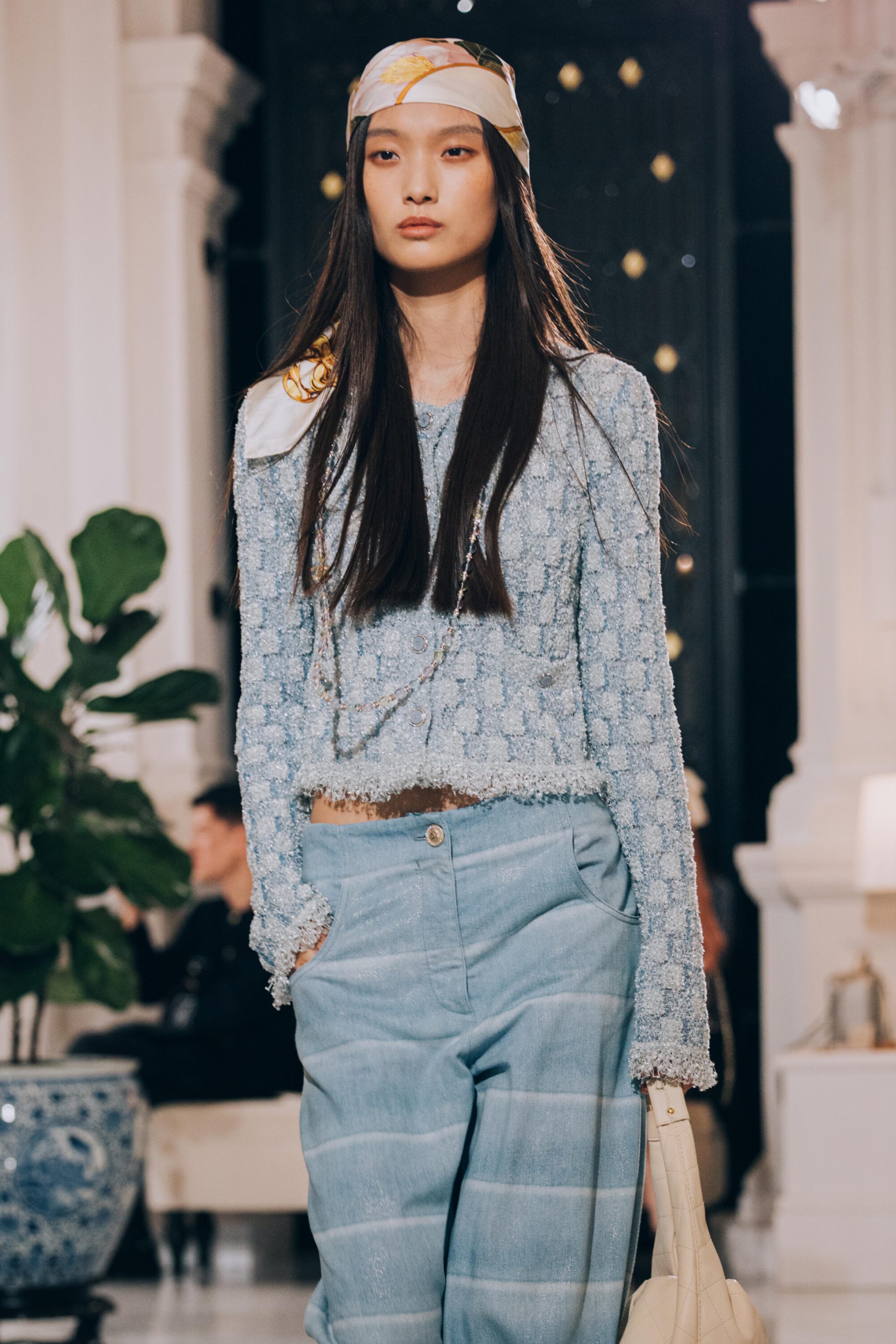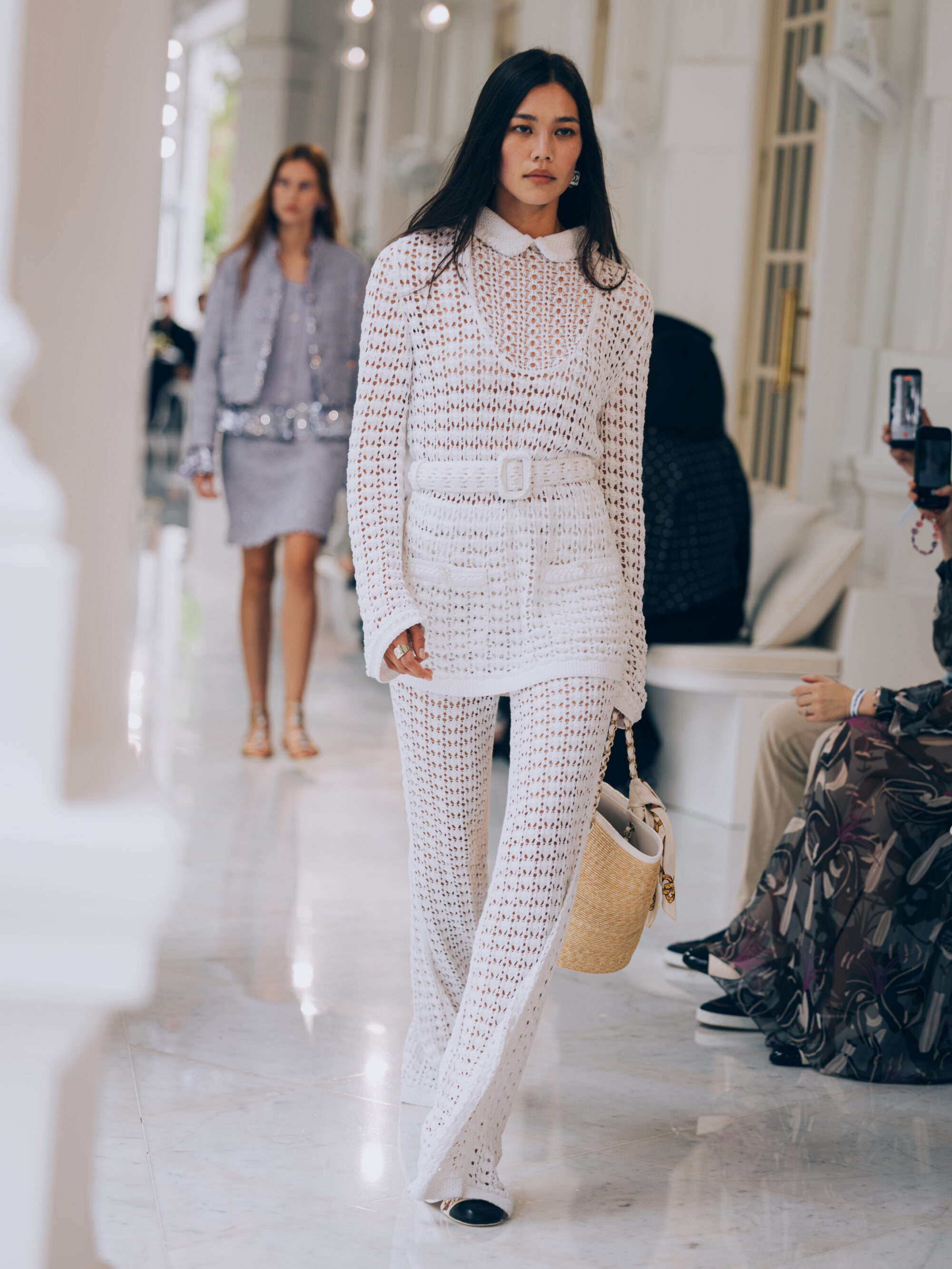 這一季,CHANEL 在悠閒與華麗之間找尋平衡,將華麗與休閒風格完美融合,柔軟的斜紋軟呢和金色盧勒克斯金屬絲(Lurex)被運用在褲裝和睡衣,還鑲滿刺繡亮片;明媚色彩與花卉圖案則延伸到了蕾絲和印花中,而經典的度假元素,像是白色直筒長褲、雙排釦海軍大衣與條紋等更勾勒出愜意的氛圍。