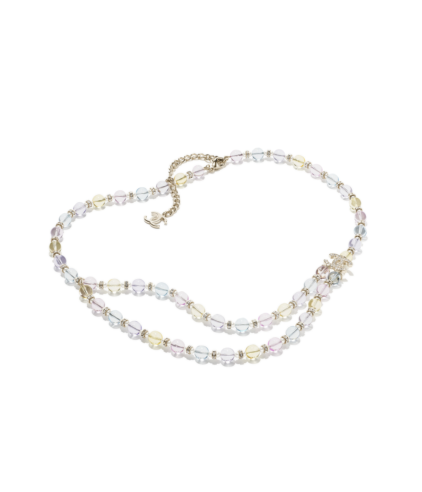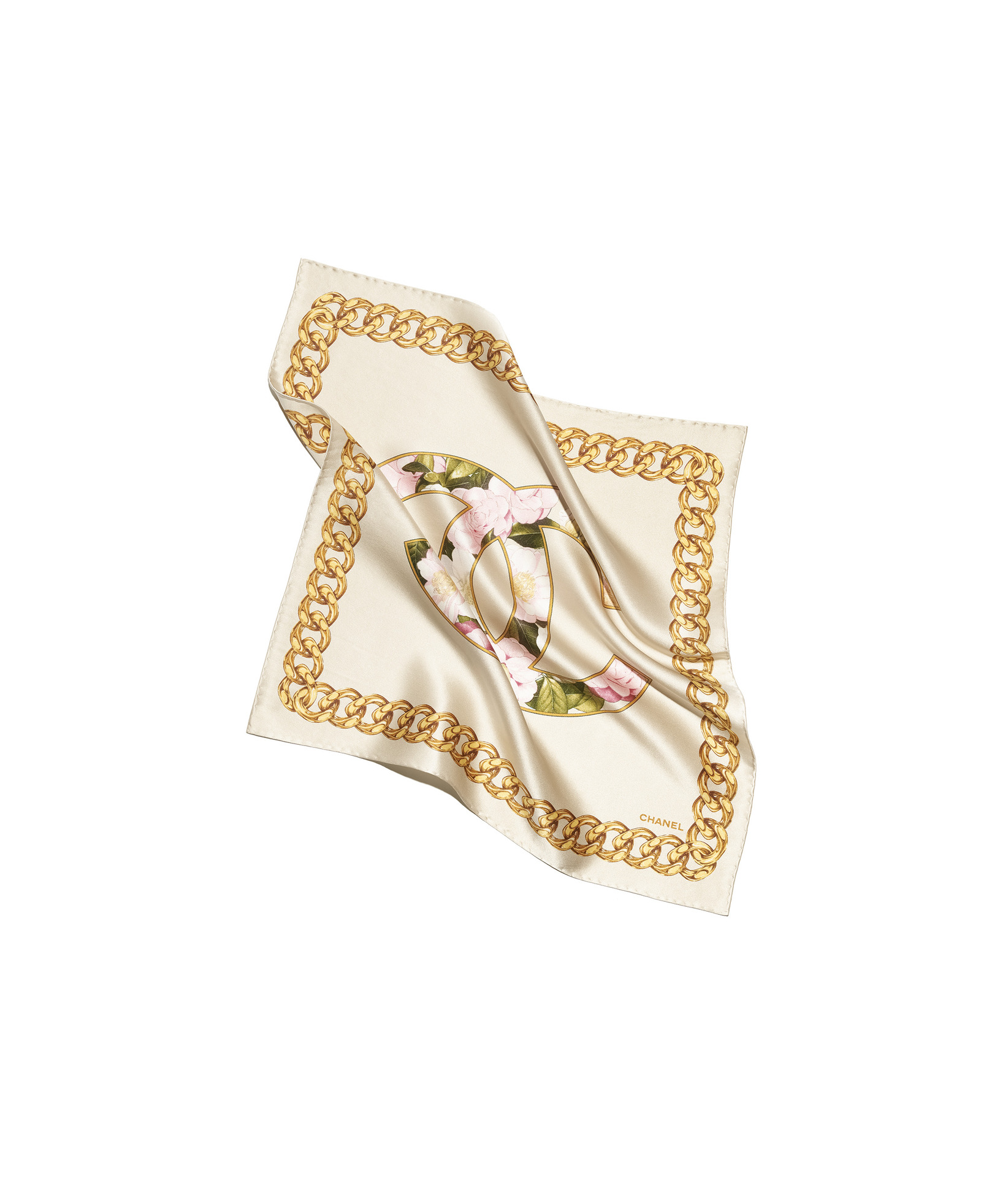 多彩飾以雙 C LOGO與山茶花圖樣方巾;多彩雙C LOGO飾以珠飾腰鍊