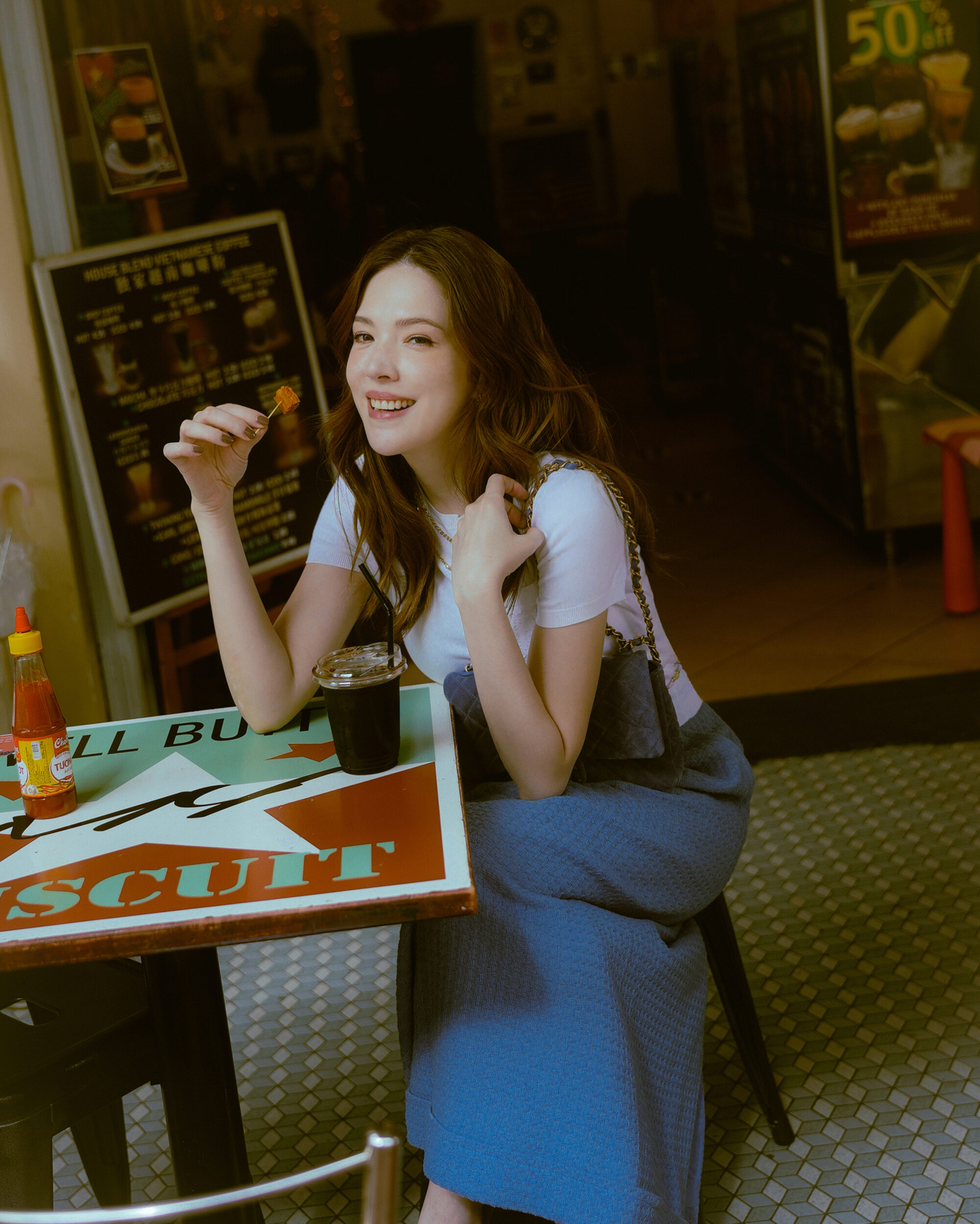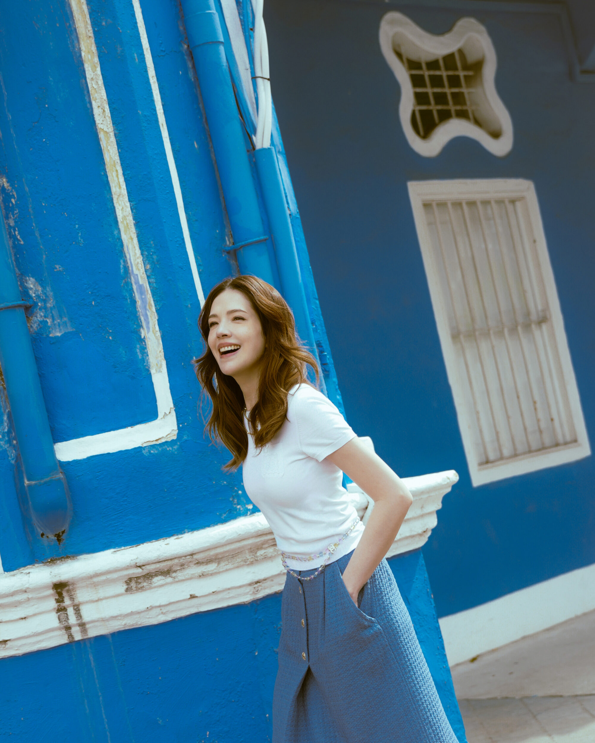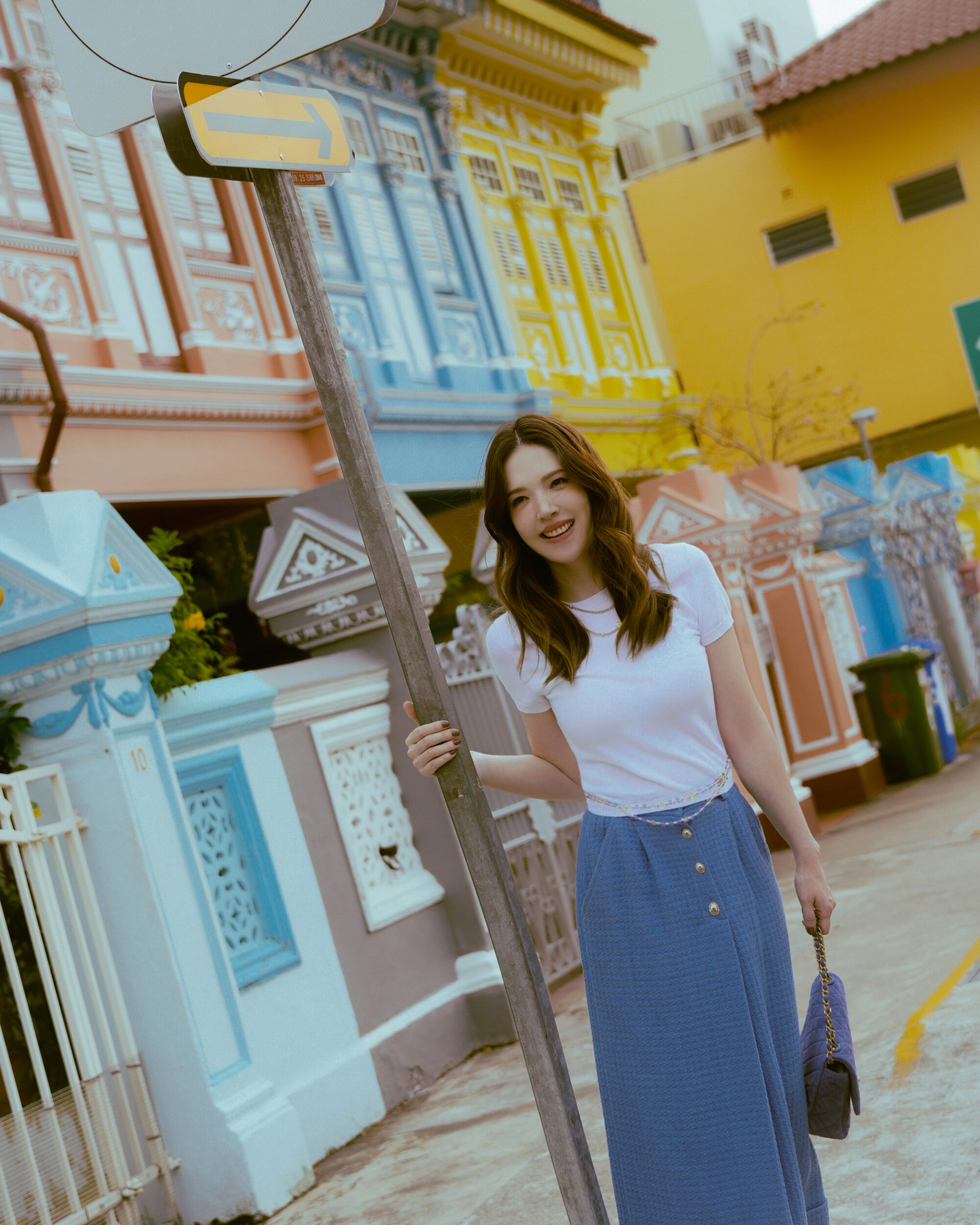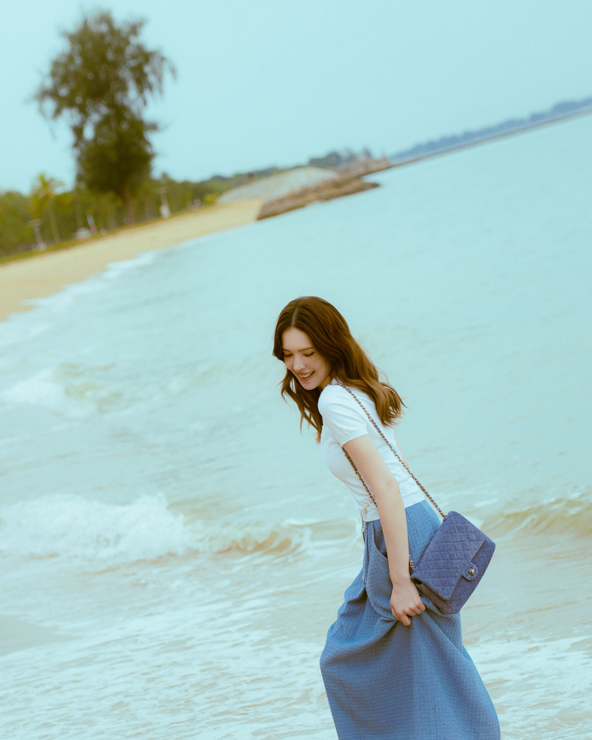 在大秀正式登場前,許瑋甯把握機會漫遊新加坡街頭,她身穿白 T 搭配藍色長裙,風格看似簡單,卻因為有了多彩飾以雙 C LOGO與山茶花圖樣方巾、多彩珠飾腰鍊點綴,很有南洋風情的度假氣息。