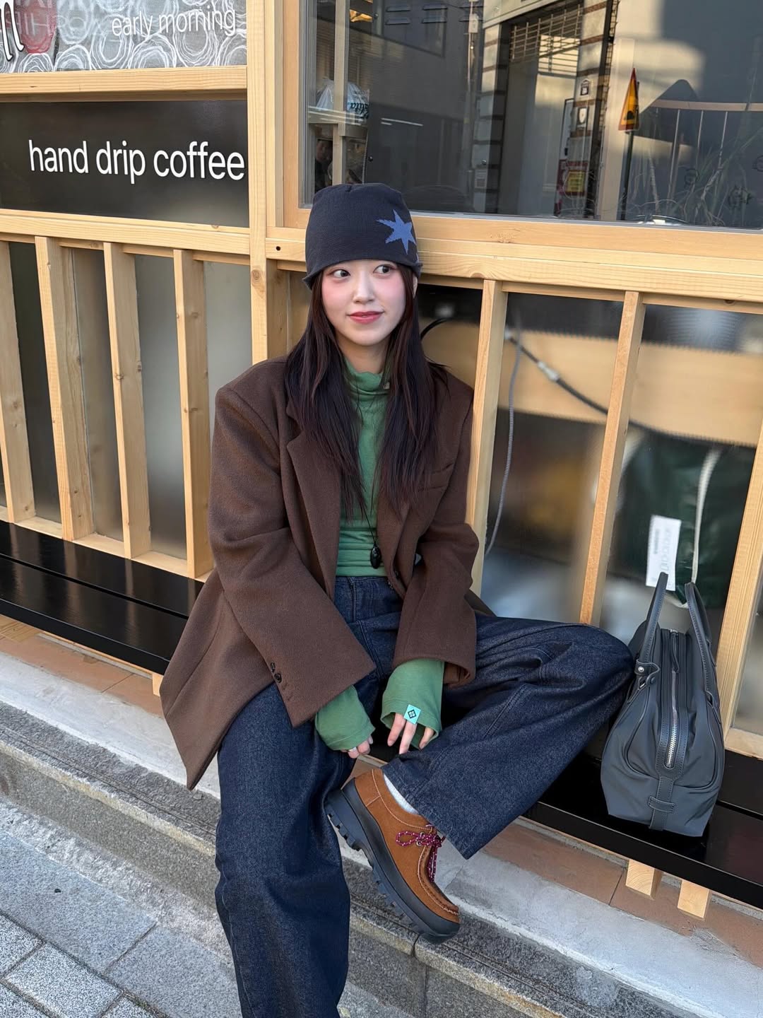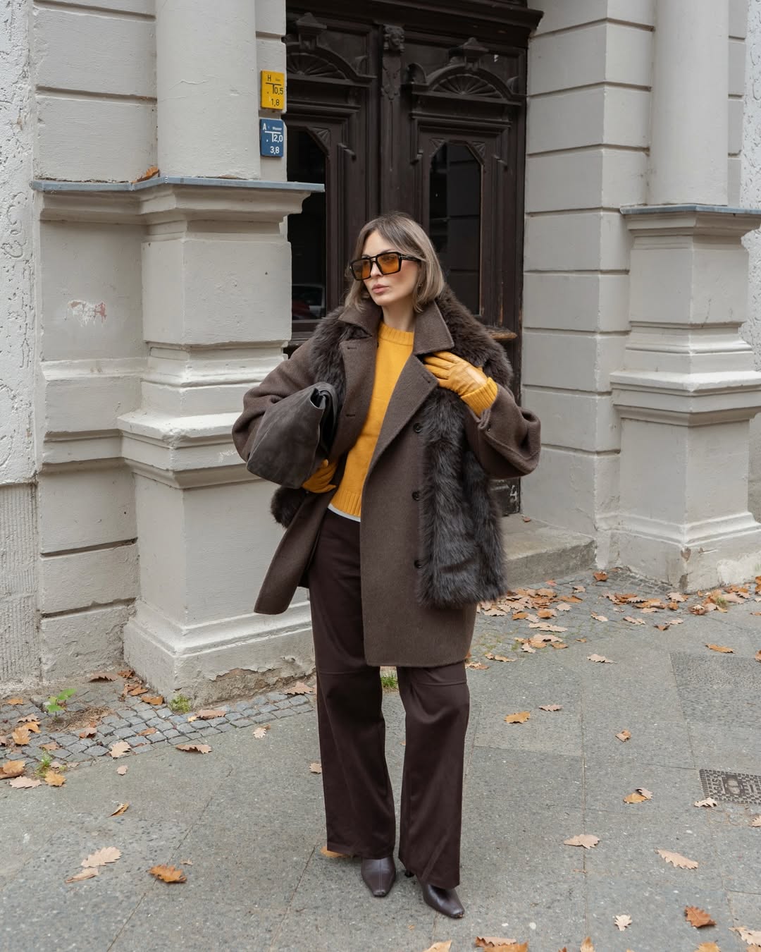 上回在文章中介紹過棕色 × 水藍的搭配,那時已經見識過棕色當配角的實力,其實它跟更飽和的亮色也完全合拍,比如棕色外套內搭亮色毛衣,只要微微露出一小截顏色就很好看,冬天的沉悶也瞬間煙消雲散,變得好活潑。