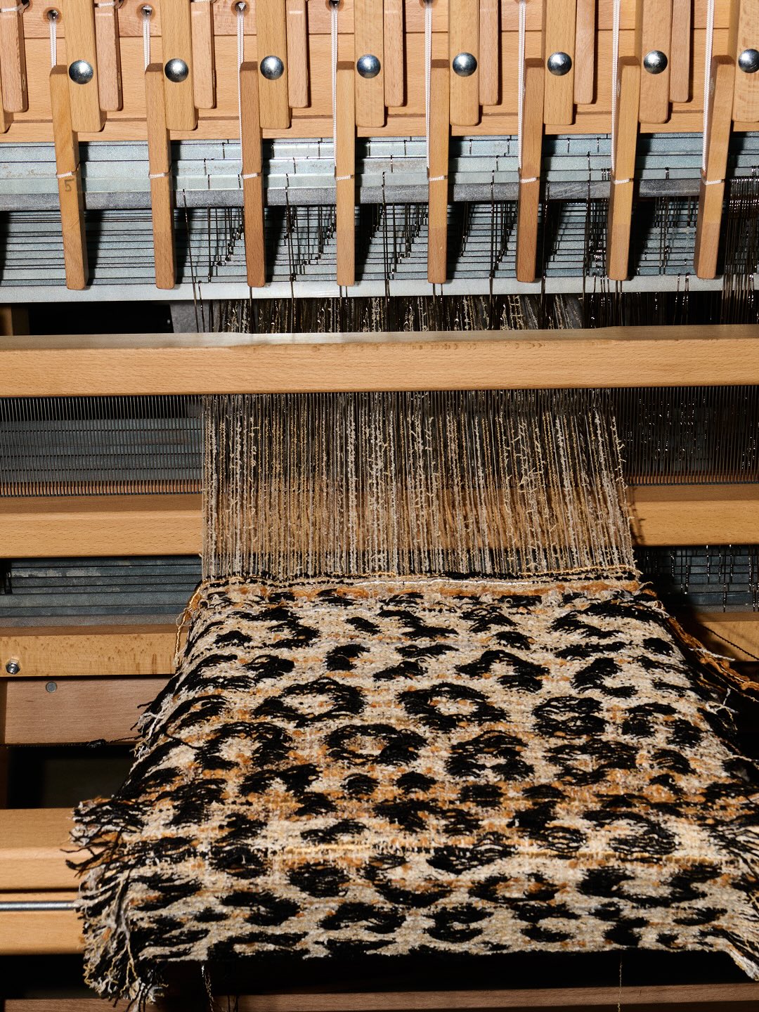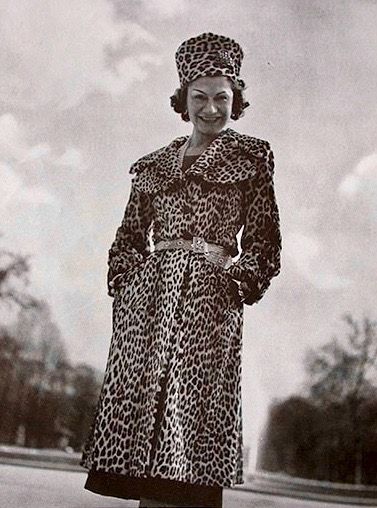 (左)Lesage 工匠手工編織的粗紡豹紋斜紋軟呢;(右)1939 年 Gabrielle Chanel 穿著豹紋外套的檔案照