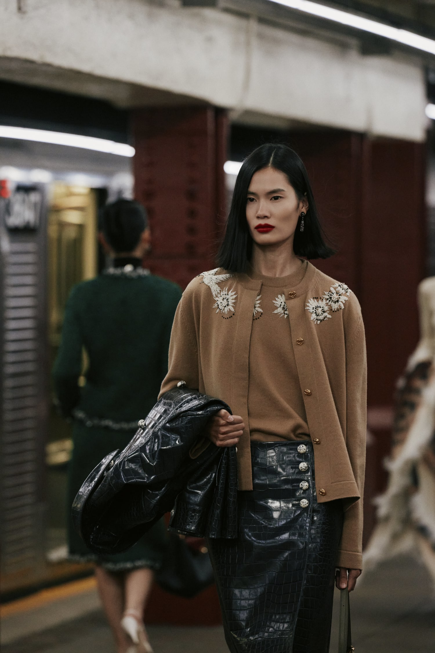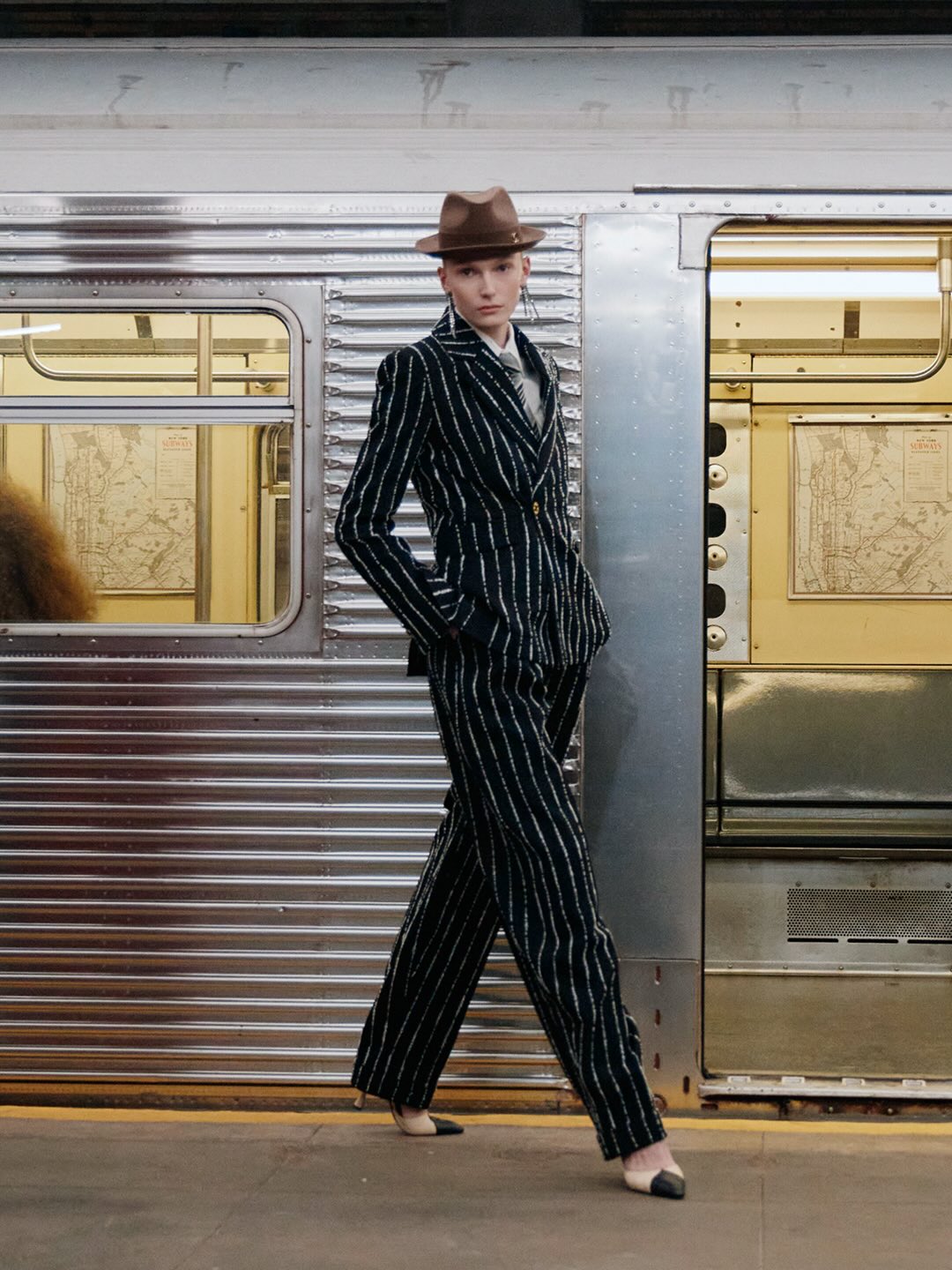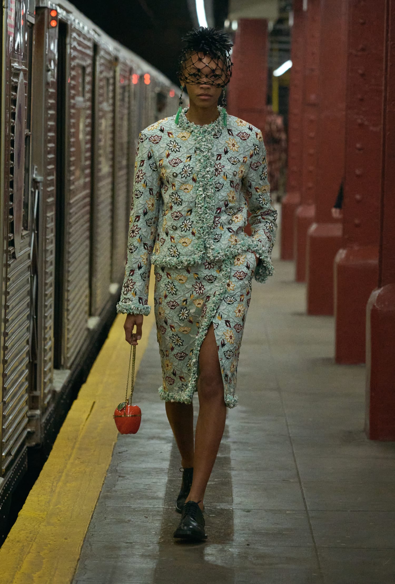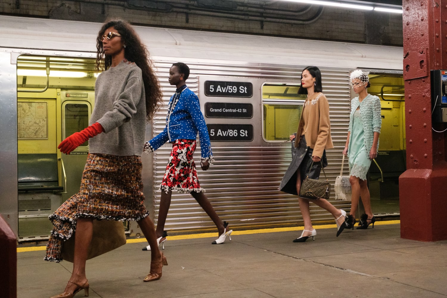 一位身著看似丹寧套裝、實則是 Lesage 精工刺繡絲綢的學生走過;緊隨其後的,有身著華服的社交名媛,有身著 80 年代風格服裝的職業女性….,在地鐵這個城市公共空間裡,城市角色變得立體鮮明起來。