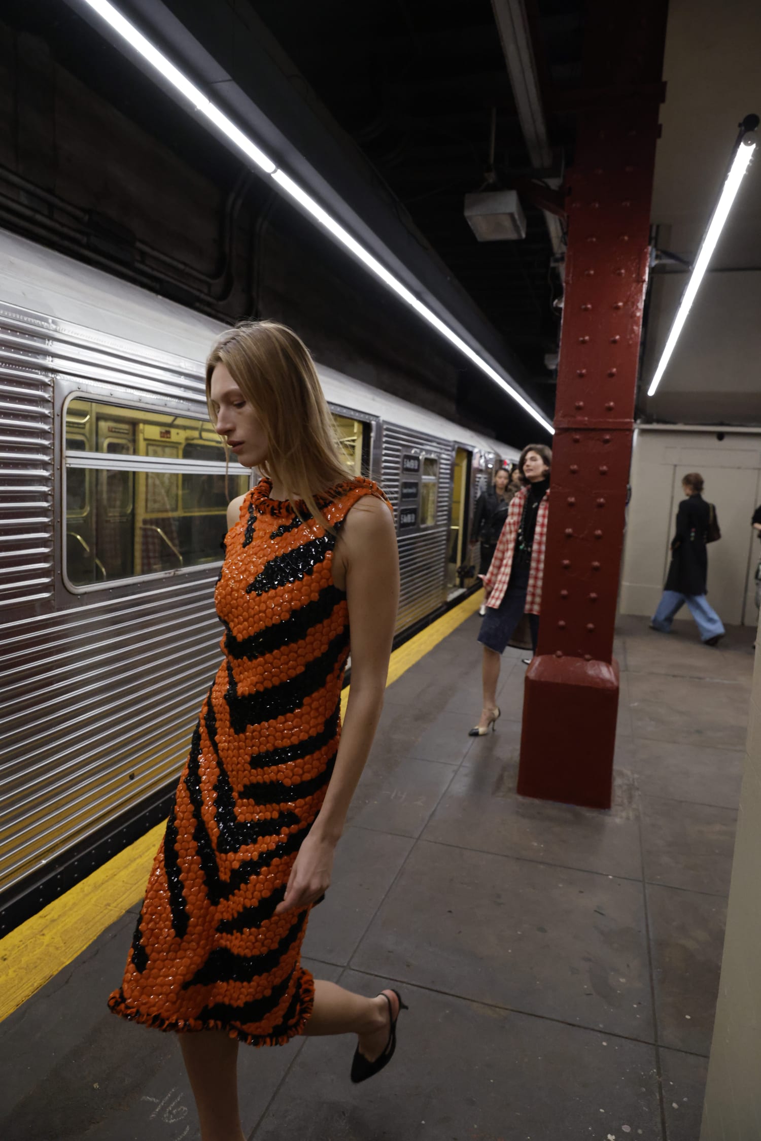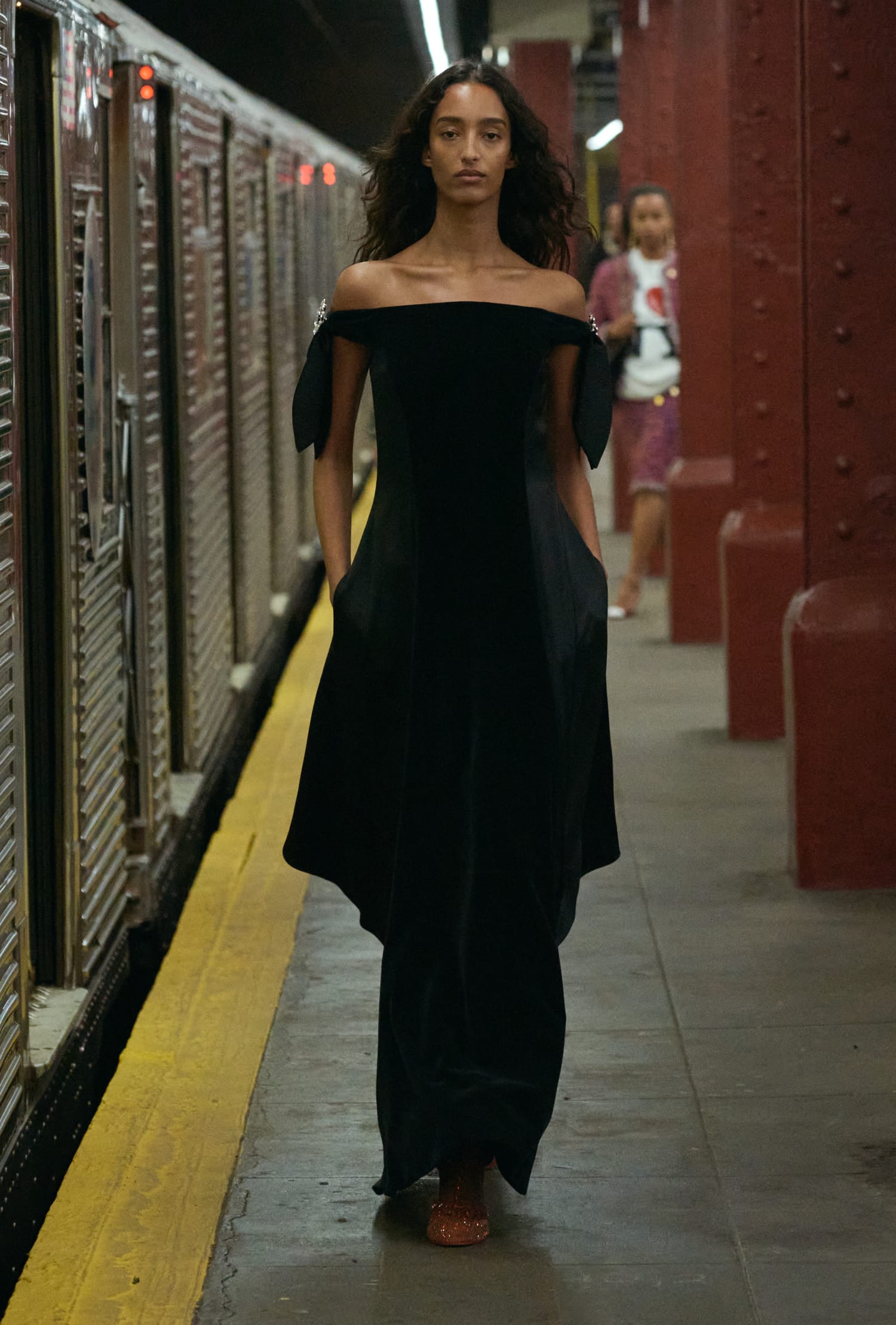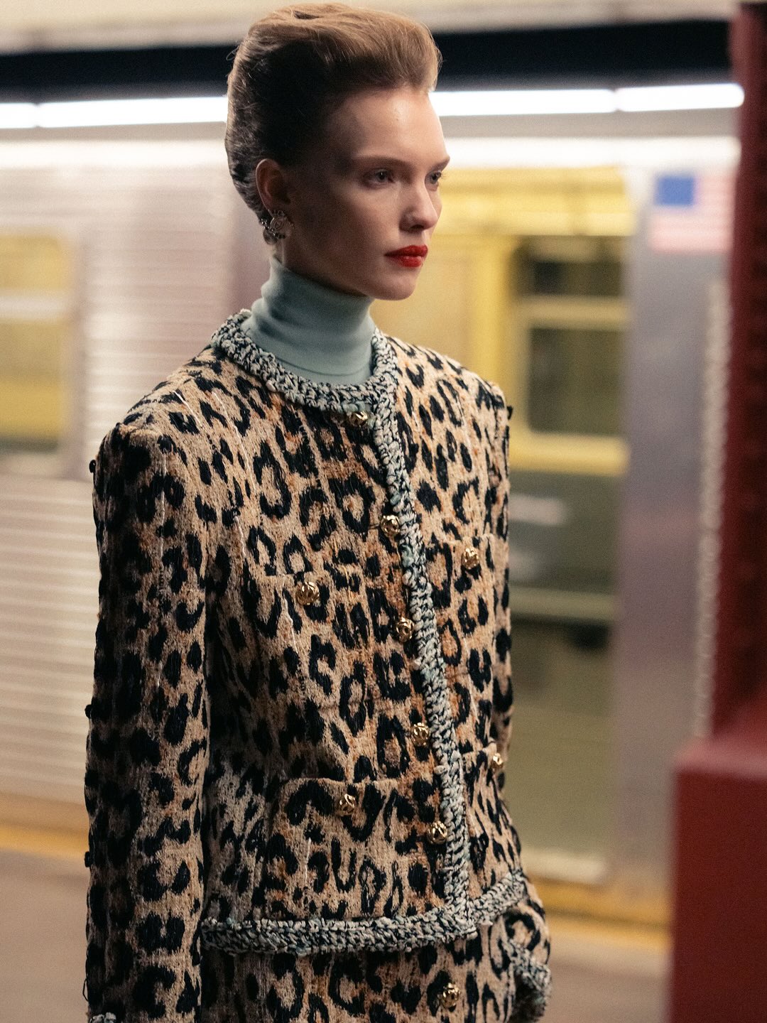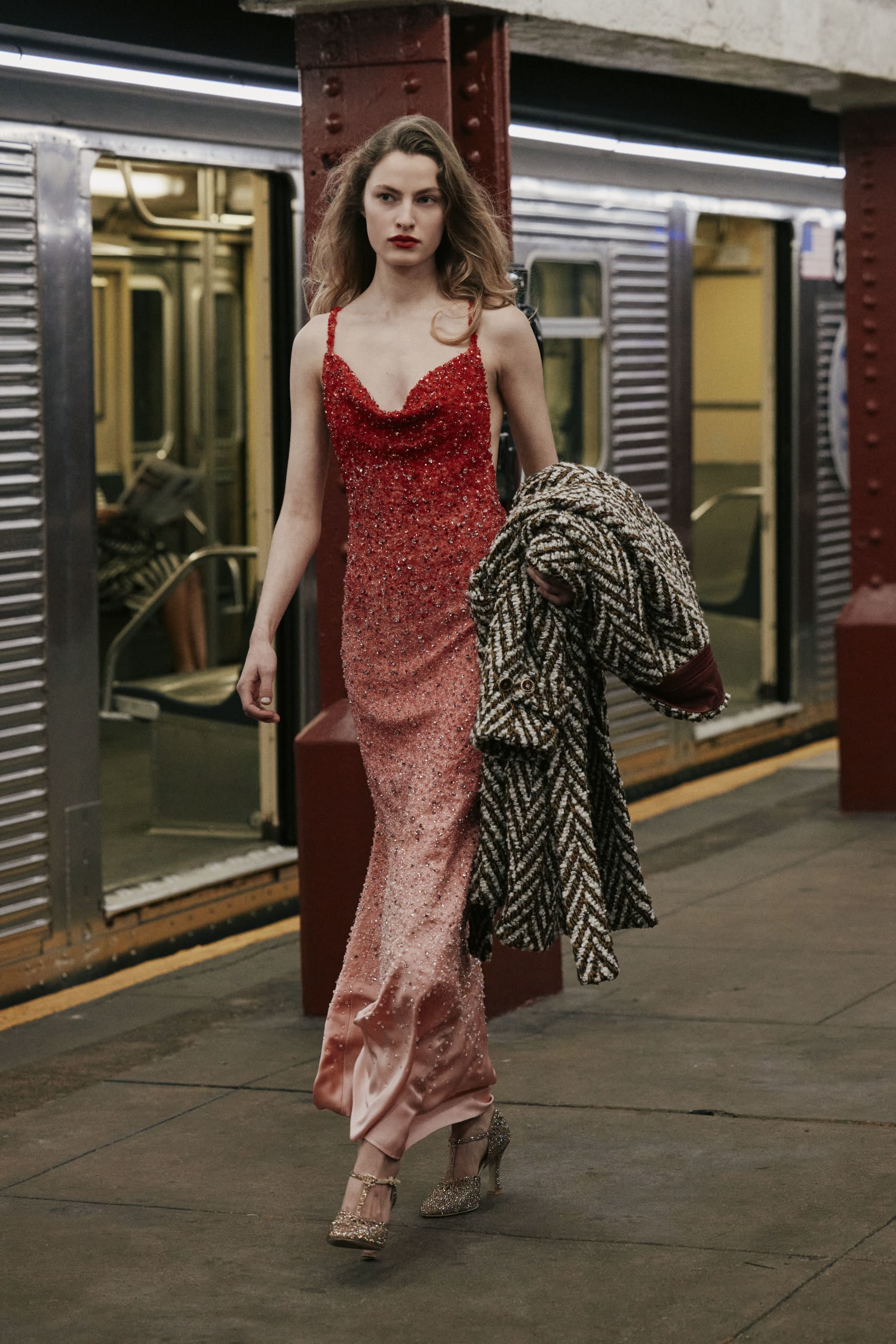 一位身著看似丹寧套裝、實則是 Lesage 精工刺繡絲綢的學生走過;緊隨其後的,有身著華服的社交名媛,有身著 80 年代風格服裝的職業女性….,在地鐵這個城市公共空間裡,城市角色變得立體鮮明起來。