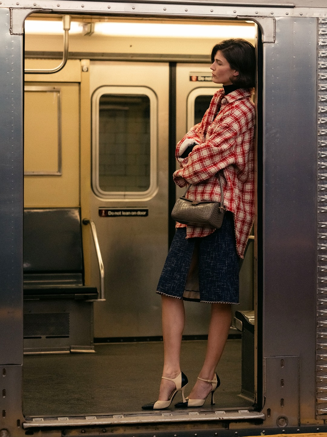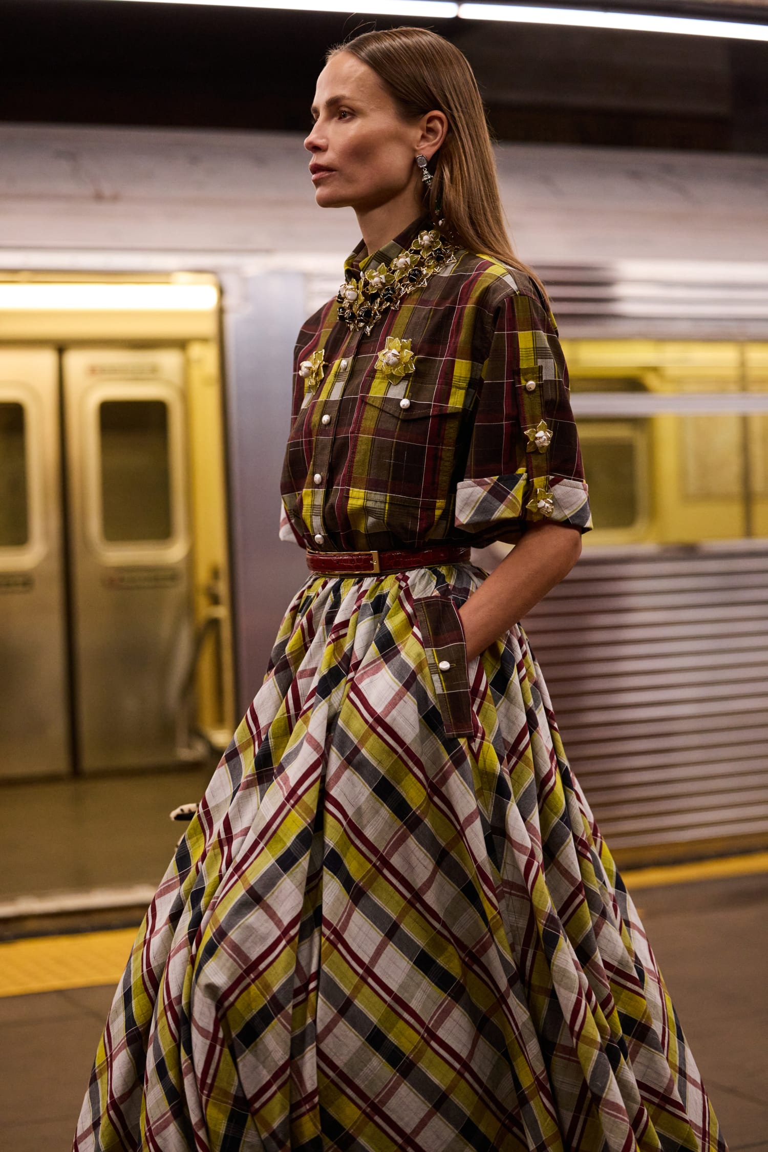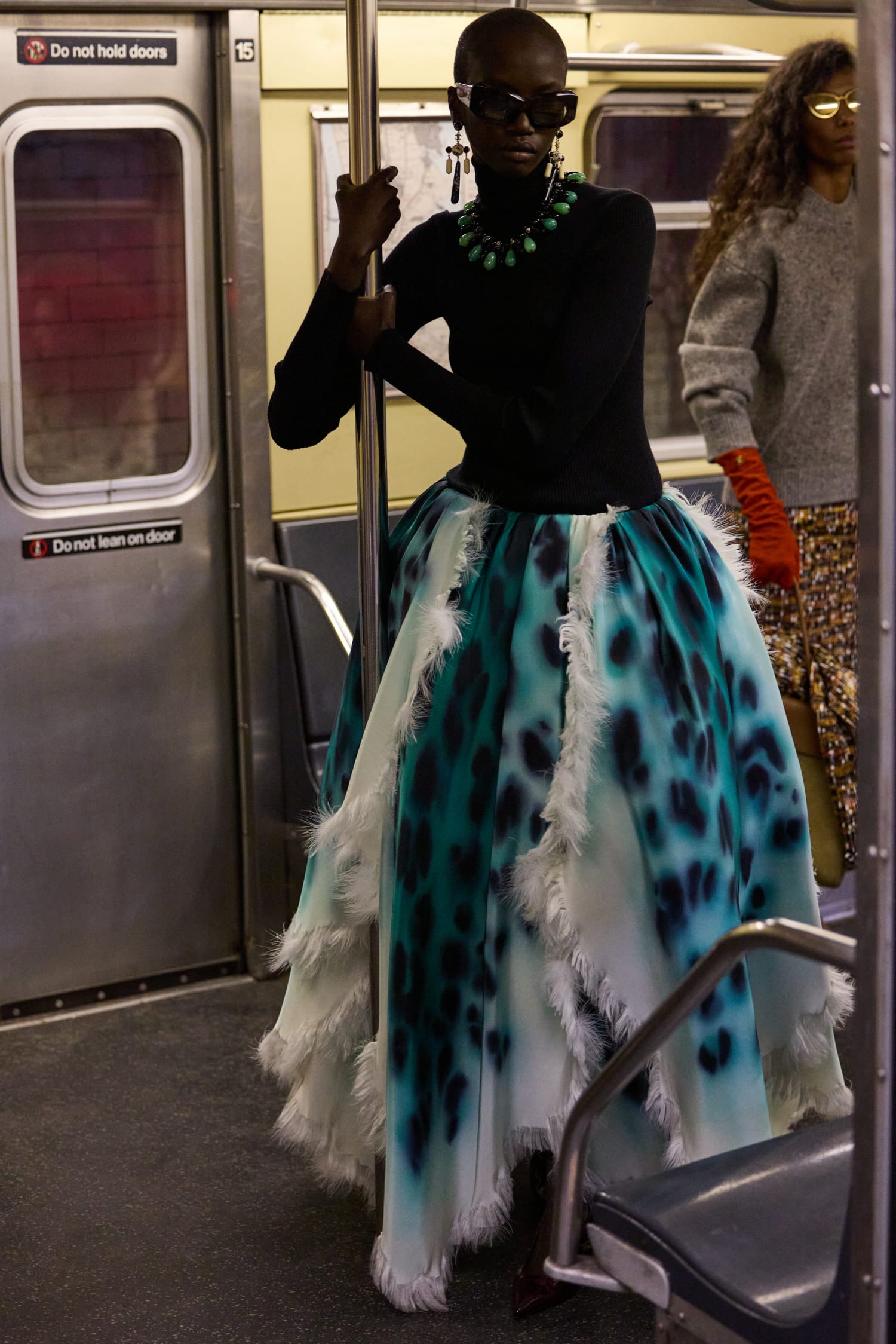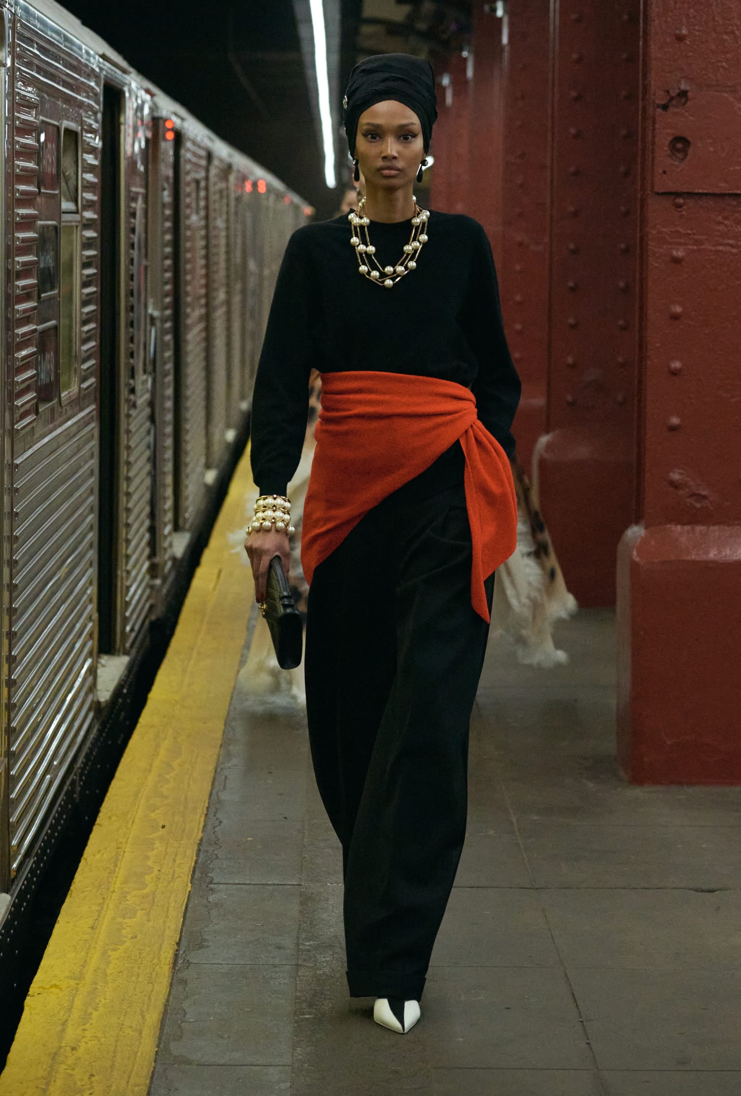 一位身著看似丹寧套裝、實則是 Lesage 精工刺繡絲綢的學生走過;緊隨其後的,有身著華服的社交名媛,有身著 80 年代風格服裝的職業女性….,在地鐵這個城市公共空間裡,城市角色變得立體鮮明起來。