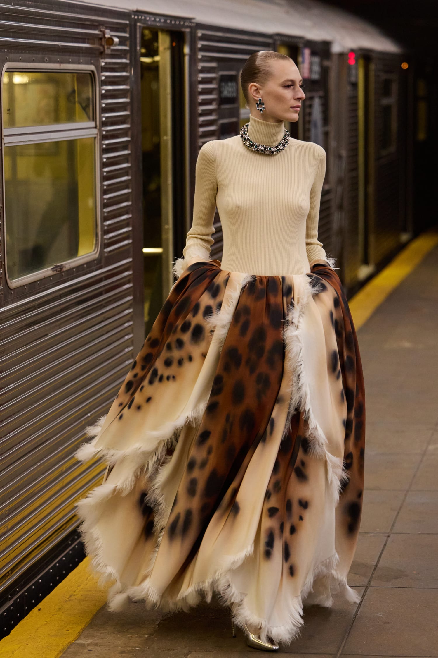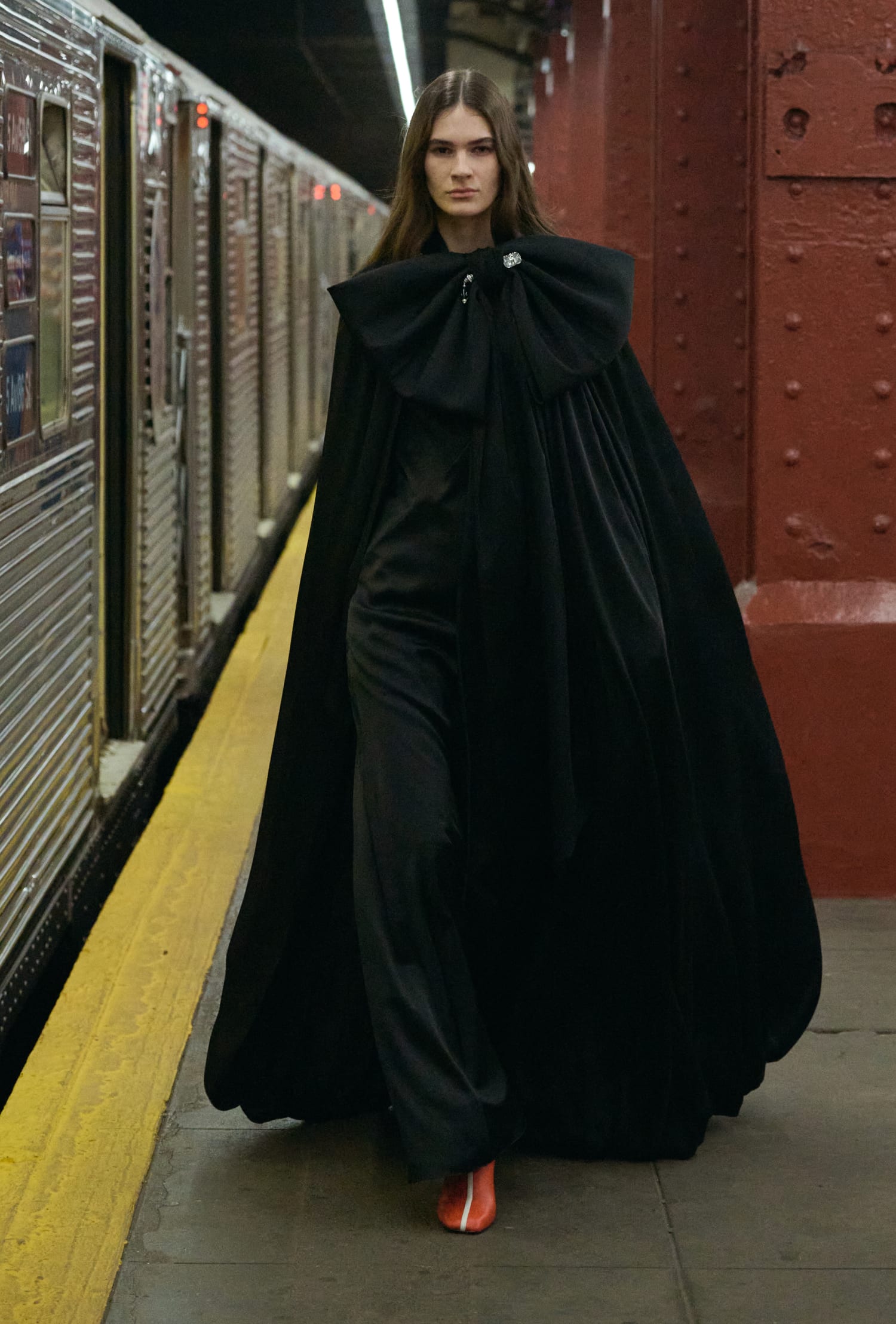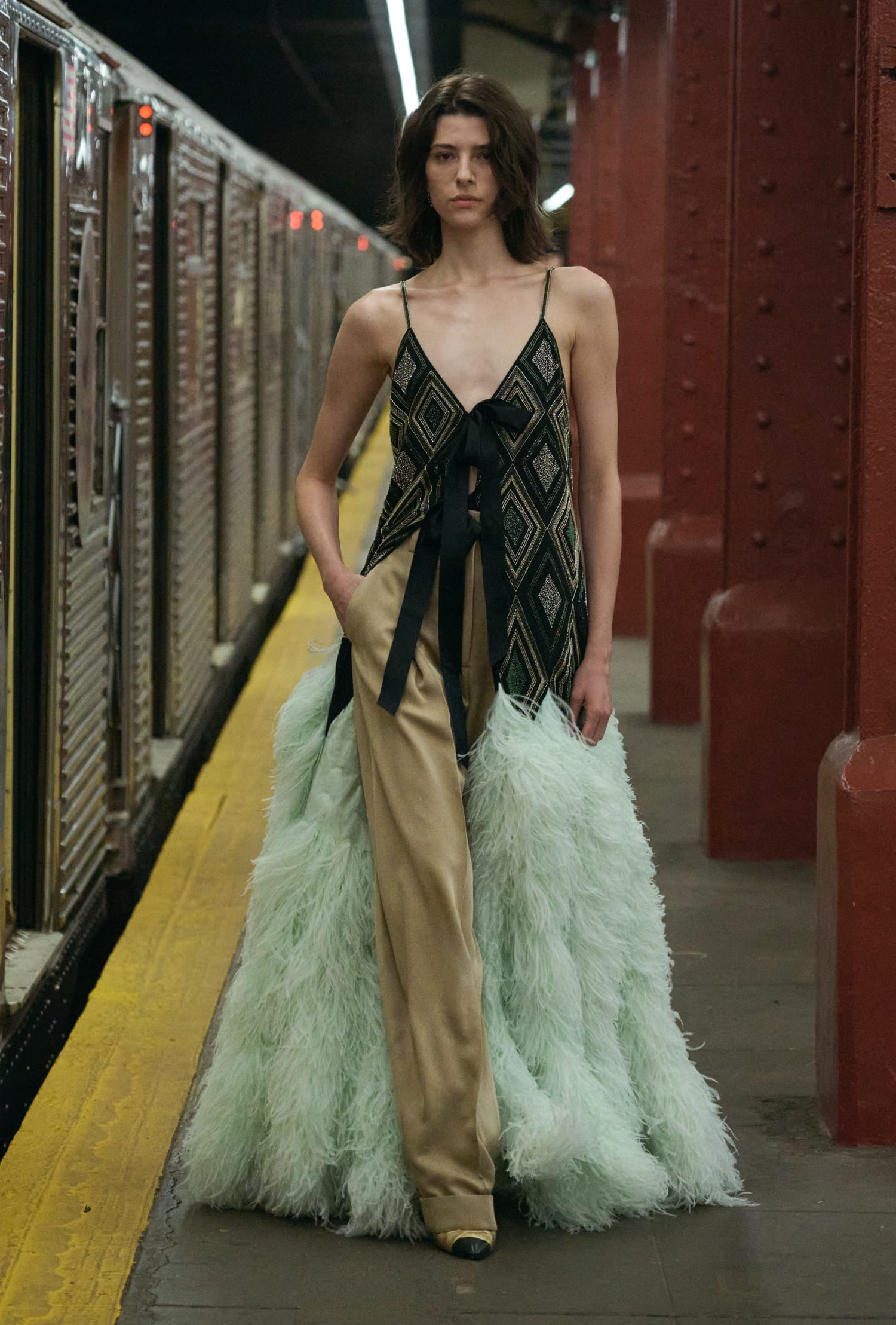 回到 Matthieu Blazy 身上,他在秀後採訪中透露,曾在紐約搭地鐵前往下城區的途中,一個在時代廣場扮演蜘蛛人的市民上了車;還有一次,因為遇到了大都會歌劇院散場,他就這麼和一群穿著燕尾服的人共乘一段路程….,這些邂逅讓平凡的地鐵時刻顯得不那麼平凡,甚至帶點戲劇性。
