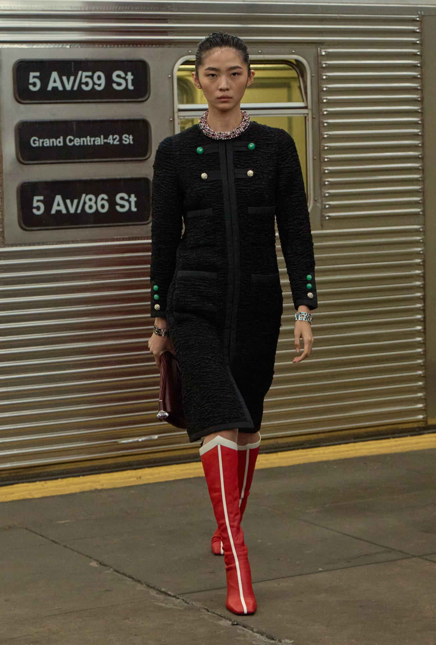 紐約地鐵站裡,CHANEL 列車駛進月台,衣著風格各異的模特兒從車廂內從容走出,在這個最能體驗城市脈動的地方,藝術總監 Matthieu Blazy 藉由他在 CHANEL 的首個 Métiers d’art 工坊系列告訴我們 —— CHANEL 女性就是我們在地鐵上擦肩而過的每一位女性,她可能是早晨行色匆匆的上班族,也可能是黃昏時擦著唇膏補妝趕著赴約的都會女子,她可能僅是過客,也可能就是你和我。