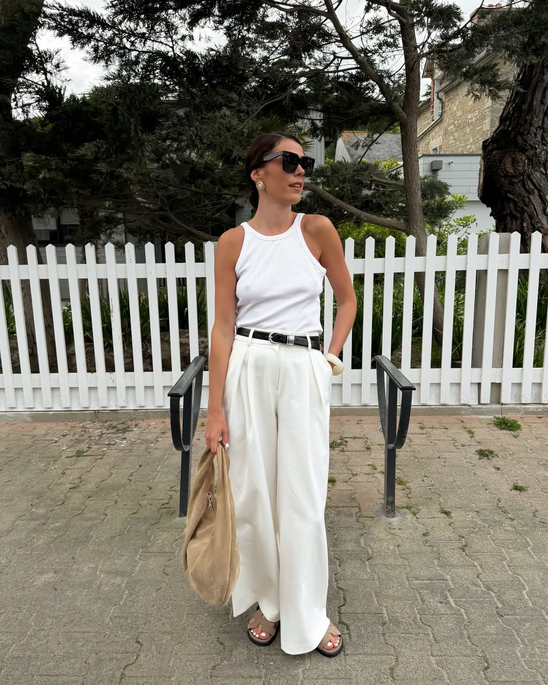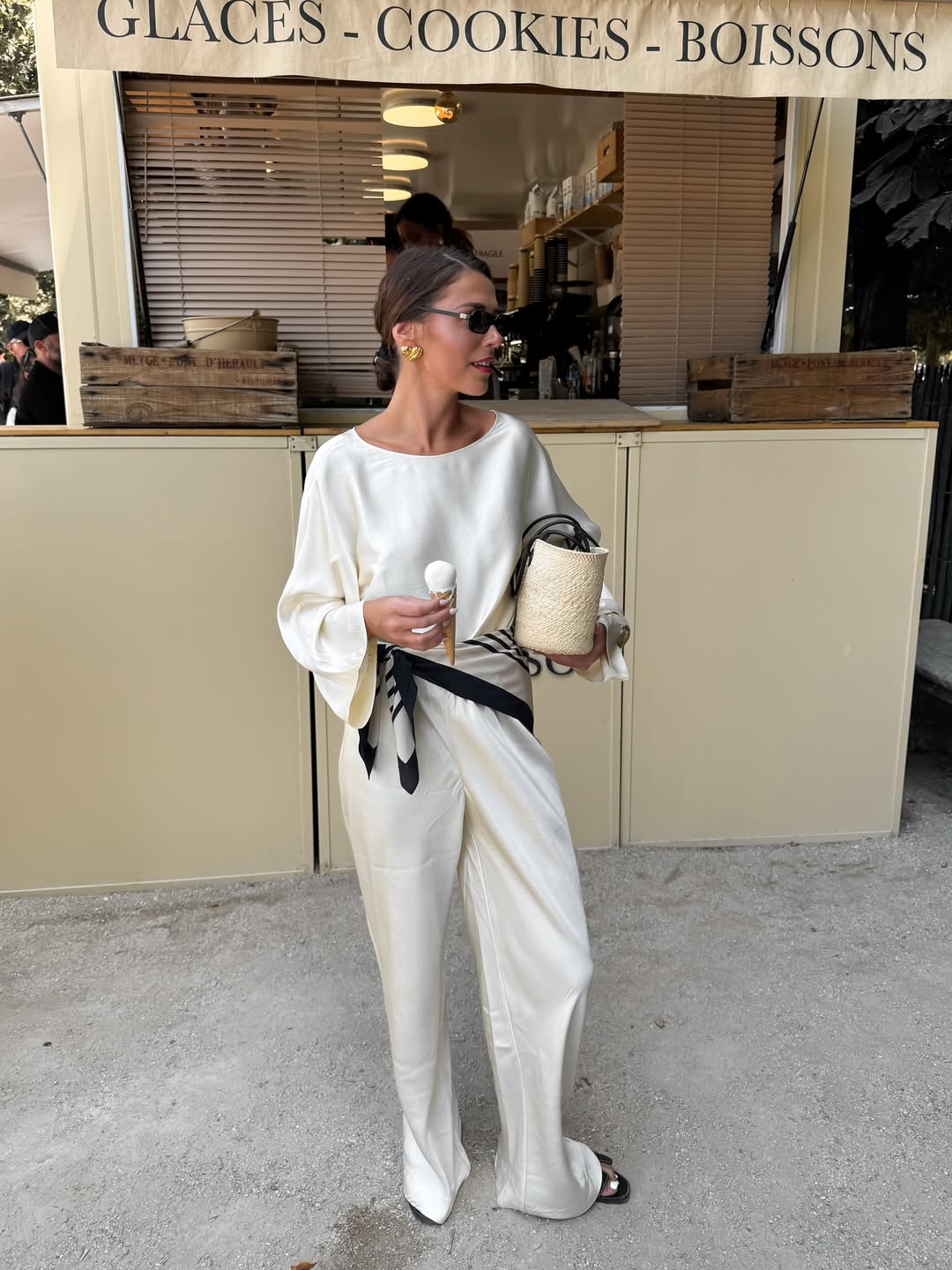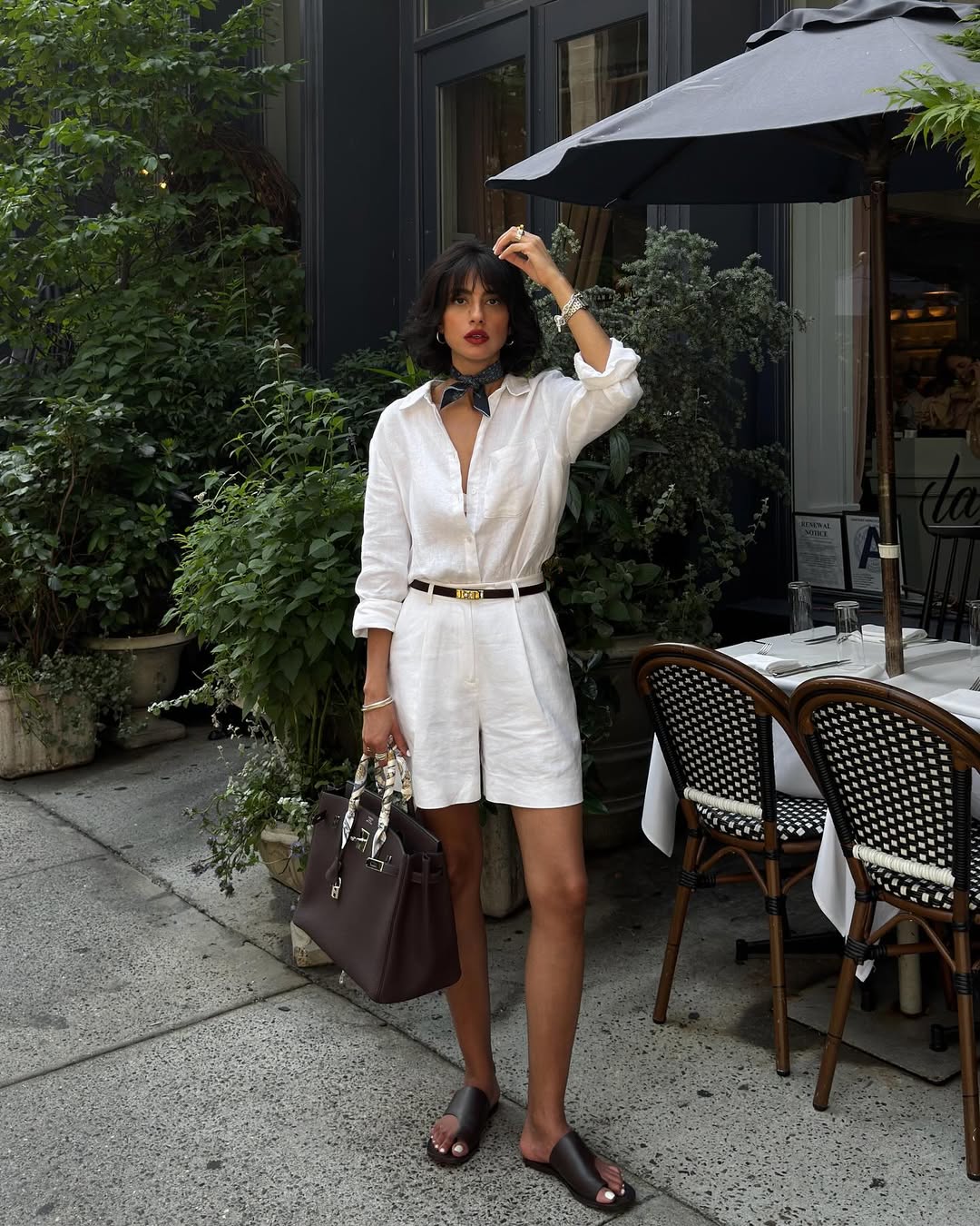 想為全白造型增添亮點,來個畫龍點睛的配件是個好主意,穿褲裝最推薦加條皮帶,裙裝則可以隨性綁條絲巾,不僅能為穿搭畫重點,還能悄悄標記出腰身與腿長,讓身形顯得修長。