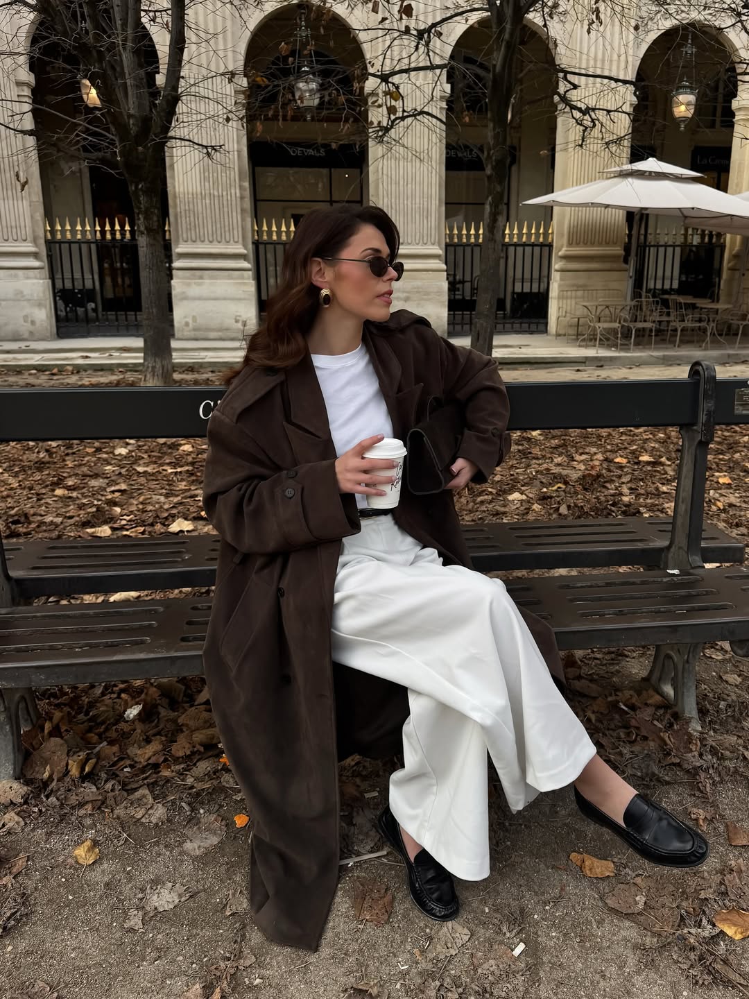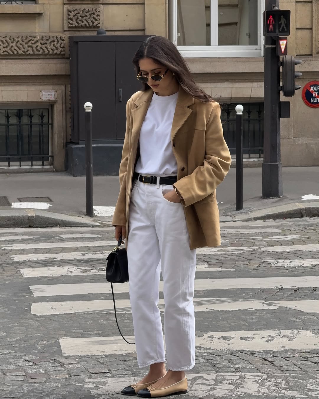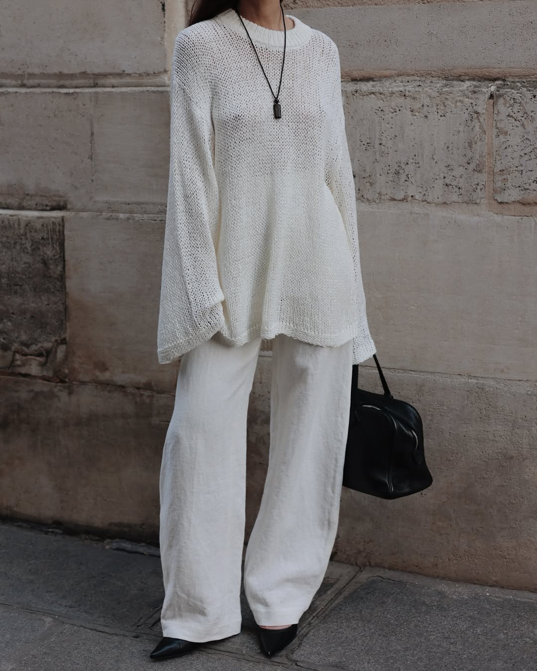 白搭白的組合本身就乾淨耐看,在這樣柔和的白色基底上,再加一件不同色系的外套,無論是駝色、焦糖色還是黑灰,白色能使得外套的存在更突出卻又不喧賓奪主,穿起來高級感不言而喻。