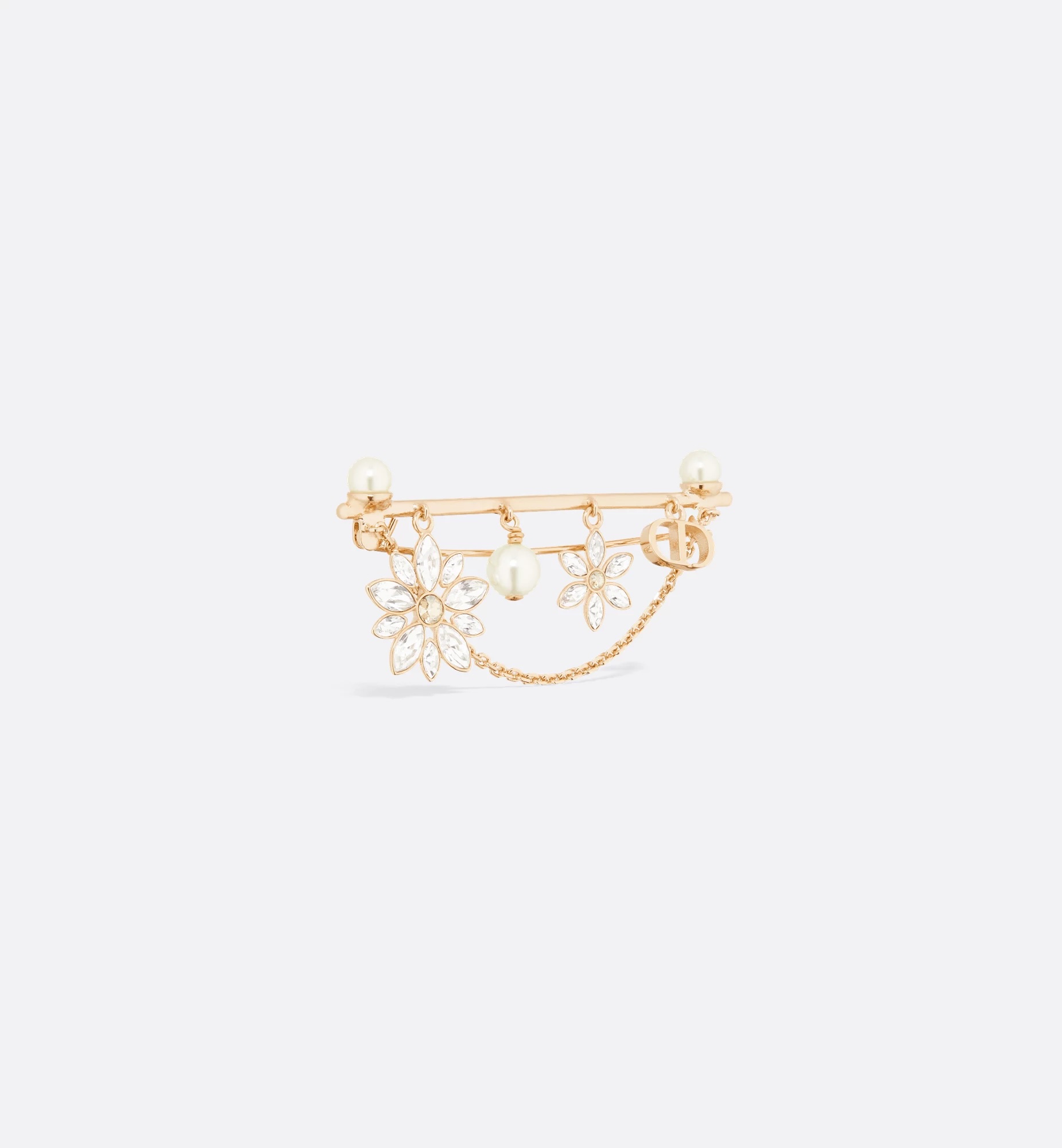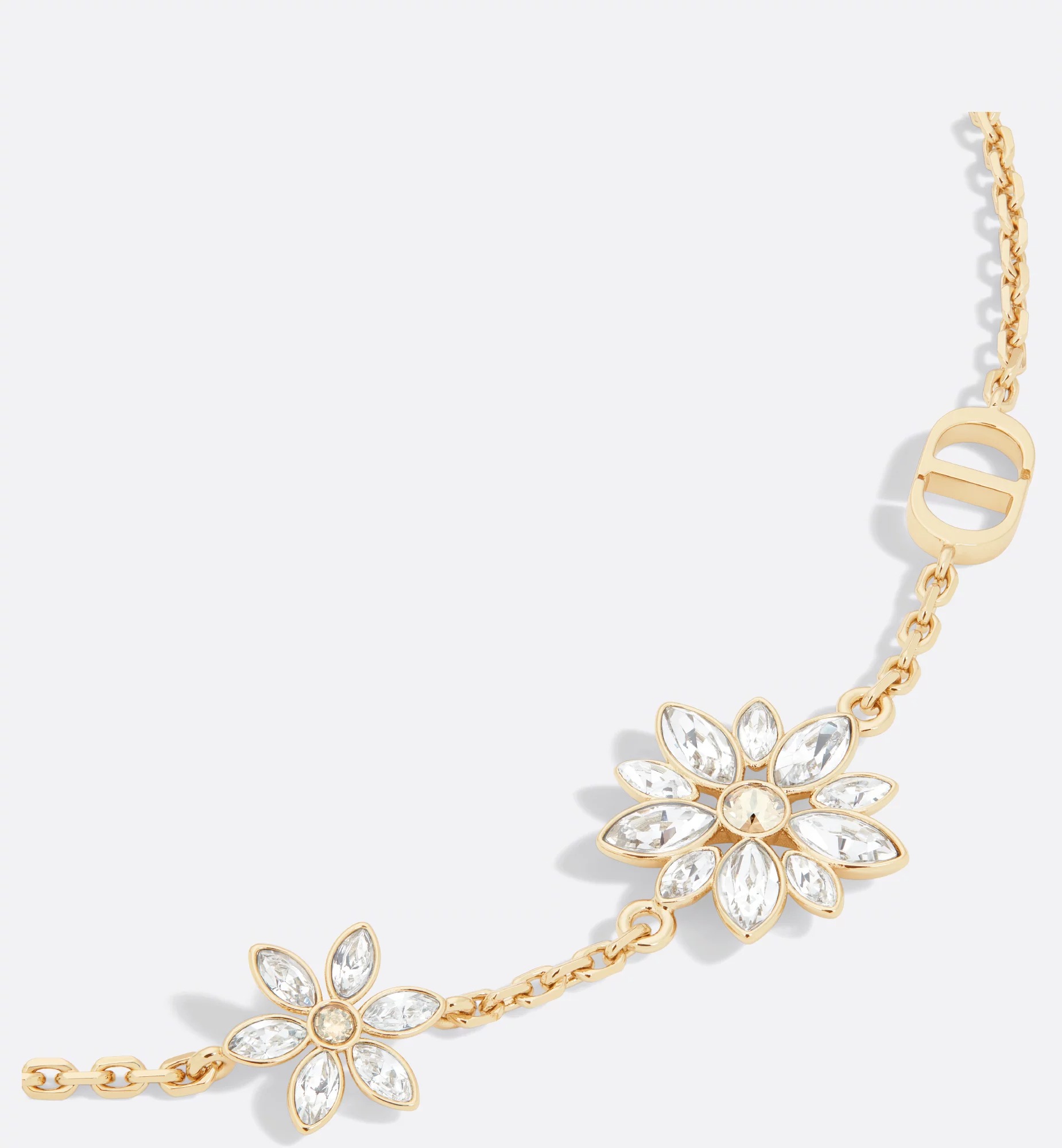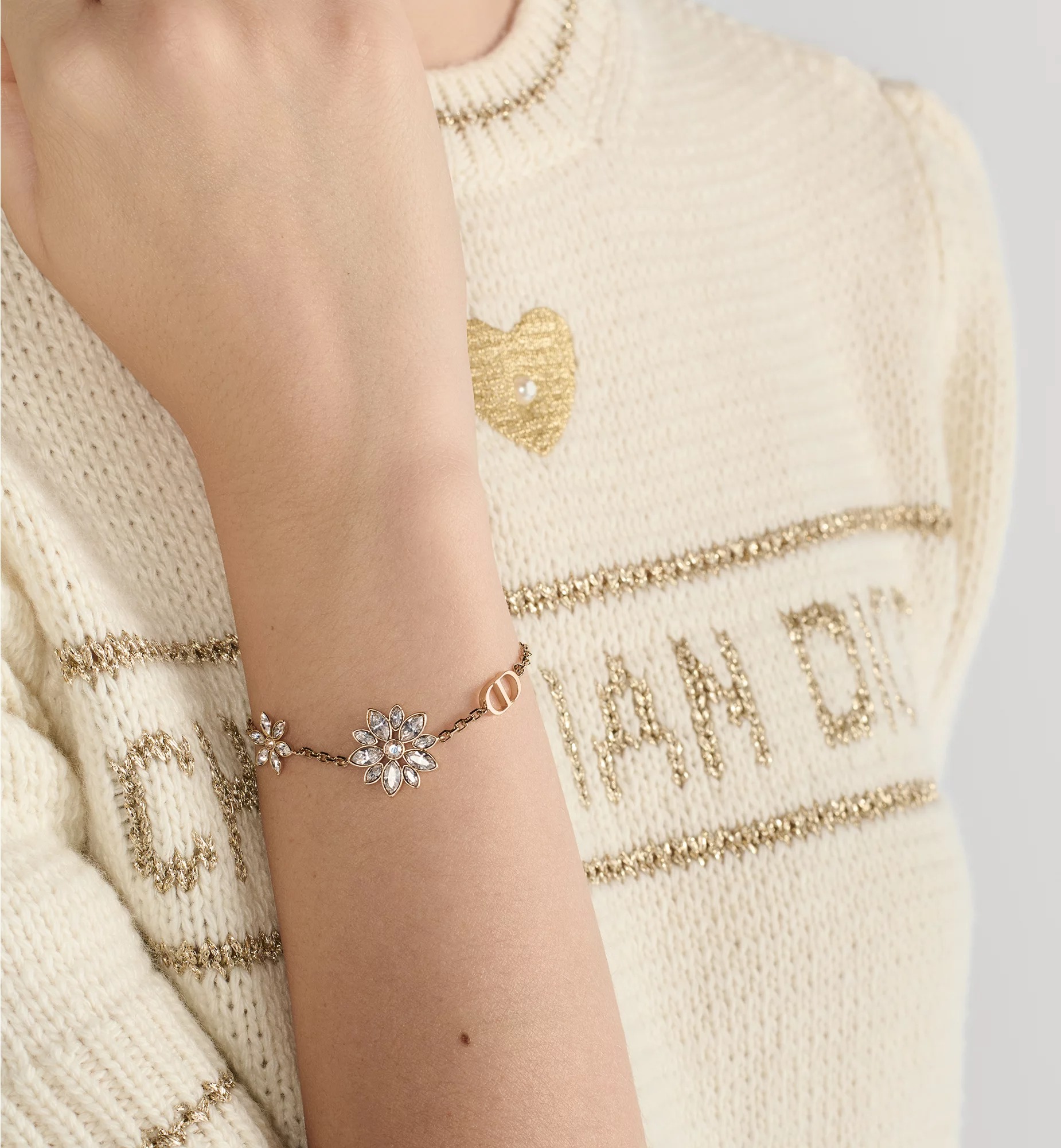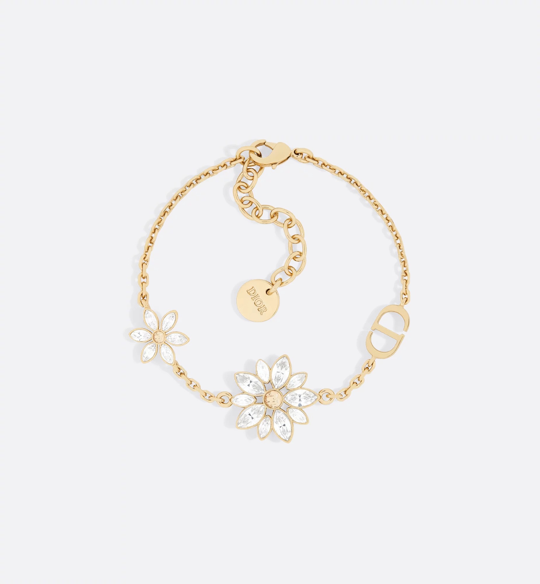 Fleur de Glace 來自 2026 度假系列新品,以小雛菊元素為題,以淡金色飾面金屬製成,兩朵花朵的花瓣為銀色水晶,中央鑲嵌一顆金色水晶,搭配金色飾品金屬鏈手鏈,上面有金色和銀色水晶點綴,並飾有 CD 標誌,設計饒富詩意,精緻高雅,包含手鍊、胸針、項鍊、包款吊飾、以及耳環等。