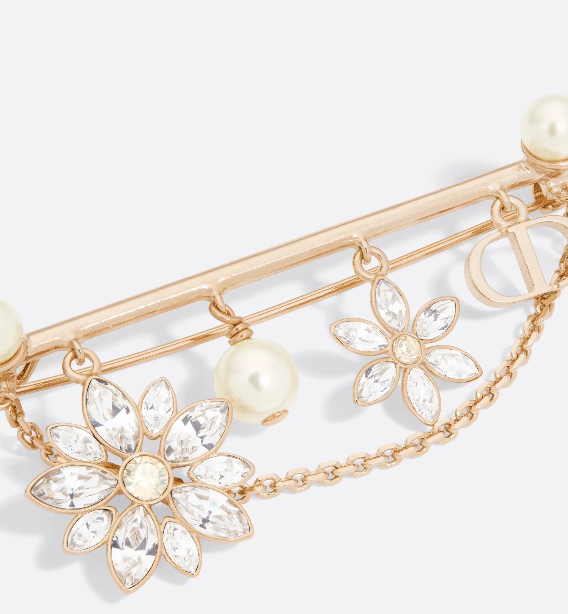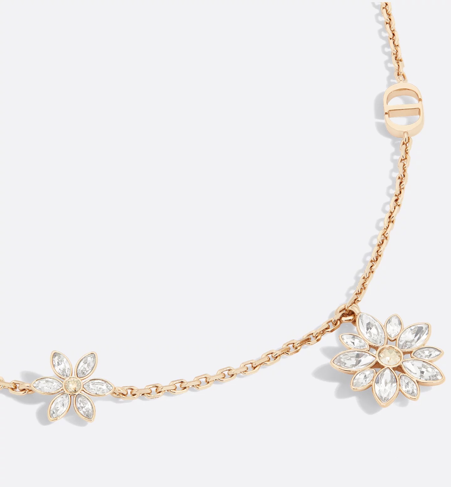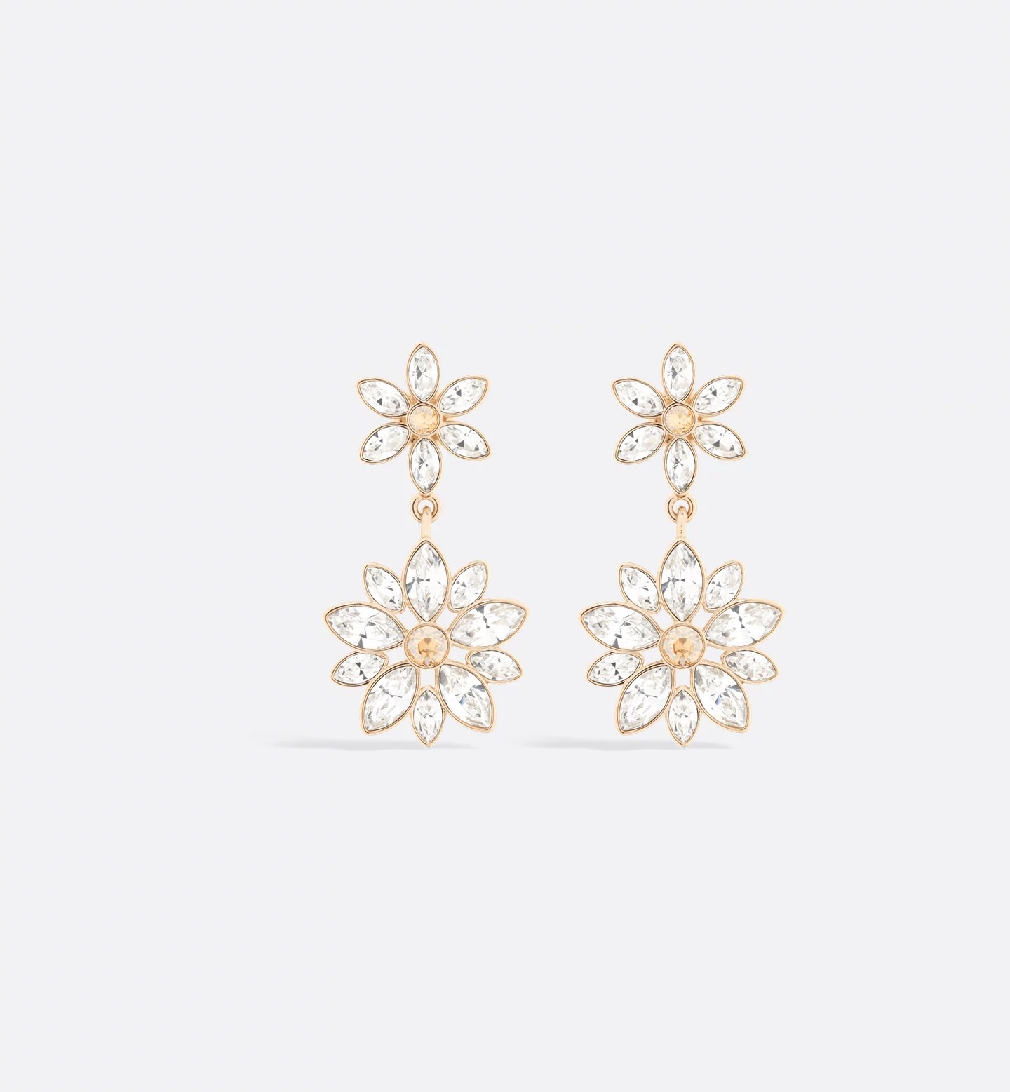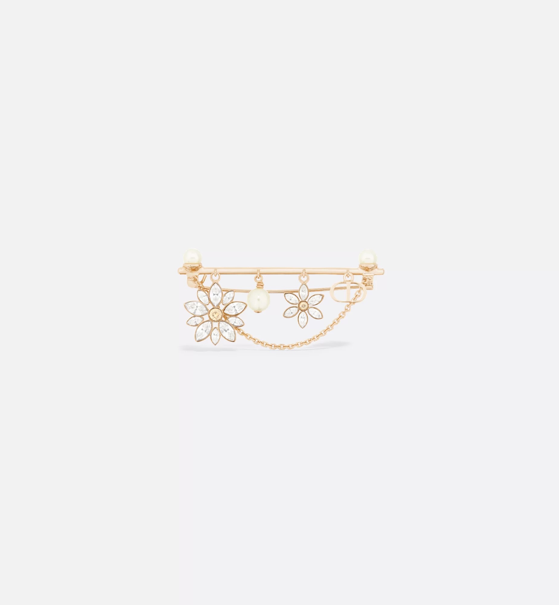 Fleur de Glace 來自 2026 度假系列新品,以小雛菊元素為題,以淡金色飾面金屬製成,兩朵花朵的花瓣為銀色水晶,中央鑲嵌一顆金色水晶,搭配金色飾品金屬鏈手鏈,上面有金色和銀色水晶點綴,並飾有 CD 標誌,設計饒富詩意,精緻高雅,包含手鍊、胸針、項鍊、包款吊飾、以及耳環等。