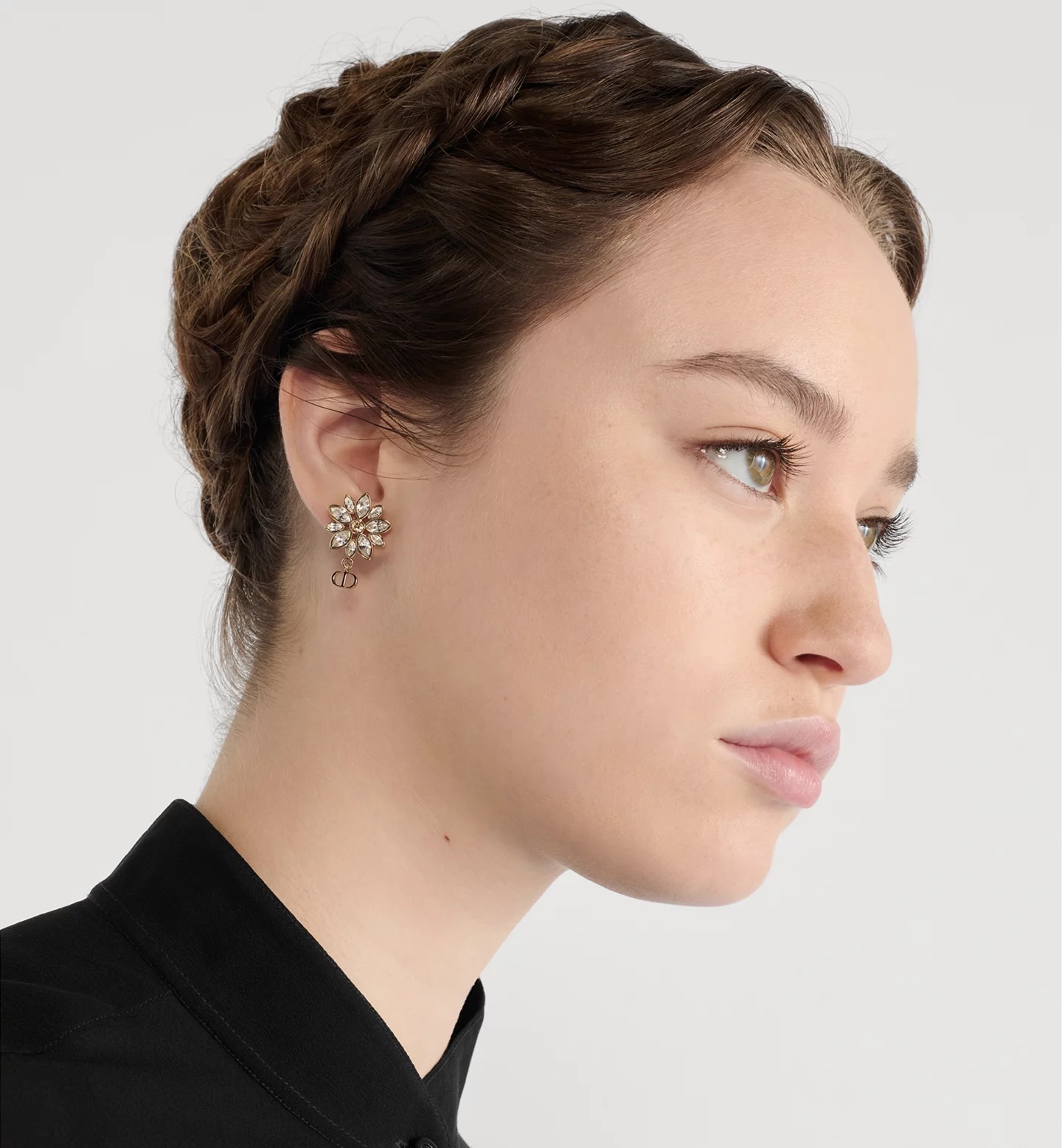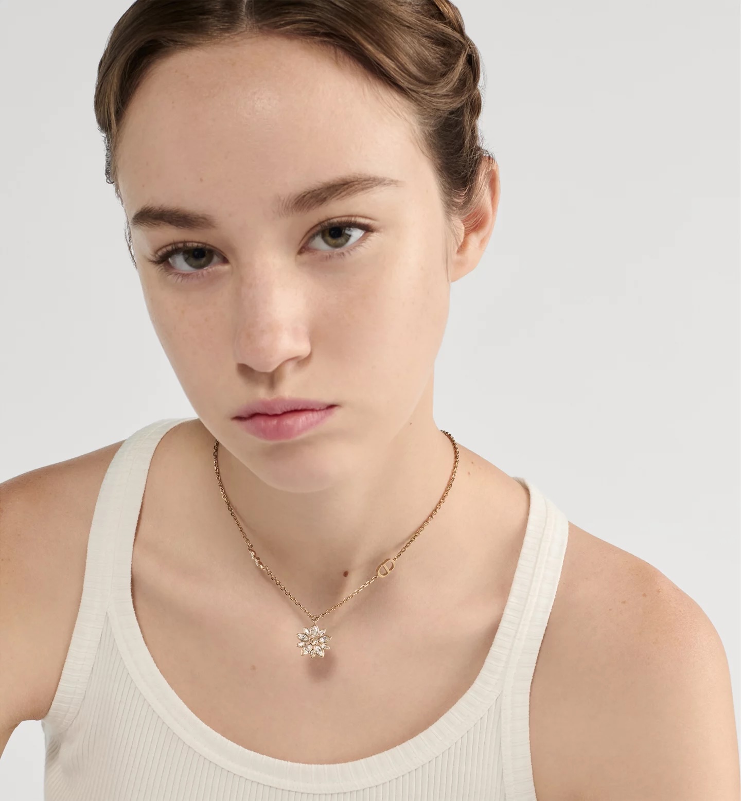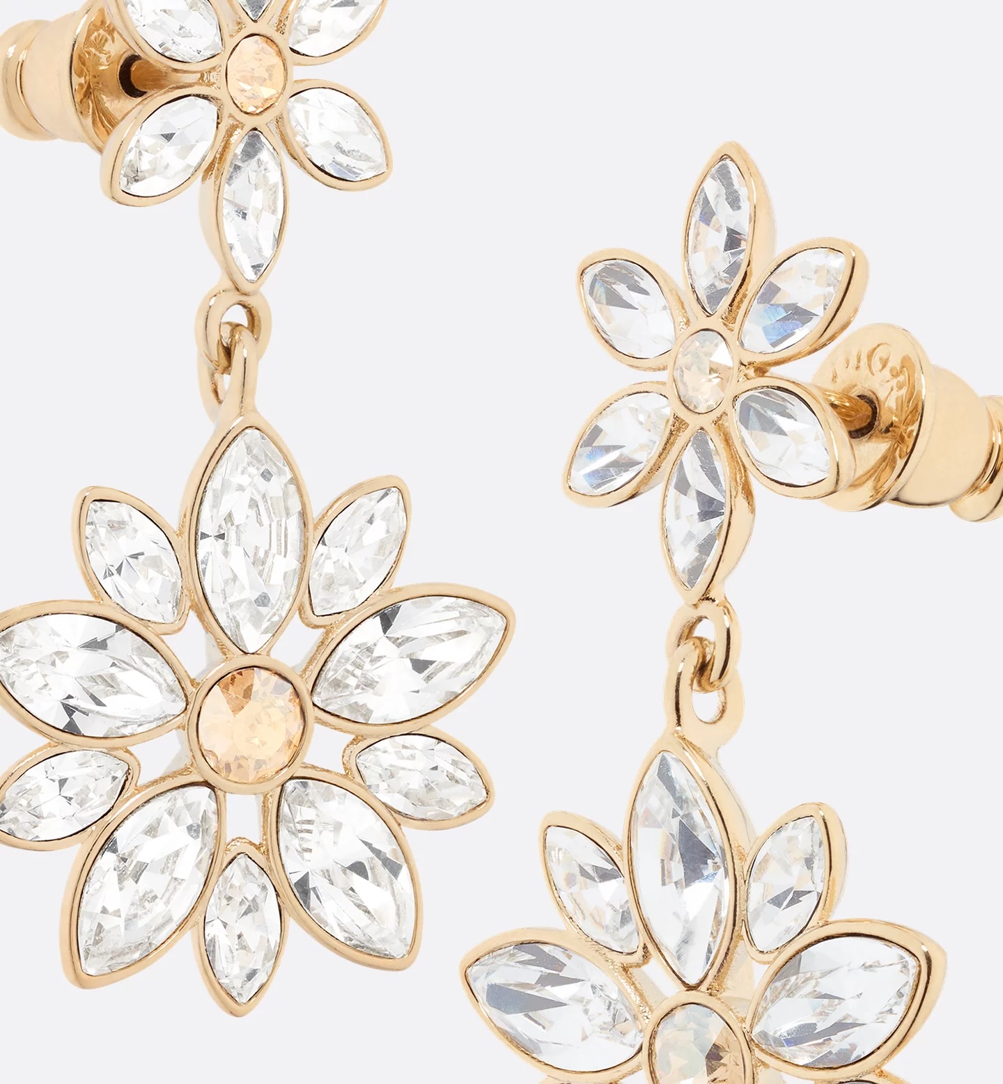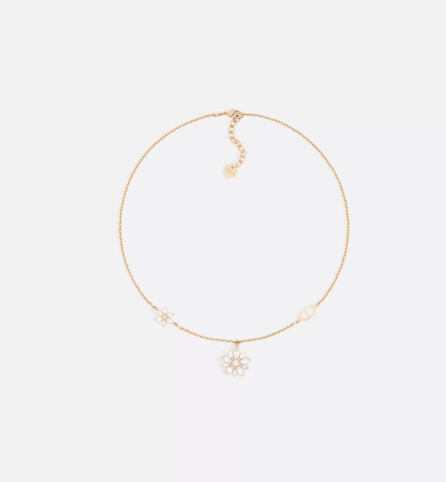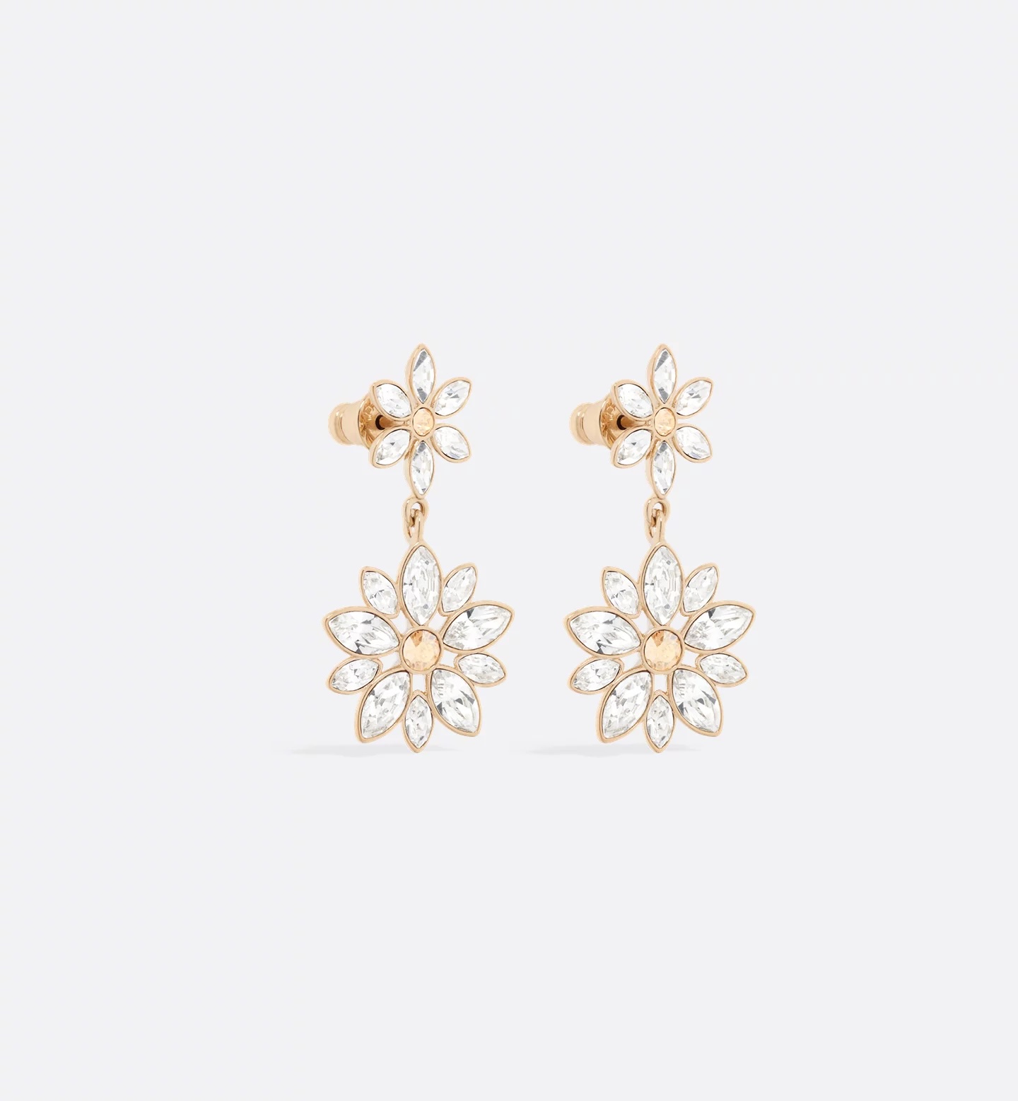 Fleur de Glace 來自 2026 度假系列新品,以小雛菊元素為題,以淡金色飾面金屬製成,兩朵花朵的花瓣為銀色水晶,中央鑲嵌一顆金色水晶,搭配金色飾品金屬鏈手鏈,上面有金色和銀色水晶點綴,並飾有 CD 標誌,設計饒富詩意,精緻高雅,包含手鍊、胸針、項鍊、包款吊飾、以及耳環等。