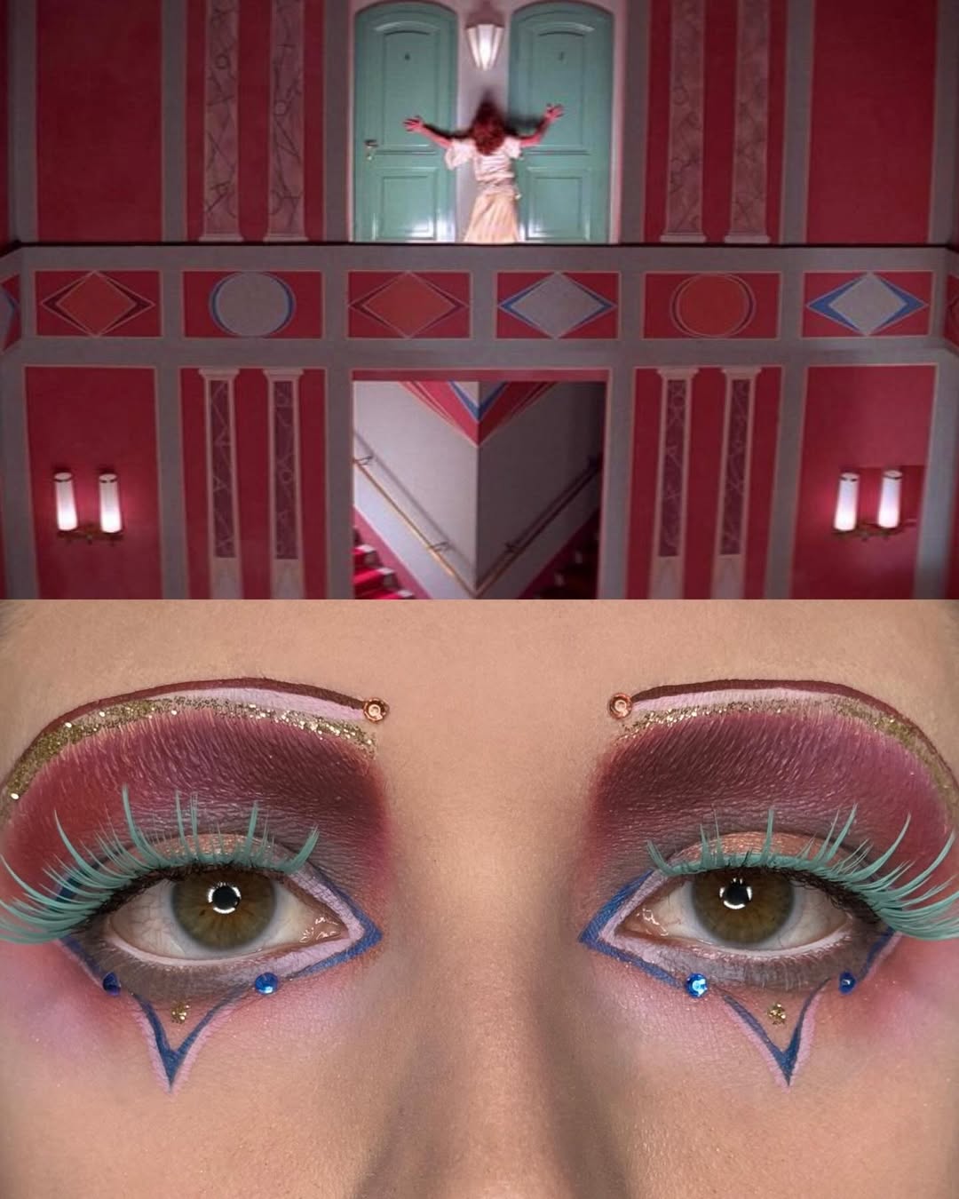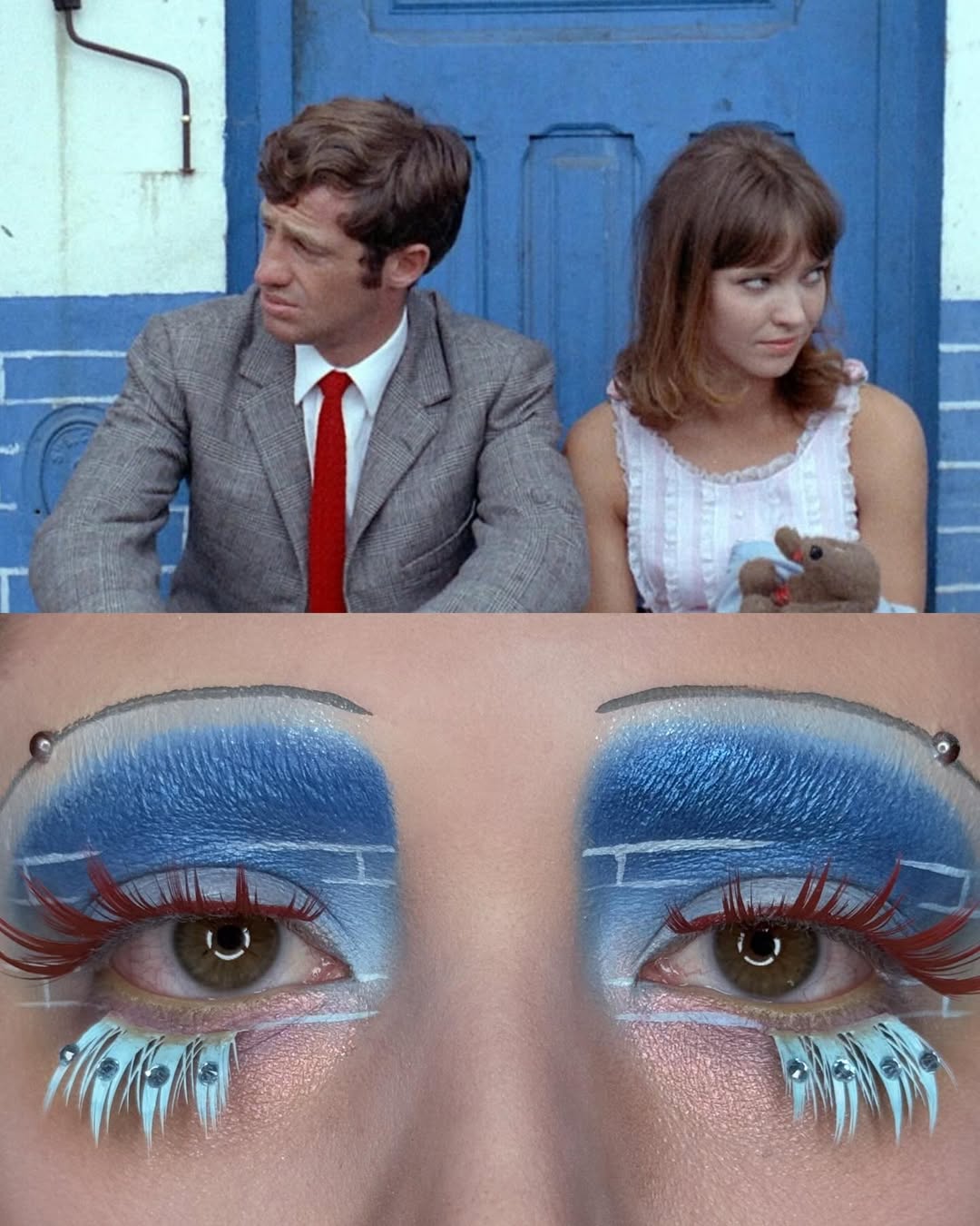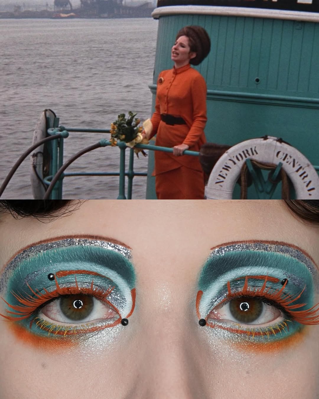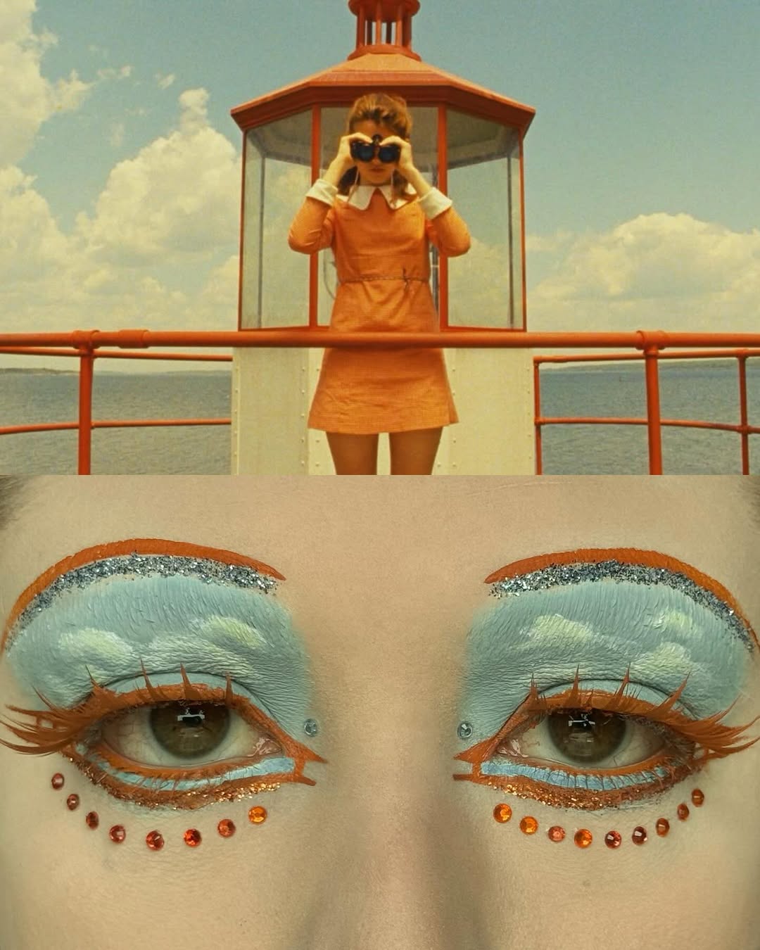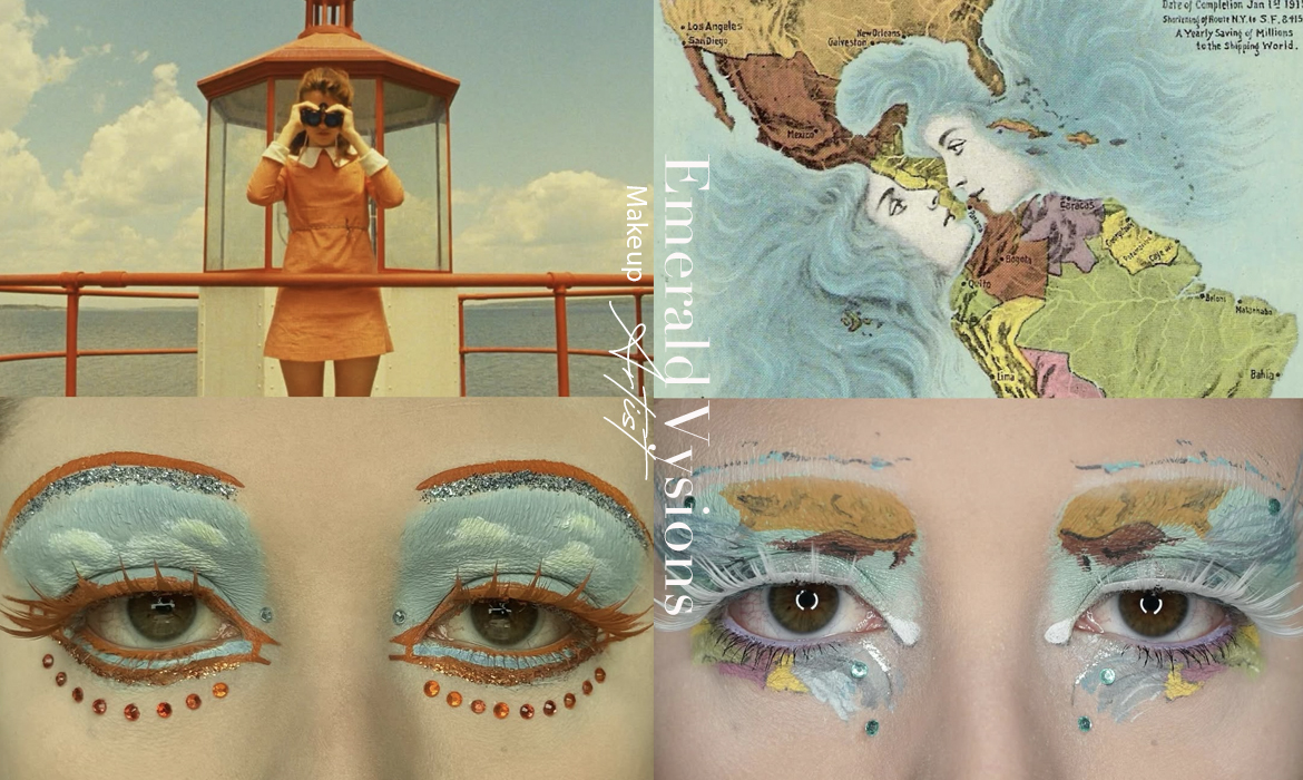 編輯自己私心最愛 Wes Anderson 的《Moonrise Kingdom》(月昇冒險王國 / 小學雞私奔記)這個妝容,橘色欄杆幻化為強烈線條感的眉與眼線,襯托著藍天白雲眼影,下眼瞼那一抹藍更是神來之筆,精準呼應欄杆間隙中透出的藍天,Emerald Vysions 不僅畫出了 Wes Anderson 標誌性的復古配色,更保留了對稱與精緻感,重現電影那種怪誕又魔幻的美學。